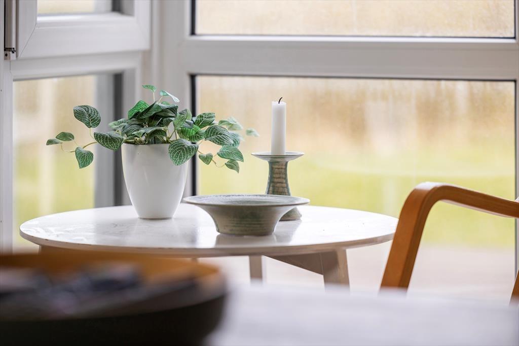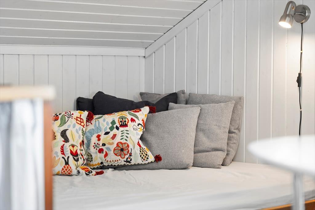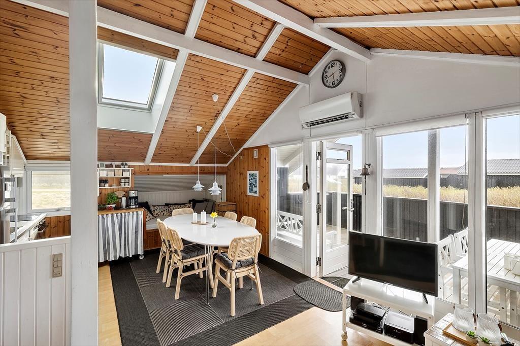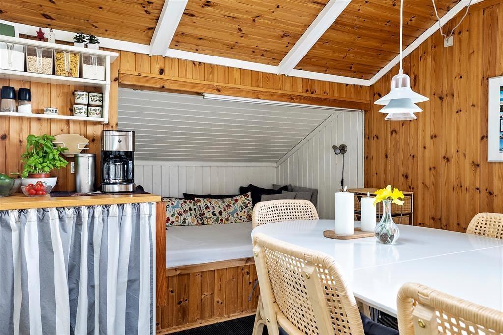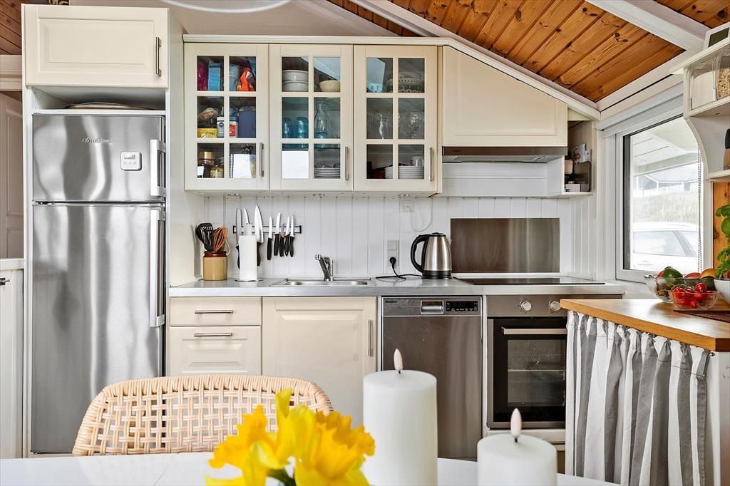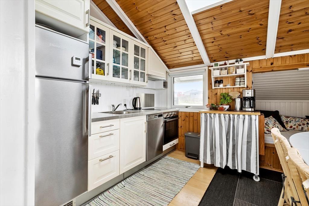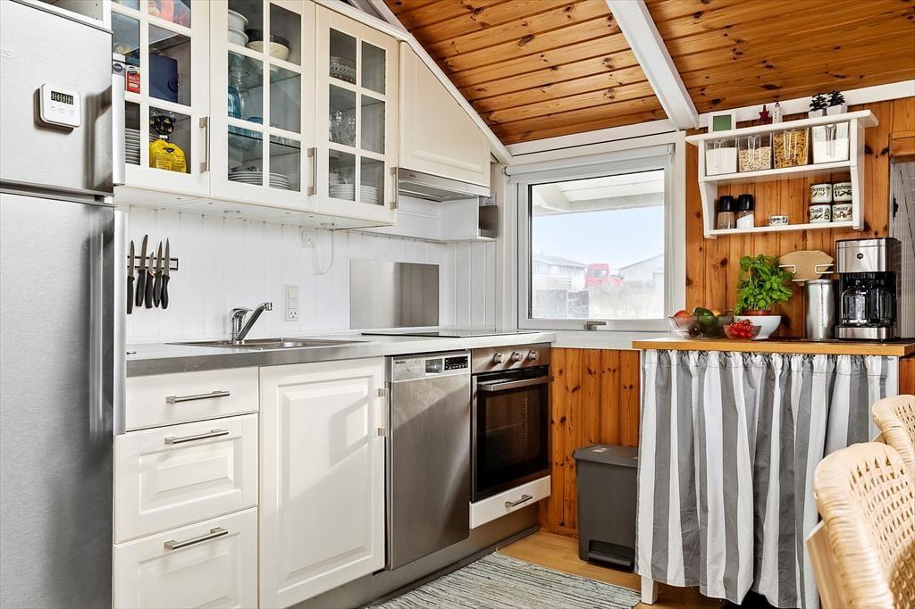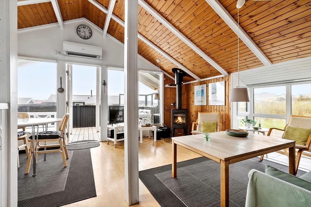 Das Ferienhaus bietet eine warme und einladende Atmosphäre mit hellen, klassisch eingerichteten Möbeln und einer Decke bis zum First, die für ein großzügiges Raumgefühl sorgt. Im Wohnzimmer gibt es einen gemütlichen Kaminofen, der an kühlen Abenden für Wohlfühlatmosphäre sorgt, und vom Wohnzimmer aus hast du Zugang zu einem kleinen Wintergarten, wo du entspannen und die Aussicht auf die umgebende Natur genießen kannst. Die gut ausgestattete Küche bietet die Möglichkeit, zusammen zu kochen, während du die Aussicht auf die Natur durch die großen Fenster genießt, die die Räume mit Licht durchfluten. Das Ferienhaus verfügt über zwei gemütliche Schlafzimmer, die für einen erholsamen Schlaf sorgen, und das 2019 renovierte Badezimmer erscheint hell und modern.