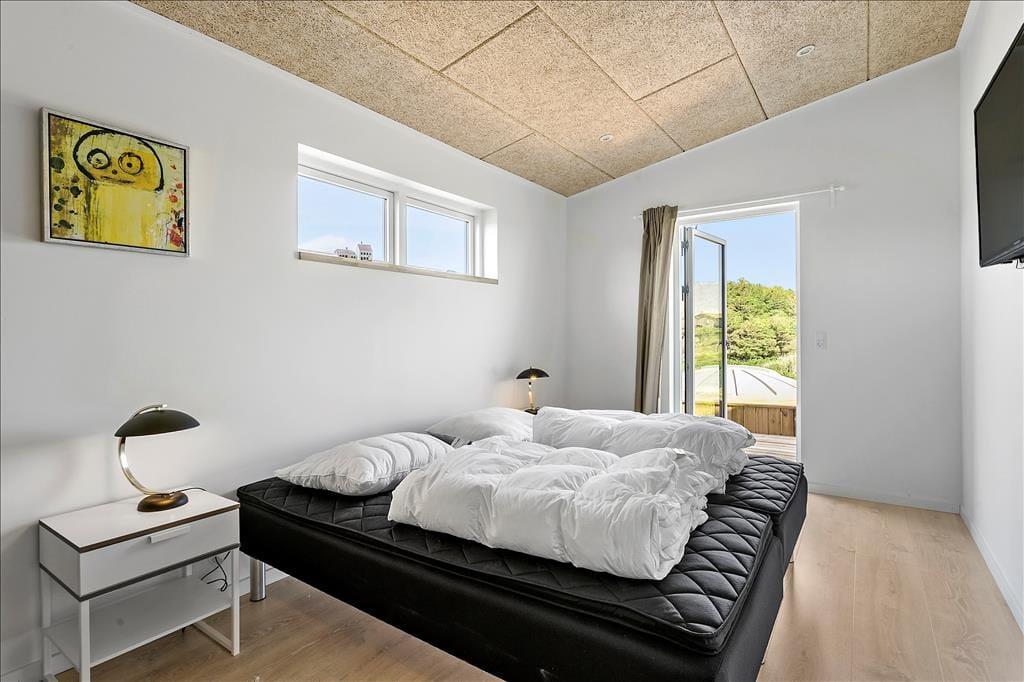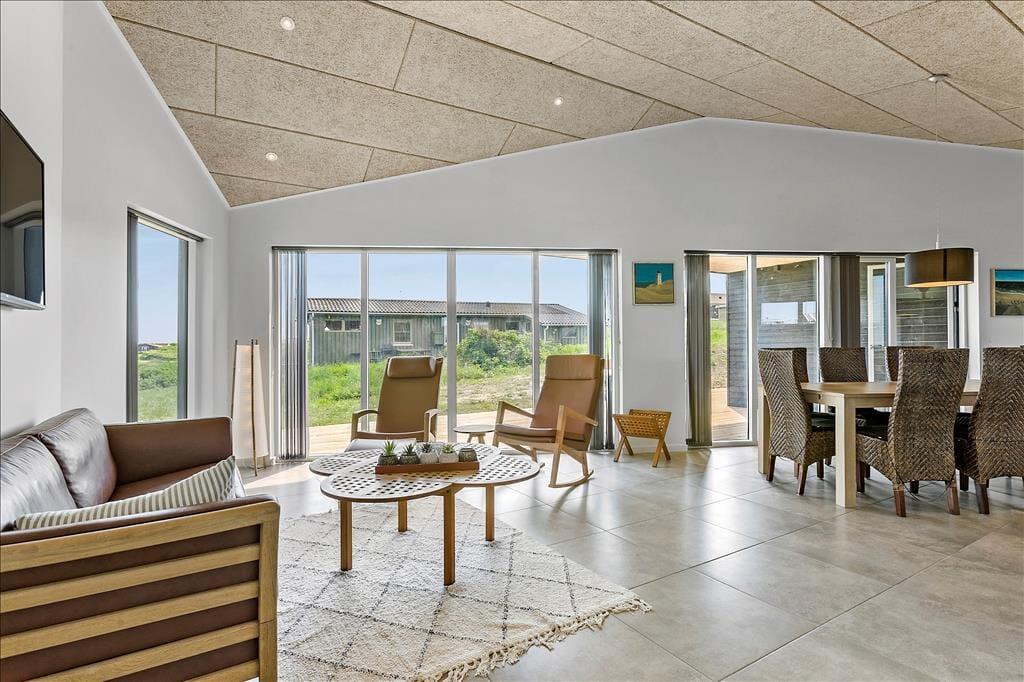 Das Haus ist in eleganter und stilvoller Architektur erbaut, die sich harmonisch in die malerische Landschaft einfügt. Schon beim Betreten merkt man, dass auf jedes Detail geachtet wurde, und große Fensterflächen nach Süden sorgen sowohl für viel natürliches Licht als auch für einen schönen Blick auf die Umgebung. Das Zusammensein im Urlaub wird in dem großen Wohnzimmer mit hohen Decken, integriertem Küchenbereich und Licht, das aus mehreren Himmelsrichtungen einfällt, zu einem echten Genuss. Von hier aus gibt es auch einen Zugang zur südlich gelegenen Terrasse. Das Haus verfügt über drei Schlafzimmer, von denen zwei einen direkten Zugang zur östlich gelegenen Morgenterrasse haben – es ist ein großes Vergnügen, direkt aus dem Bett zu steigen und die ersten Sonnenstrahlen des Tages zu genießen. Schließlich gibt es im Ferienhaus auch ein Badezimmer und ein Gäste-WC.