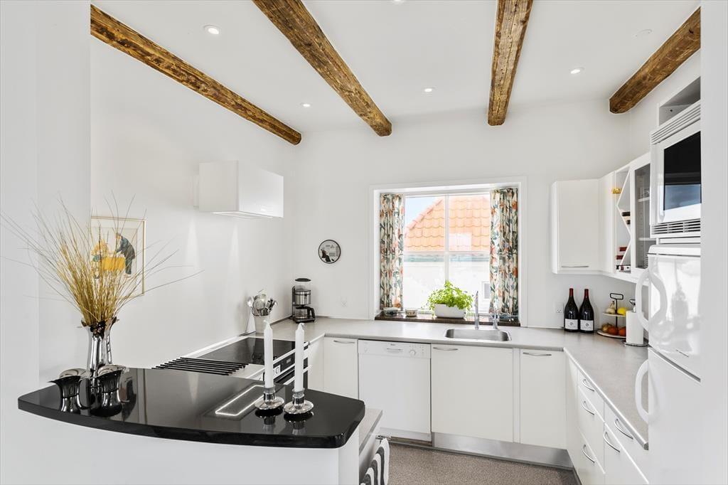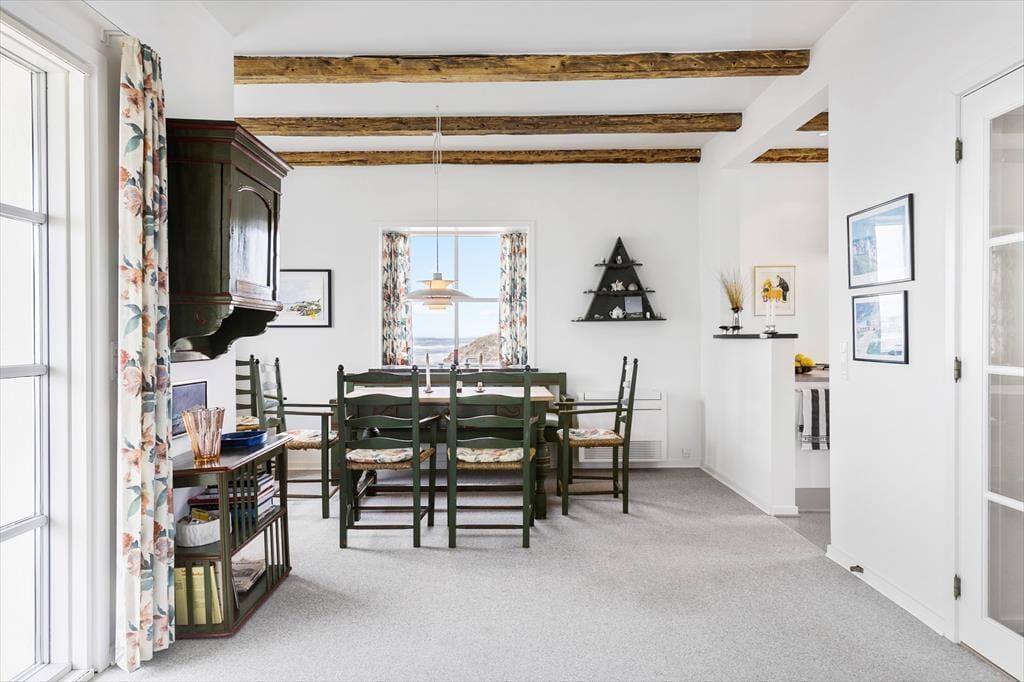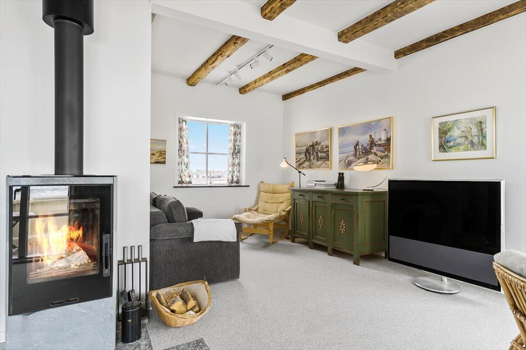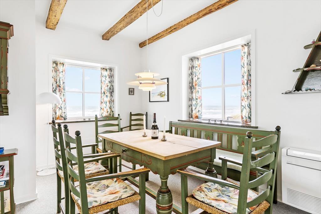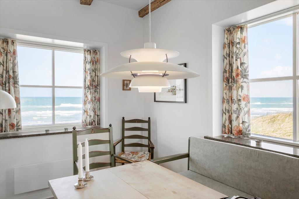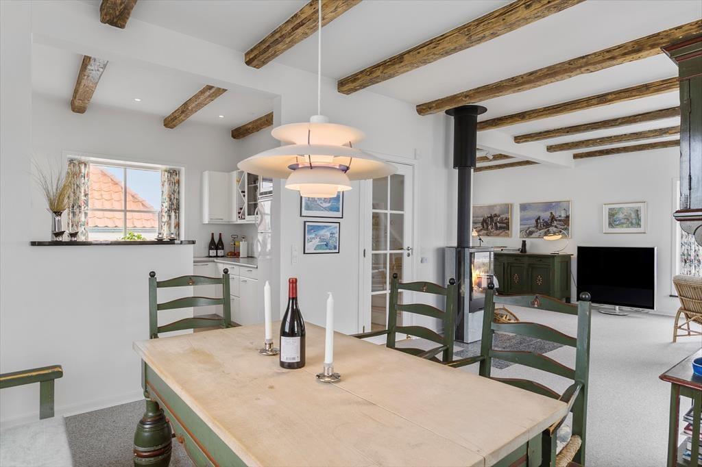 Wie Harald Fischer habt auch ihr jetzt die Möglichkeit, im Strandbohus Urlaub zu machen. Das Haus hat sein wunderschönes Äußeres mit halbwalmigem Ziegeldach und weiß verputzter Fassade bewahrt. Innen wurde das Sommerhaus modernisiert, sodass ihr euch auf komfortable Tage freuen könnt – mit allem, von schnellem WLAN und Apple TV bis hin zu bequemen Betten, einem Kaminofen und einer modernen Küche mit einem neuen Kühl-Gefrierschrank von 2024, Quooker und Geschirrspüler. Ein Teil des Mobiliars ist jedoch eher klassisch, zum Beispiel der charmante Esstisch mit den dazugehörigen Holzstühlen. Hier könnt ihr die Geschichte spüren, während ihr ein gutes Essen mit Blick auf die Nordsee genießt. Küche und Essbereich sind offen mit dem Wohnzimmer verbunden, während der Keller einen Hauswirtschaftsraum und ein Badezimmer mit Sauna bietet. Ein weiteres Badezimmer befindet sich im ersten Stock, wo ihr auch ein kleineres und zwei größere Schlafzimmer findet. Insgesamt ist es eine geräumige, helle und atmosphärische Ferienunterkunft für vier Personen.