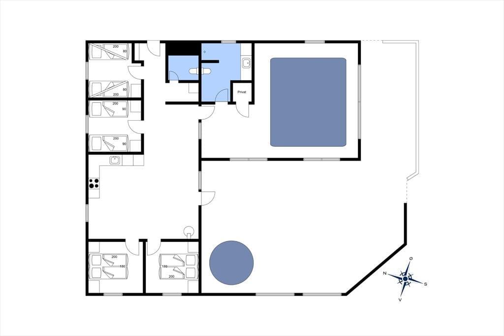 Das moderne Ferienhaus ist mit Fokus auf Licht und Großzügigkeit gestaltet. Der offene Grundriss mit integrierter Küche und Wohnzimmer schafft einen natürlichen Treffpunkt für die Familie. In der gut ausgestatteten Küche kannst du leckere Gerichte zaubern und gleichzeitig Teil der Gespräche am Esstisch bleiben. Das Wohnzimmer ist ein gemütlicher Rückzugsort mit bequemen Möbeln, in dem du nach einem langen Tag die Wärme des Holzofens genießen kannst. Das Haus verfügt über vier helle Schlafzimmer, in denen bis zu 10 Personen bequem übernachten können, und das großzügige Badezimmer sorgt für Komfort und Ruhe. Für noch mehr Wohlbefinden kannst du direkt in den privaten Pool springen oder ein entspannendes Bad im Badezuber auf der Terrasse nehmen.