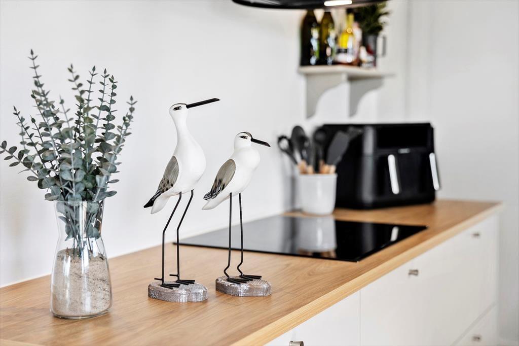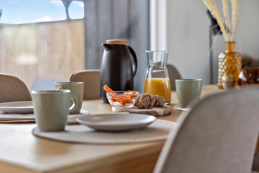 Im Inneren empfängt dich eine helle und angenehme Atmosphäre mit einer Einrichtung, die auf einen entspannten Urlaub in guter Gesellschaft ausgelegt ist. Der Wohnbereich bildet den natürlichen Mittelpunkt des Hauses mit Küche, Essplatz und Wohnzimmer in einem Raum – so könnt ihr gemeinsam kochen, es euch gemütlich machen und entspannen, ohne getrennt zu sein. Die Räume wirken großzügig – im übertragenen wie im wörtlichen Sinn – und große Fensterflächen lassen viel Licht herein und bieten einen schönen Blick auf die grüne Umgebung. Die Küche ist funktional und gut ausgestattet, und das Wohnzimmer lädt sowohl zum Zusammensein als auch zum Rückzug ein – sei es mit einem guten Buch, einem Brettspiel oder einem Film auf dem Bildschirm. Wenn die Abenteuer des Tages vorbei sind, sind praktische Einrichtungen wie Waschmaschine und Trockner willkommen – ebenso wie der Rückzug in ruhige Schlafzimmer, um neue Energie für den nächsten Urlaubstag zu tanken.
