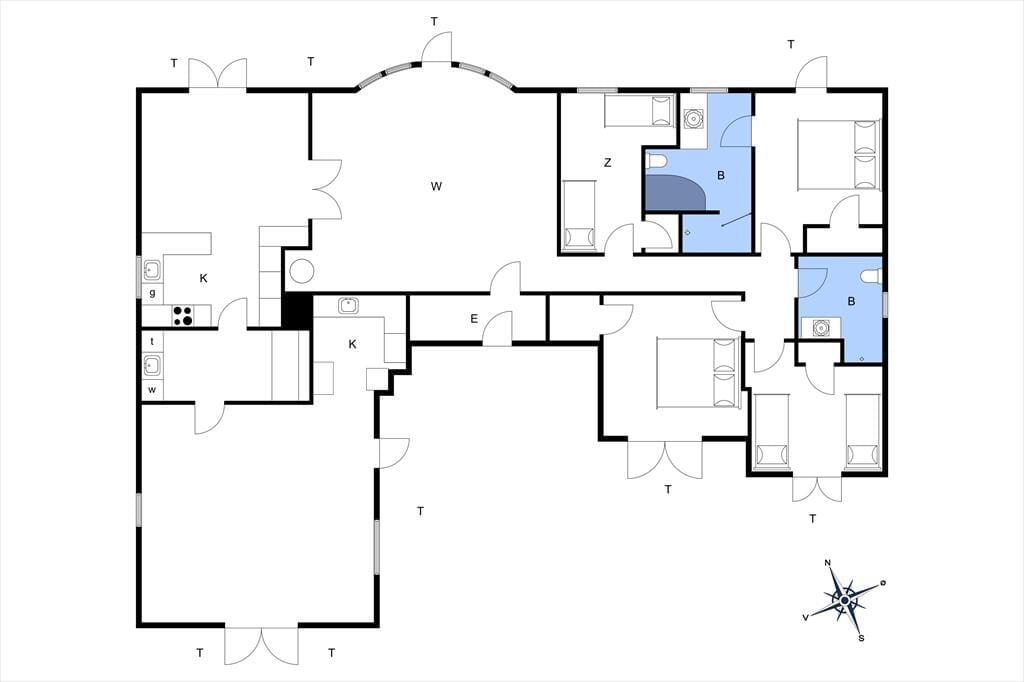 Exklusives Ferienhaus mit Platz für 8 Personen. Das Haus bietet einen großzügigen Eingangsbereich und vier komfortable Schlafzimmer – zwei mit Doppelbetten und zwei mit je zwei Einzelbetten.