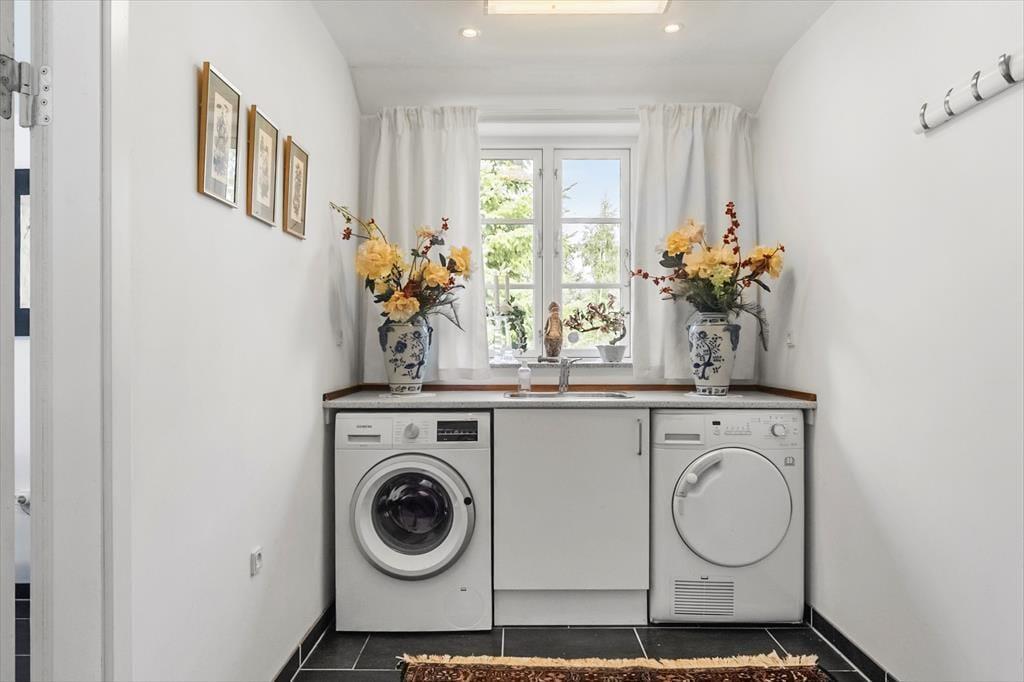 Neben der Küche befindet sich ein praktischer Hauswirtschaftsraum mit Waschmaschine und Trockner.