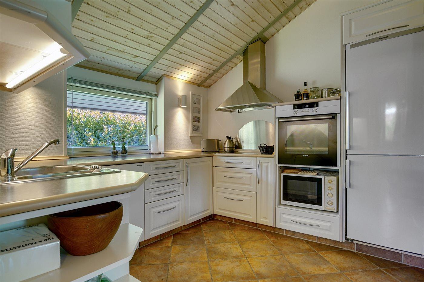 Die Küche ist mit Kühlschrank ausgestattet. Außerdem gibt es 4 Keramik-Kochfelder, Umluftofen, Mikrowelle sowie Geschirrspüler.