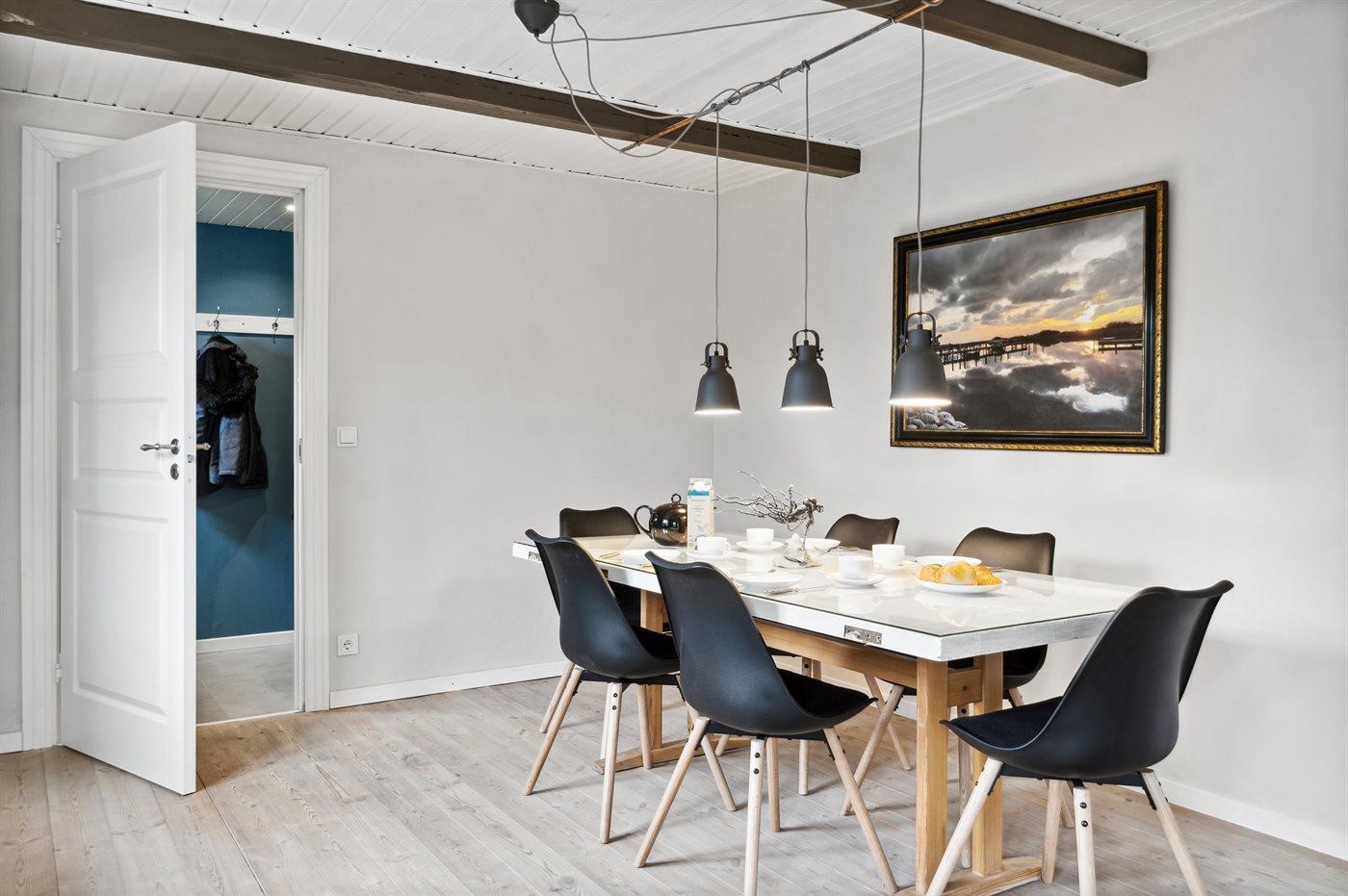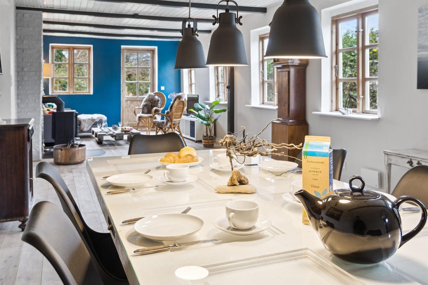 Das Wohnzimmer ist großzügig und hell. Der offene Raum ist in einem Essbereich und in einer Hygge-Ecke mit TV und Kamin für kalte Tage aufgeteilt. Zwischen den beiden Bereichen gibt’s noch viel Platz für die Yoga-Praxis o.a.