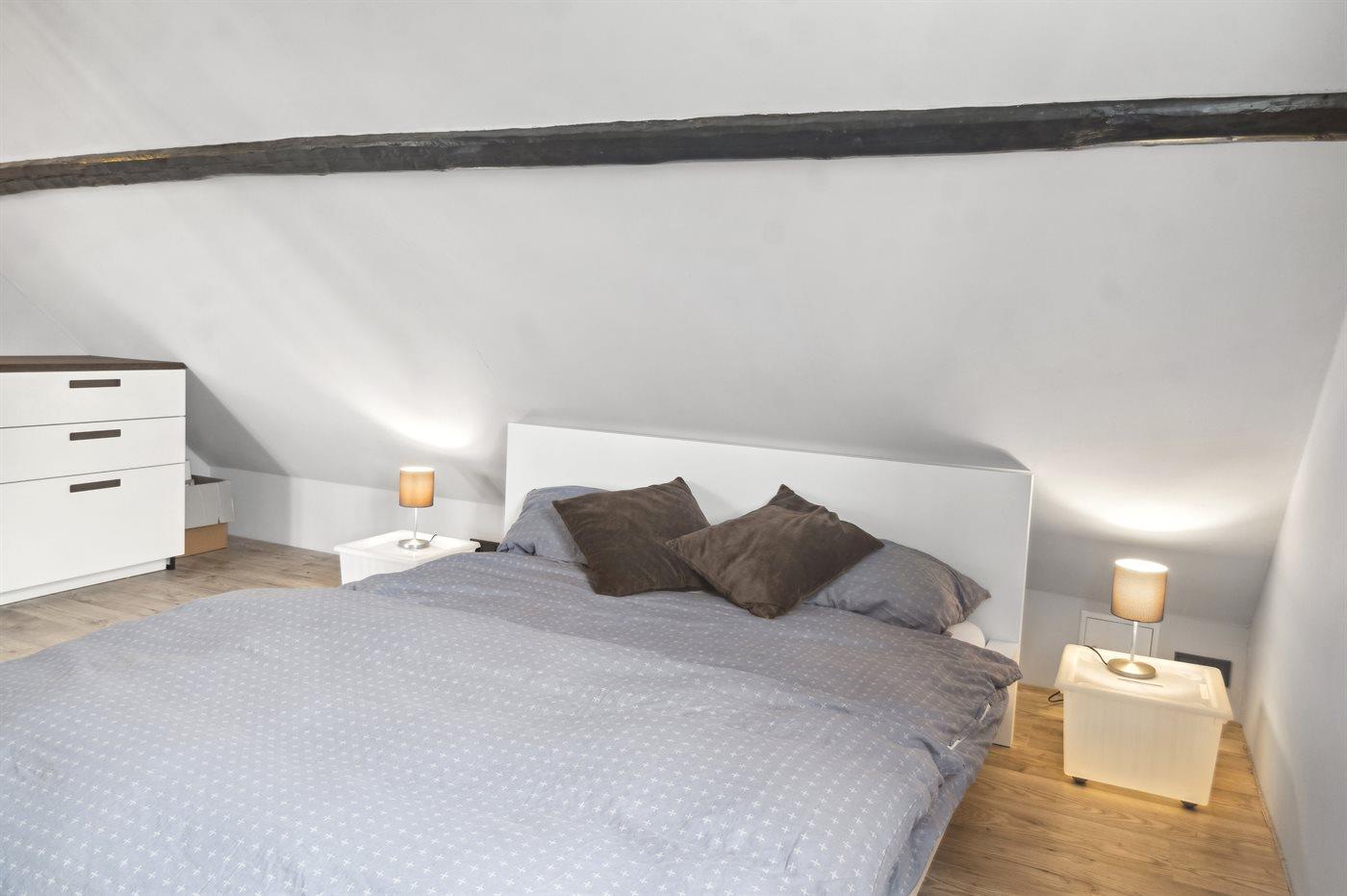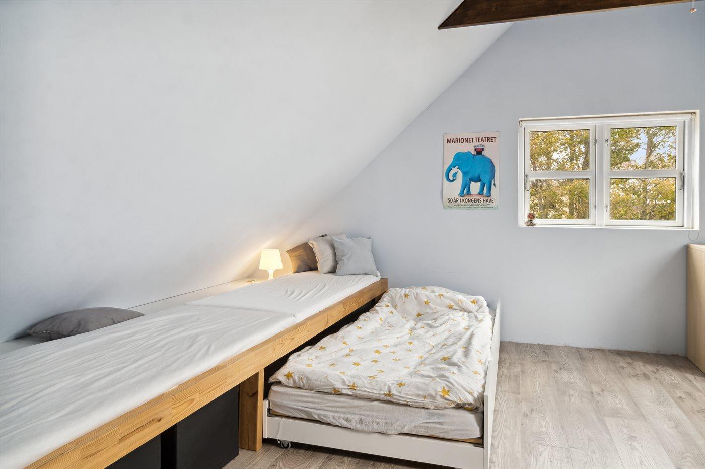 Die Schlafplätze verteilen sich auf 3 Schlafräume mit zwei Doppelbetten und drei einzelnen (Kinder-)Betten. Das obere Schlafzimmer ist offen, ohne Tür gestaltet, das Bett jedoch durch die Bauweise von störenden Blicken abgeschirmt.