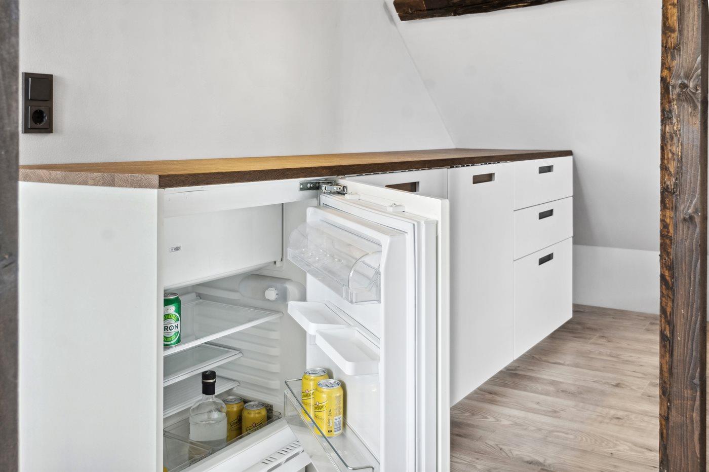 Im Obergeschoss befindet sich ein weiterer, kleiner Kühlschrank für Imbisse und kalte Getränke an lustigen Spielabenden. Hier sind alle Räume und das Badezimmer außerdem mit Fußboden-Heizung versehen.