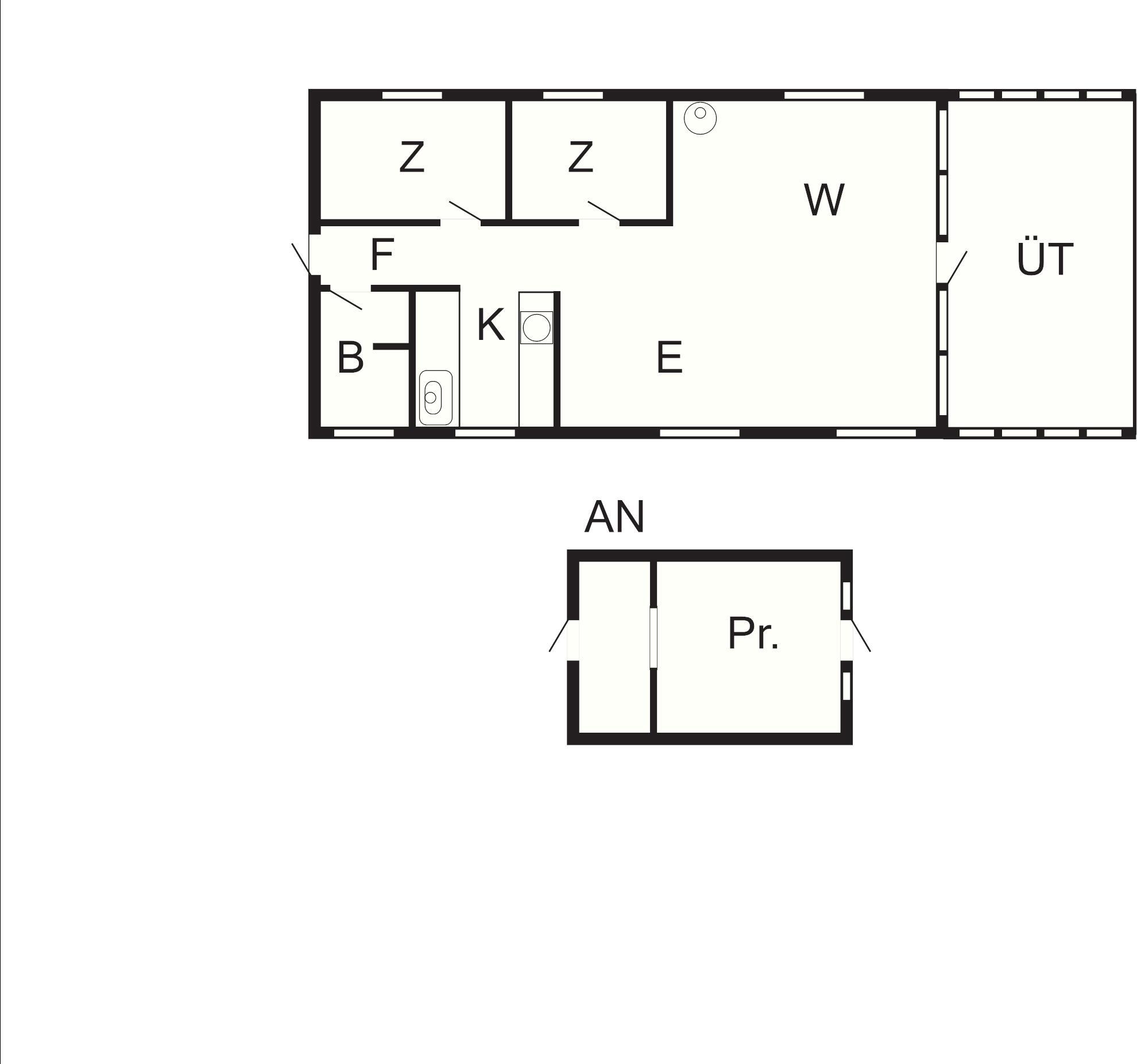 Das Haus besticht durch einen hellen und einladenden offenen Küchen- und Wohnbereich mit Dachschrägen und großen Fenstern, die den Blick auf das Wasser perfekt einrahmen. Die Küche ist komplett für das tägliche Kochen ausgestattet, während der Wohnbereich einen gemütlichen Platz zum gemeinsamen Essen oder für ruhige Abende bietet. Es gibt zwei kleinere Schlafzimmer: eines mit zwei Einzelbetten und das andere mit einem Einzelbett und einem Etagenbett für zwei Schlafplätze. Das Badezimmer ist mit einer Dusche ausgestattet.