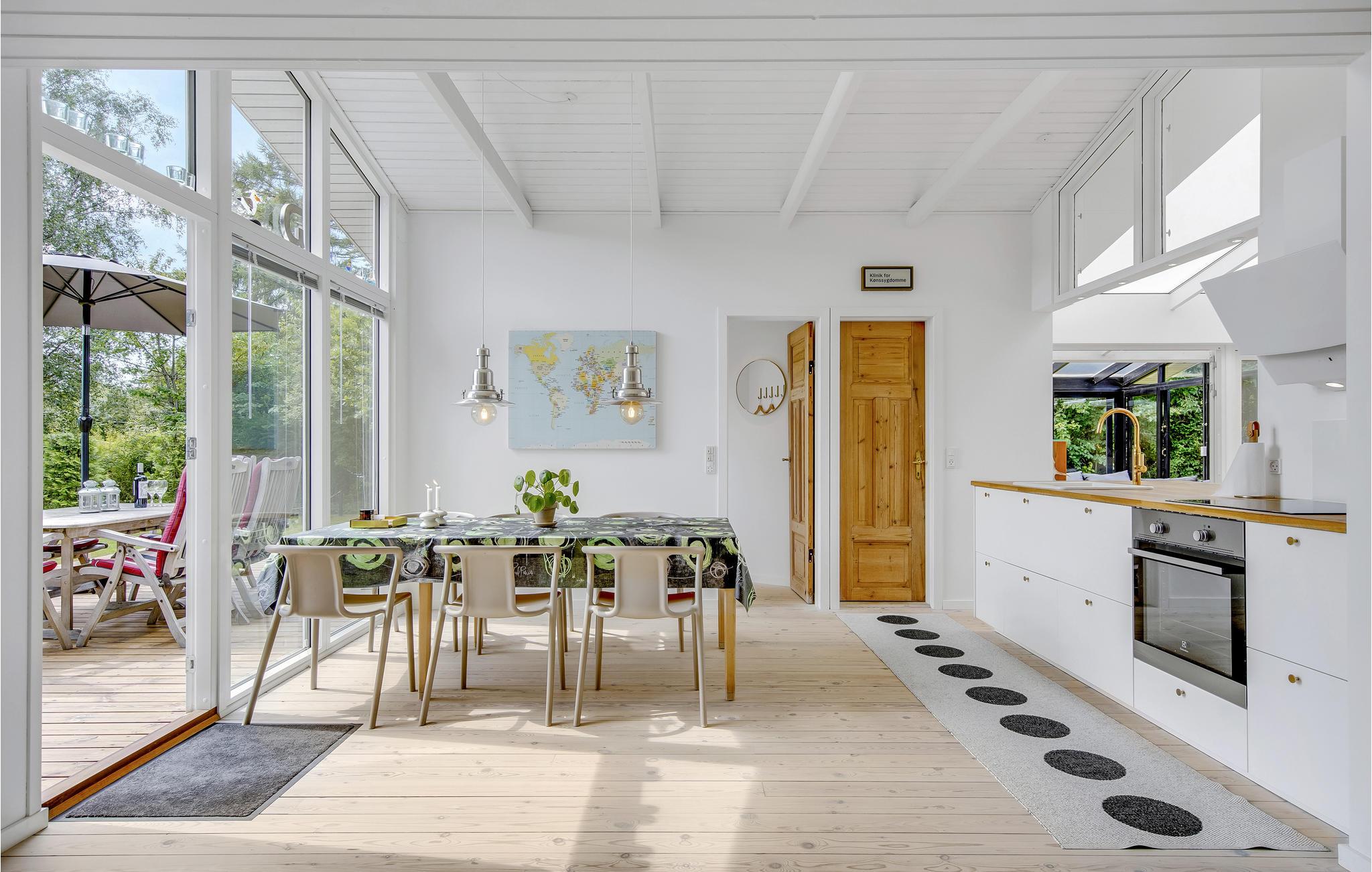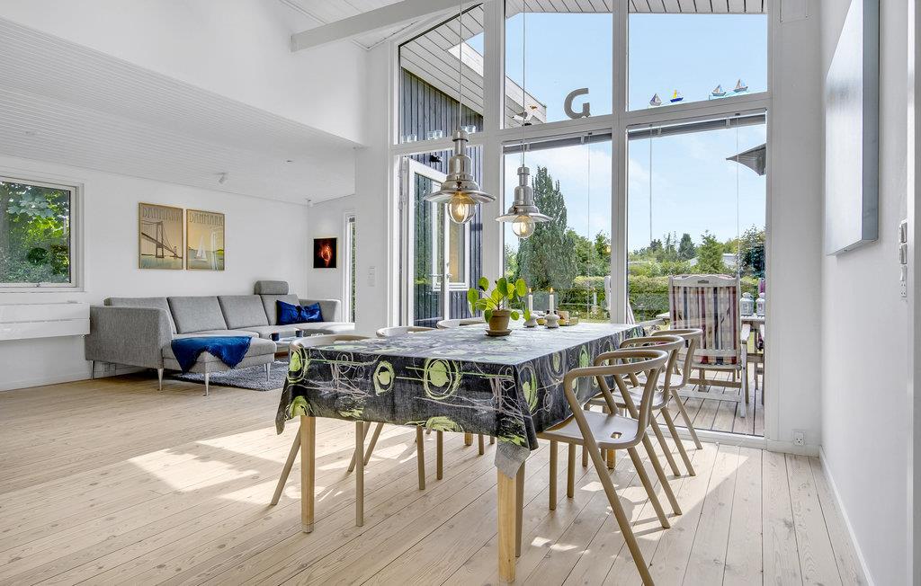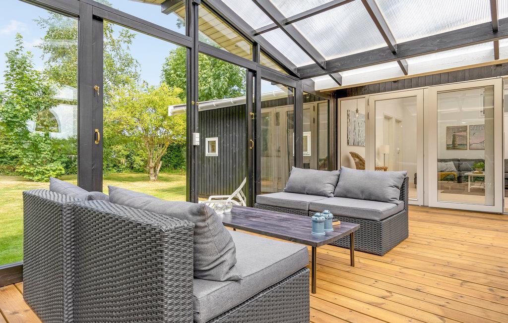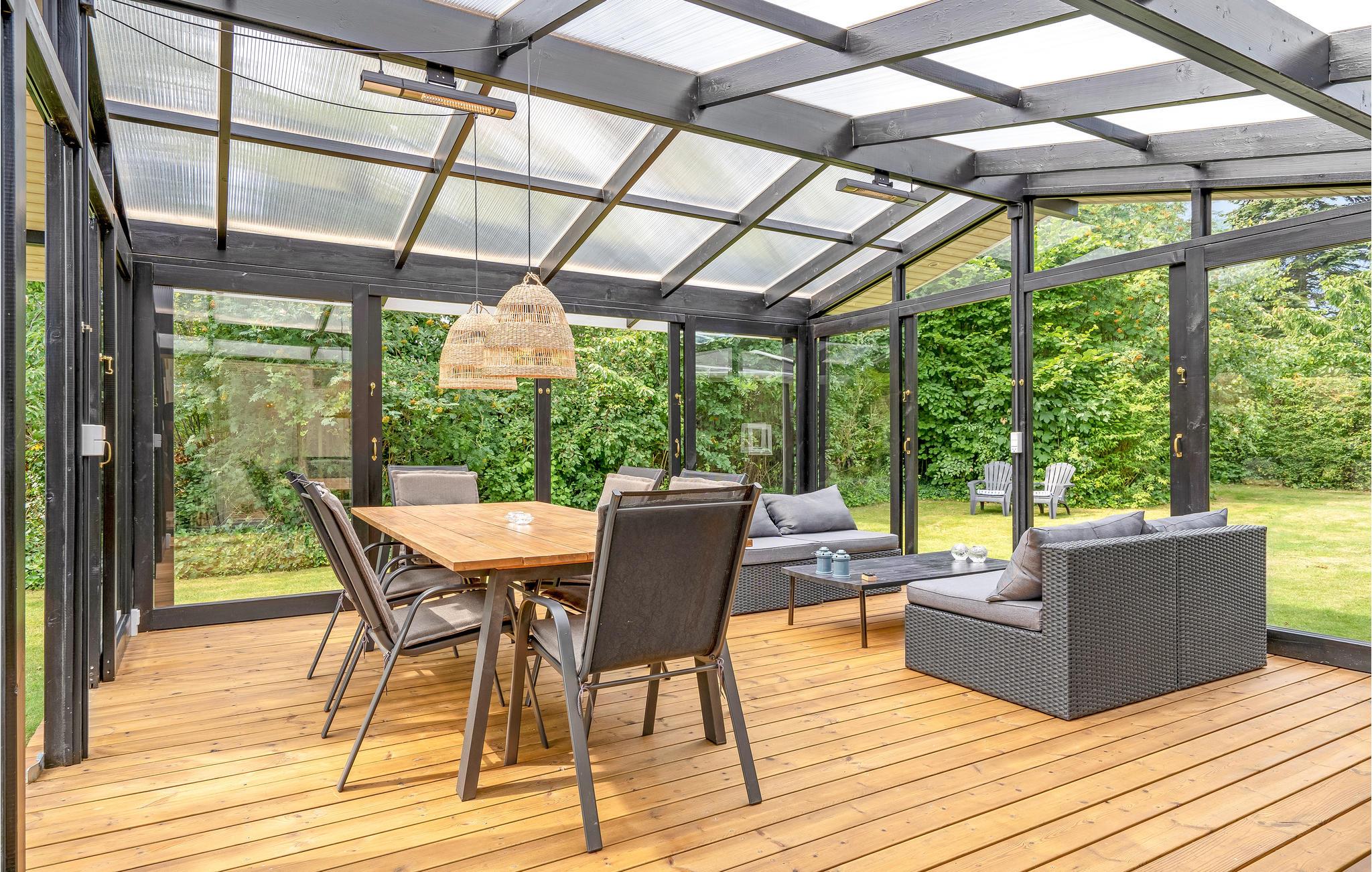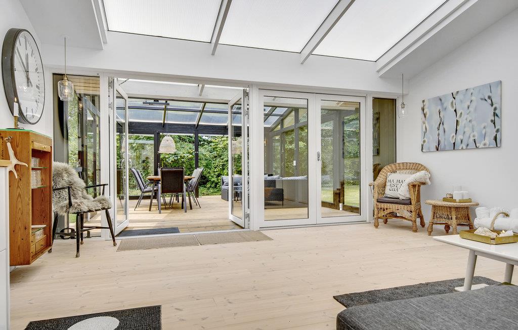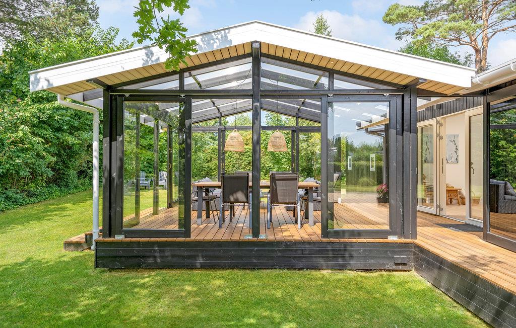Modernes Ferienhaus in Gilleleje mit Kamin, Wintergarten und Meerblick für entspannte Urlaubstage.