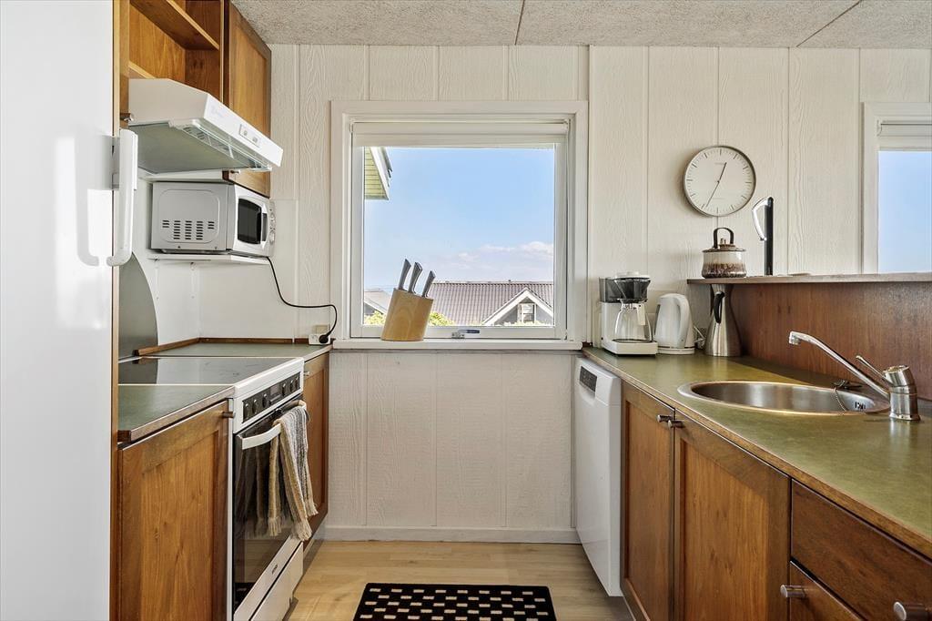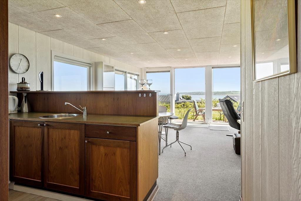 Wenn du das Ferienhaus betrittst, empfängt dich eine angenehme und helle Atmosphäre, bei der jedes Detail darauf ausgerichtet ist, den perfekten Rahmen für einen erholsamen Urlaub zu schaffen. Die hellen Farben und die schlichte, aber gemütliche Einrichtung verleihen dem Haus einen luftigen und freundlichen Charakter – es ist ganz leicht, sich hier zuhause zu fühlen. Küche und Wohnzimmer sind offen miteinander verbunden, sodass du viel Zeit mit deinen Liebsten verbringen kannst – beim gemeinsamen Kochen oder beim Spielen am Esstisch. Die großen Fenster lassen viel Licht herein und schenken dir einen herrlichen Blick über die hügelige Landschaft und den Fjord. Vom Wohnzimmer aus gelangst du direkt in den Garten und auf die Terrasse – hier gehen Innen- und Außenbereich nahtlos ineinander über. Es ist ein Ort für Ruhe und Nähe – egal ob du zu zweit, mit Kindern oder guten Freunden unterwegs bist.