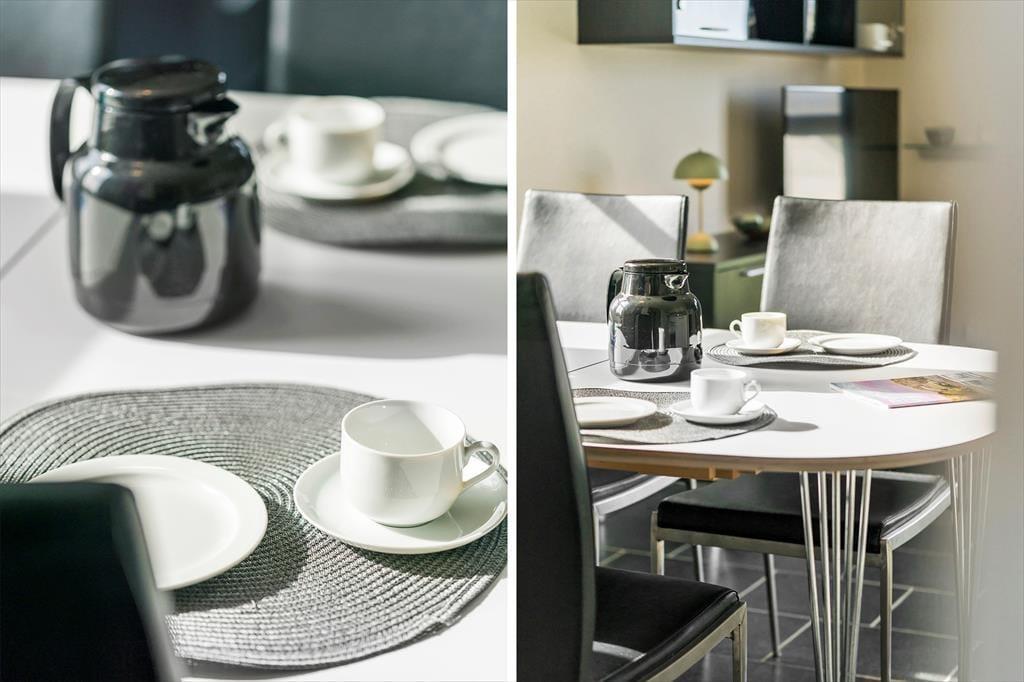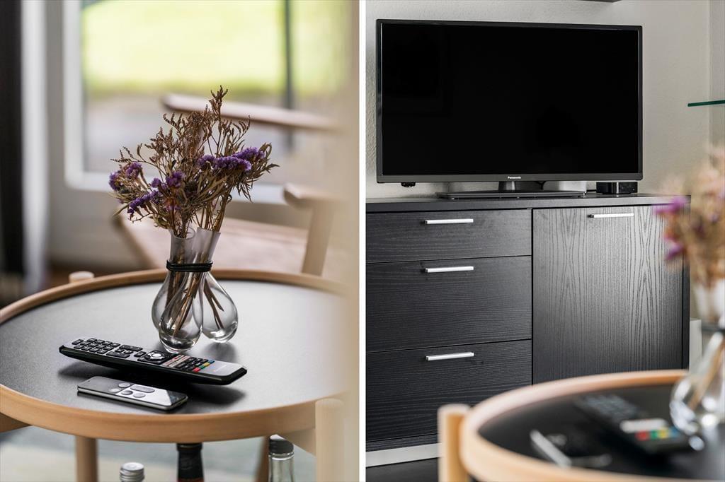 Die Einrichtung der Wohnung ist hell und einladend und schafft eine gemütliche Atmosphäre, in der du dich sofort wie zu Hause fühlen wirst. Große Fenster lassen viel Tageslicht herein und ermöglichen dir vom Wohnbereich aus einen wunderschönen Blick auf den Fjord – so hast du die Natur immer ganz nah bei dir. Hier ist Platz für Entspannung und geselliges Beisammensein. Der offene Küchen- und Wohnbereich bildet den idealen Rahmen für gemeinsame Mahlzeiten oder einen ruhigen Abend mit einem guten Buch oder Film. Ganz gleich, ob du einen Moment der Ruhe für dich allein genießen oder die Familie zu einer gemütlichen Runde versammeln möchtest – diese Wohnung erfüllt all deine Wünsche.
