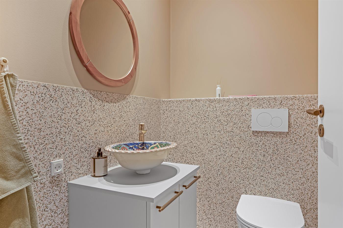 Es gibt 1 Badezimmer mit Duschnische und 2 Toiletten, davon 1 Gästetoilette. Fußbodenheizung in 1 Badezimmer. Fußbodenheizung in der Gästetoilette.