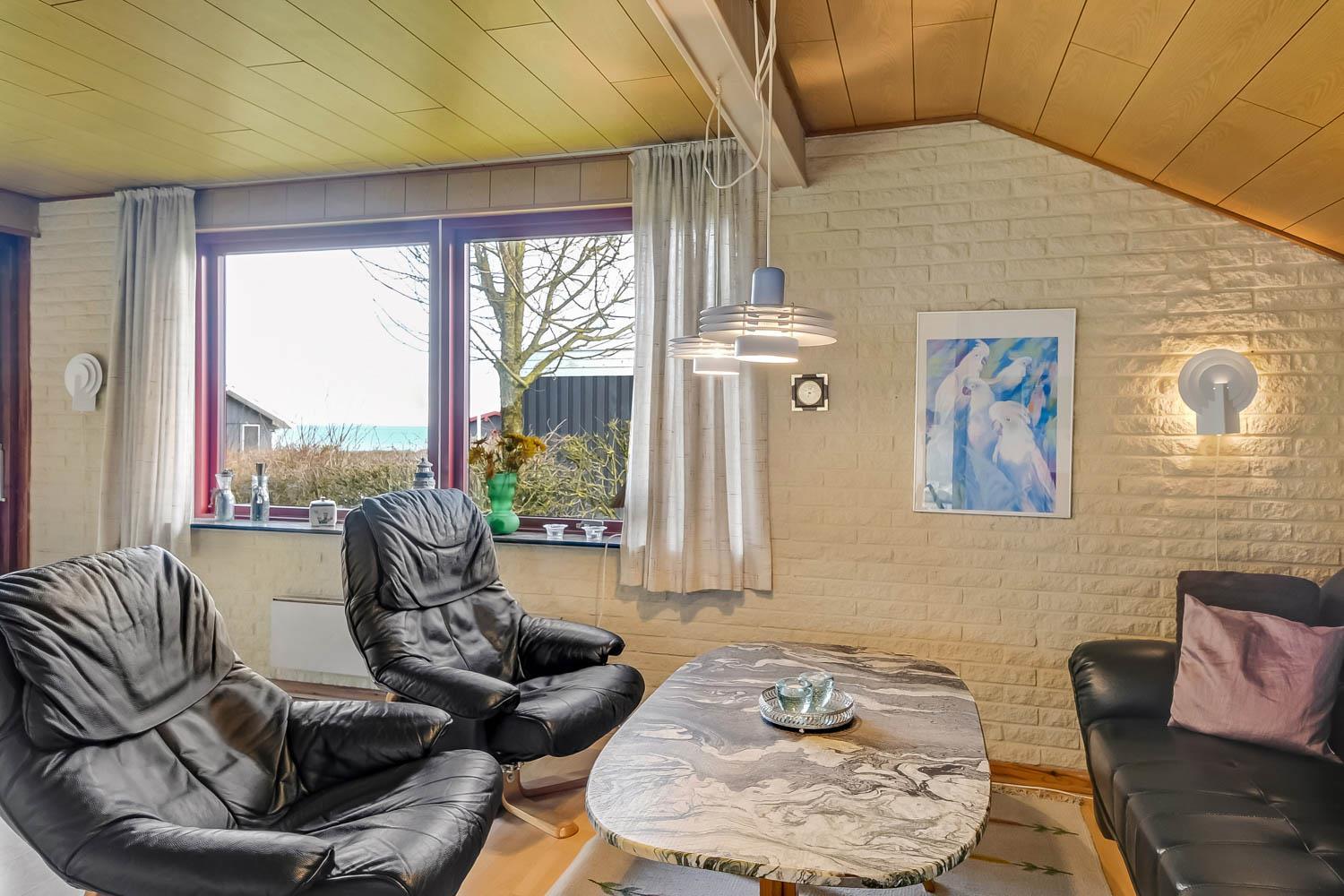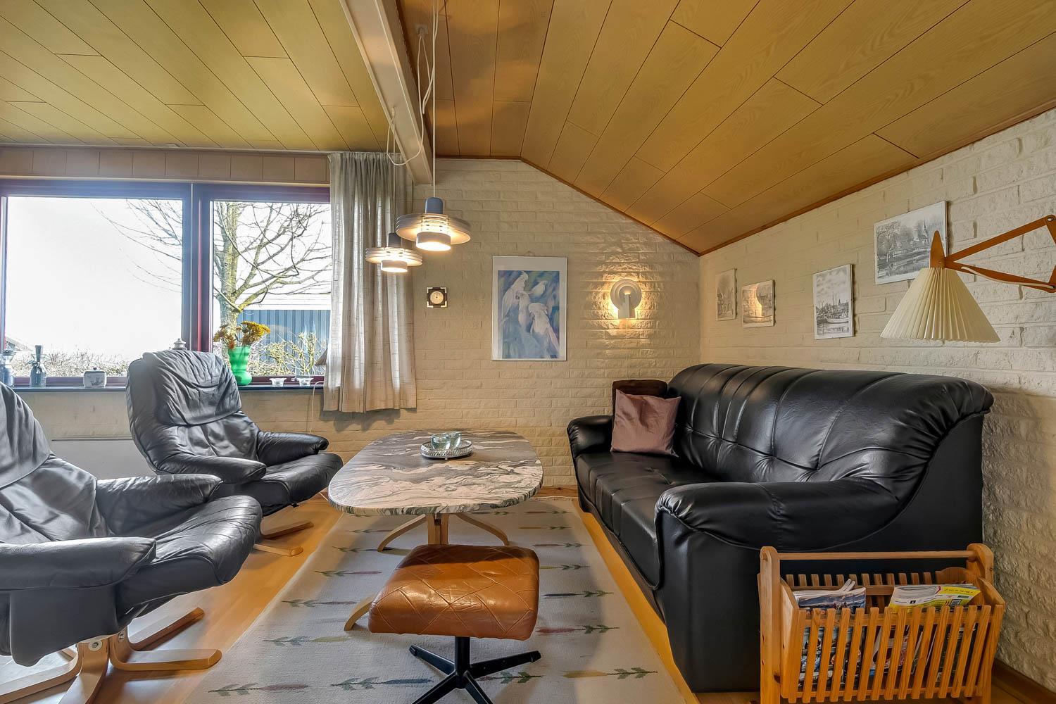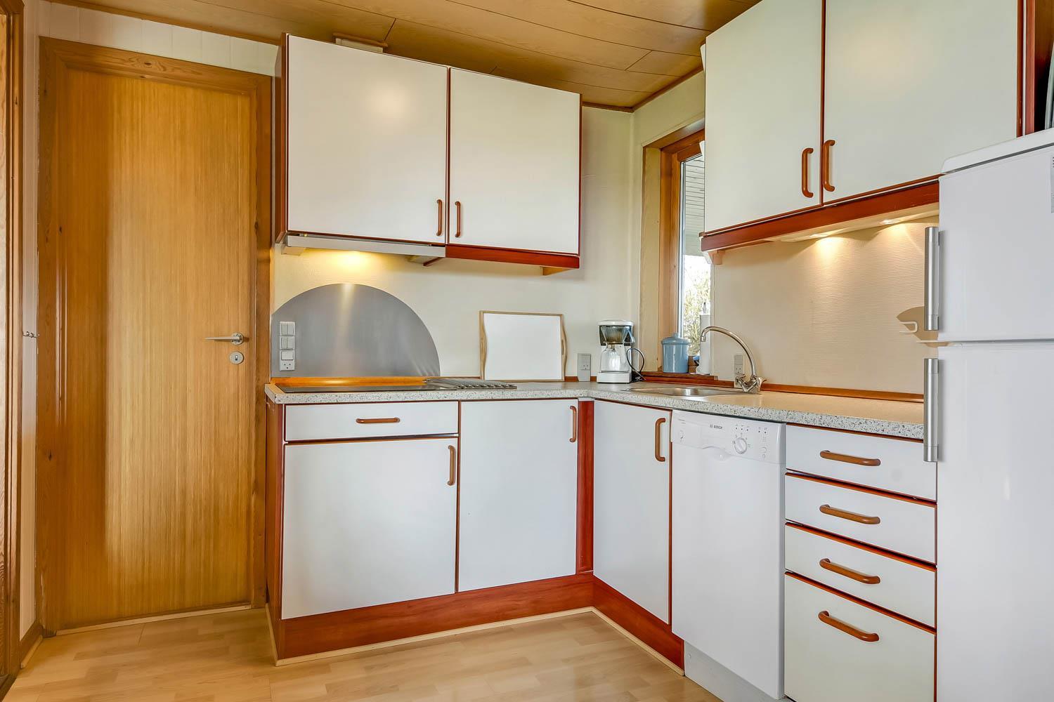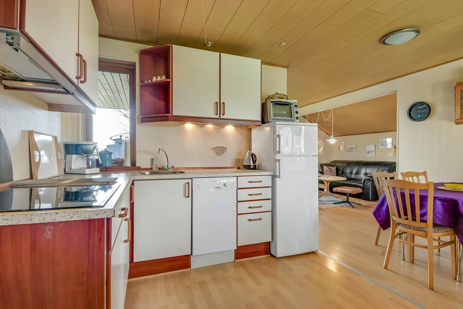 Das Ferienhaus ist einfach und funktional eingerichtet und verfügt über einen kombinierten Wohn- und Küchenbereich. Die Küche ist ausgestattet mit Glaskeramikkochfeld, Kühl-/Gefrierschrank, Dunstabzugshaube, Geschirrspüler und Mikrowelle. Der Wohnbereich bietet einen Fernseher mit dänischen und deutschen Programmen sowie Satellitenempfang (nur deutsche Sender) und einen Kaminofen.