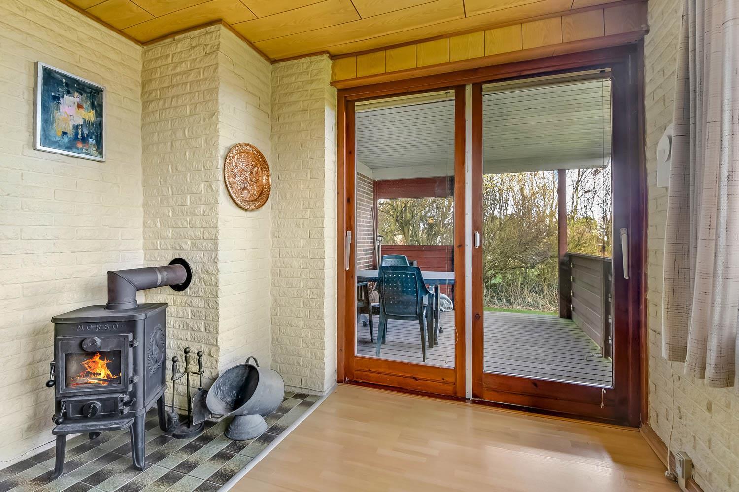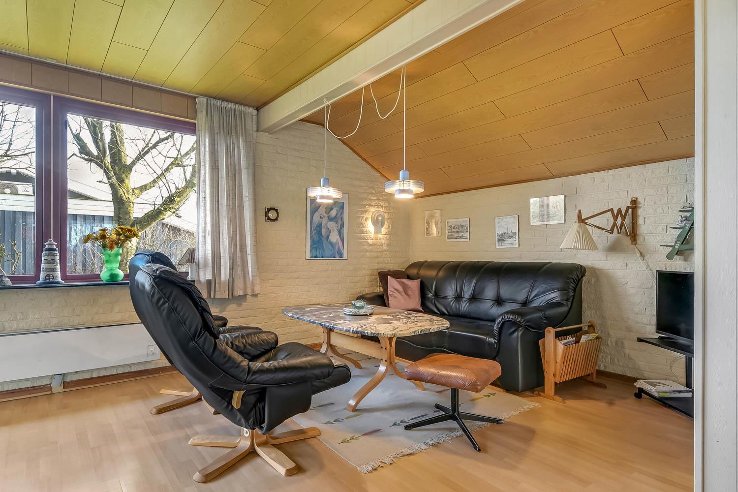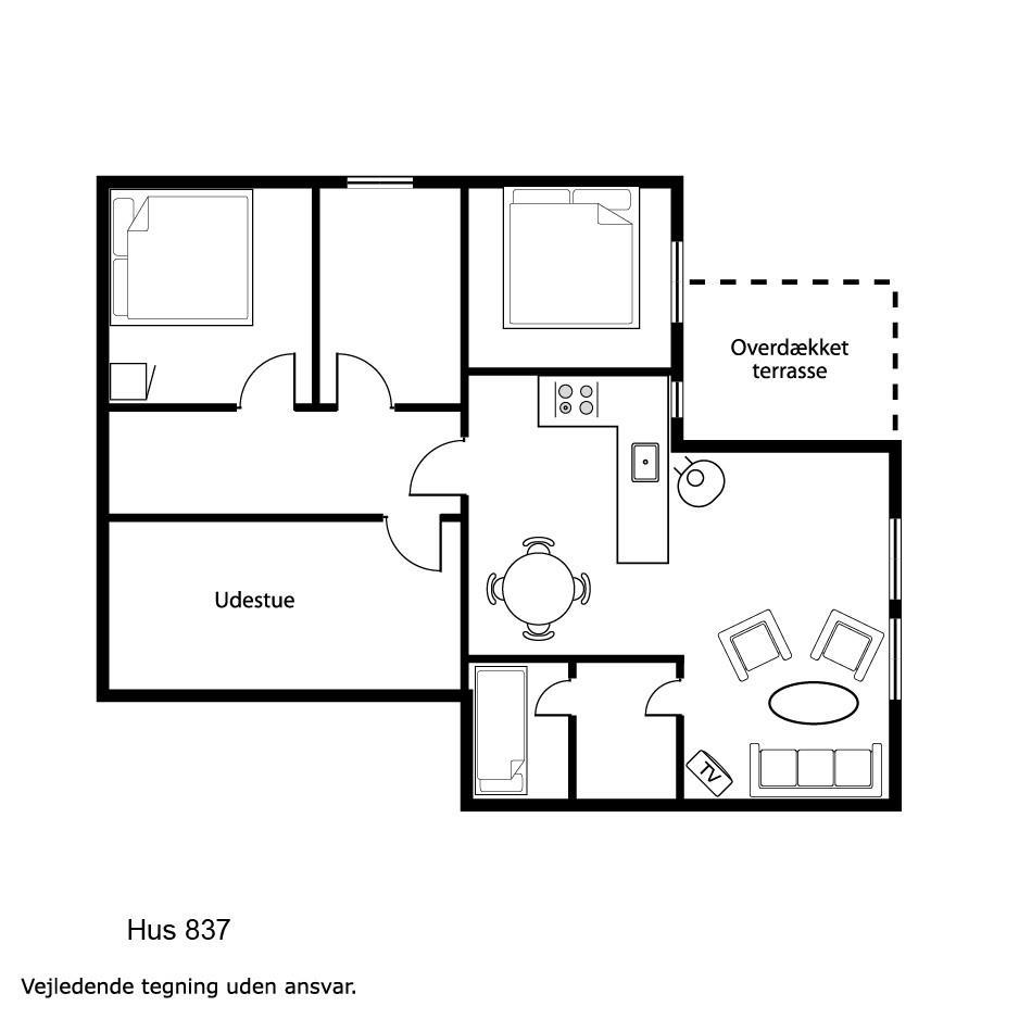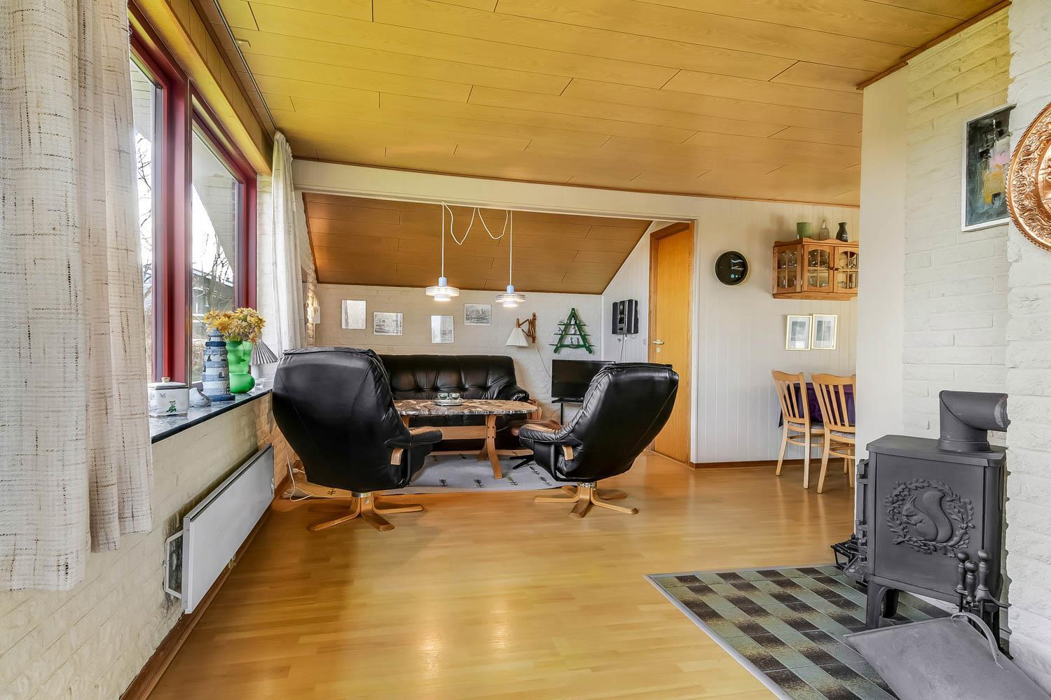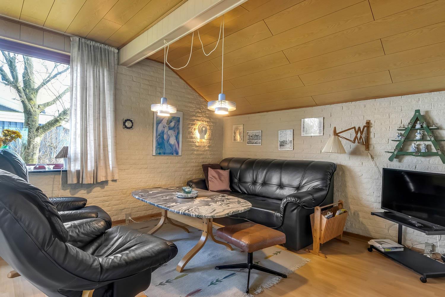 Das Ferienhaus ist einfach und funktional eingerichtet und verfügt über einen kombinierten Wohn- und Küchenbereich. Die Küche ist ausgestattet mit Glaskeramikkochfeld, Kühl-/Gefrierschrank, Dunstabzugshaube, Geschirrspüler und Mikrowelle. Der Wohnbereich bietet einen Fernseher mit dänischen und deutschen Programmen sowie Satellitenempfang (nur deutsche Sender) und einen Kaminofen.