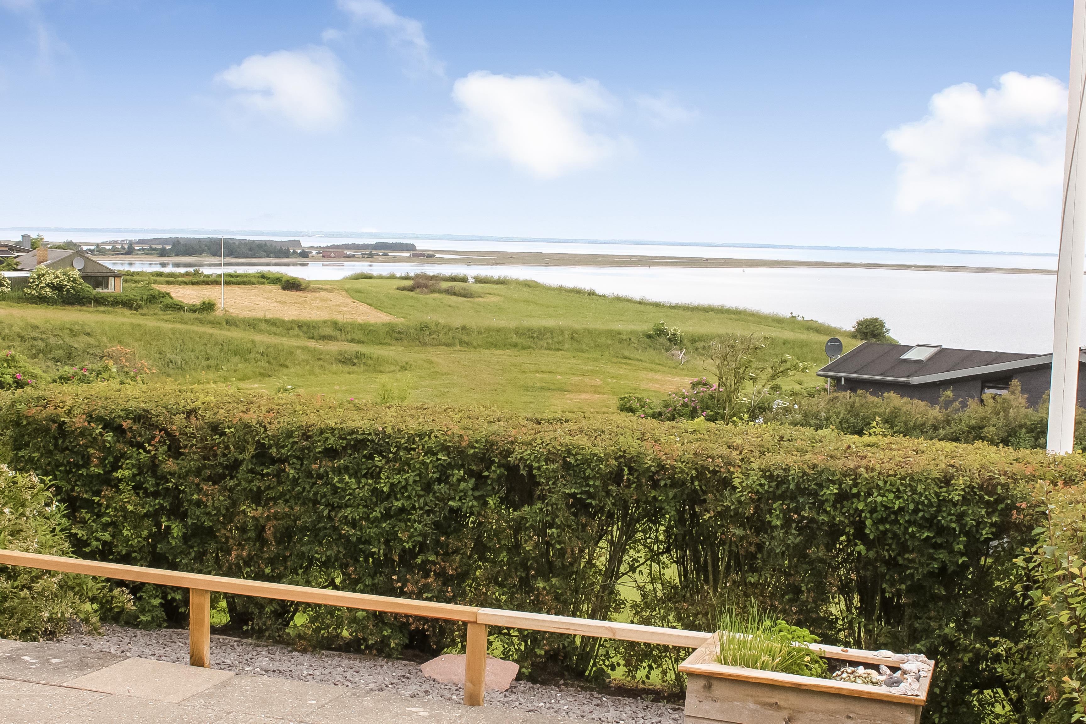 Dieses sehr gepflegte Ferienhaus aus Holz und Stein liegt auf einem schönen Grundstück mit Blick auf dem Limfjord und die Gegend. Freies WLAN.