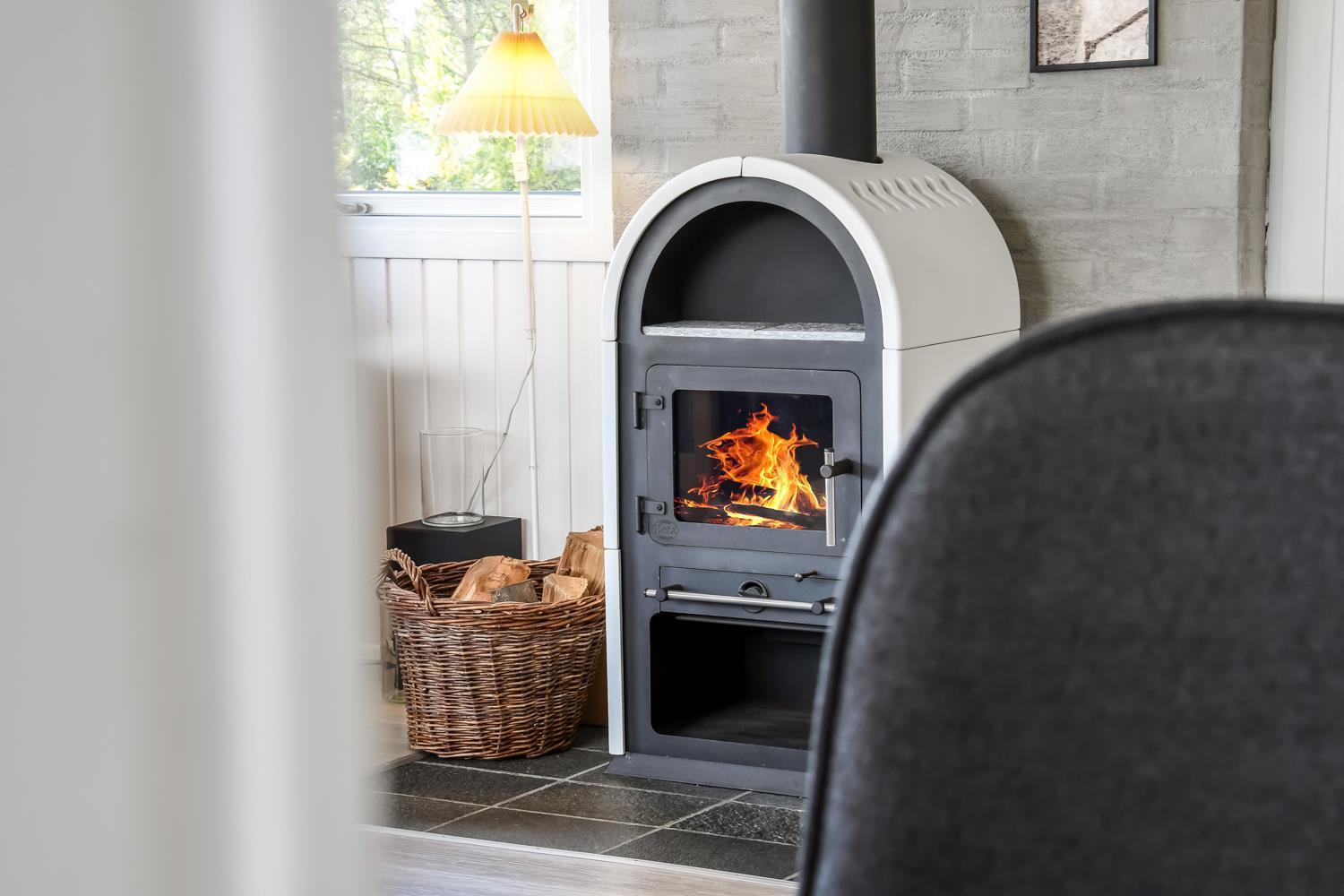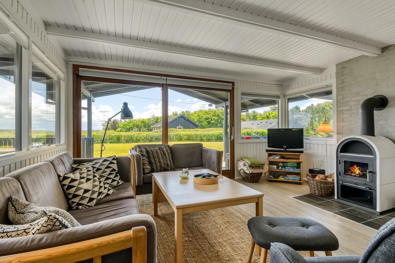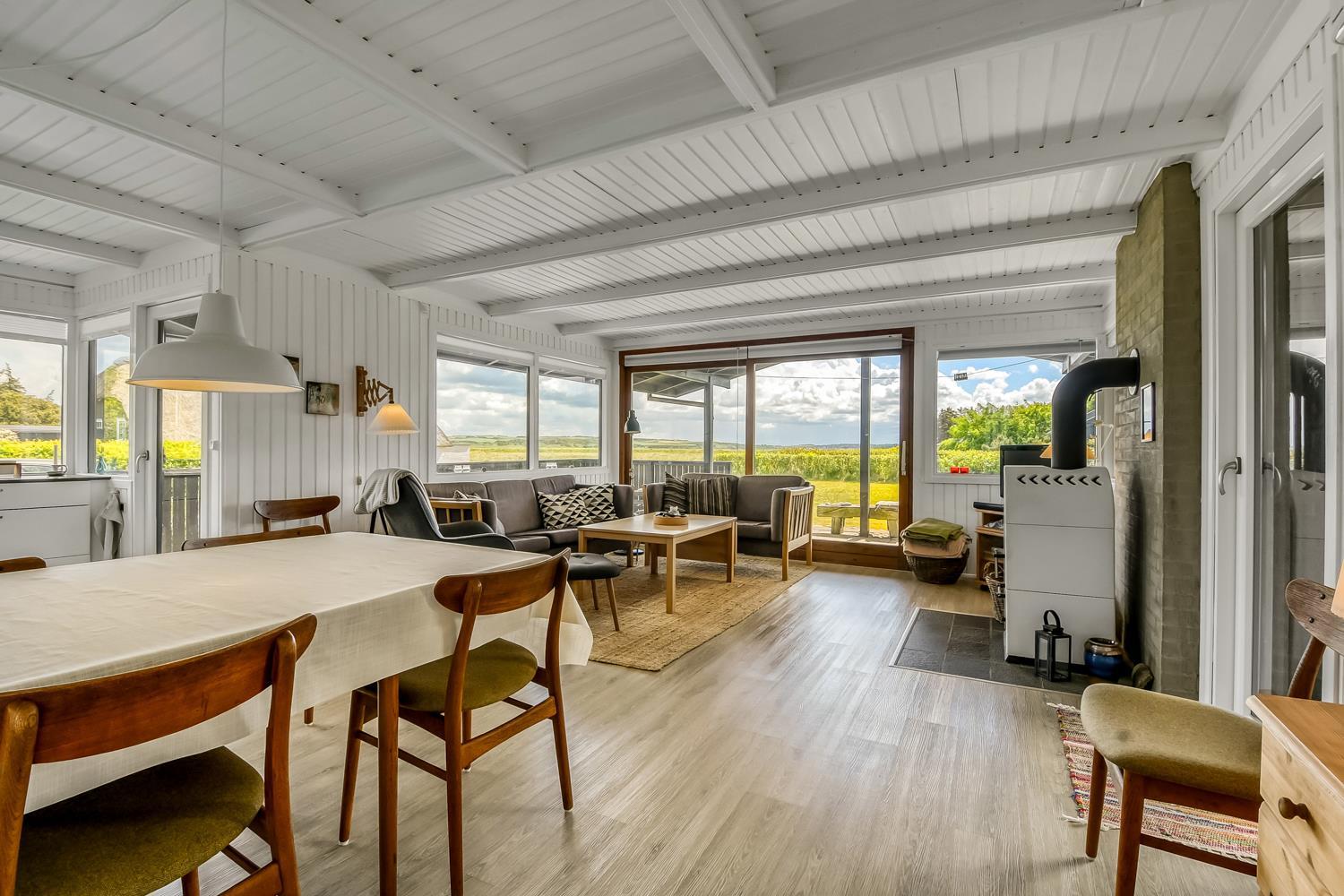 Das helle, kombinierte Wohn- und Esszimmer ist mit Polstermöbeln, einem Kaminofen für wohlige Wärme sowie einem Glasfaser-TV mit dänischen und deutschen Sendern ausgestattet – ideal zum Entspannen nach einem Tag in der Natur.