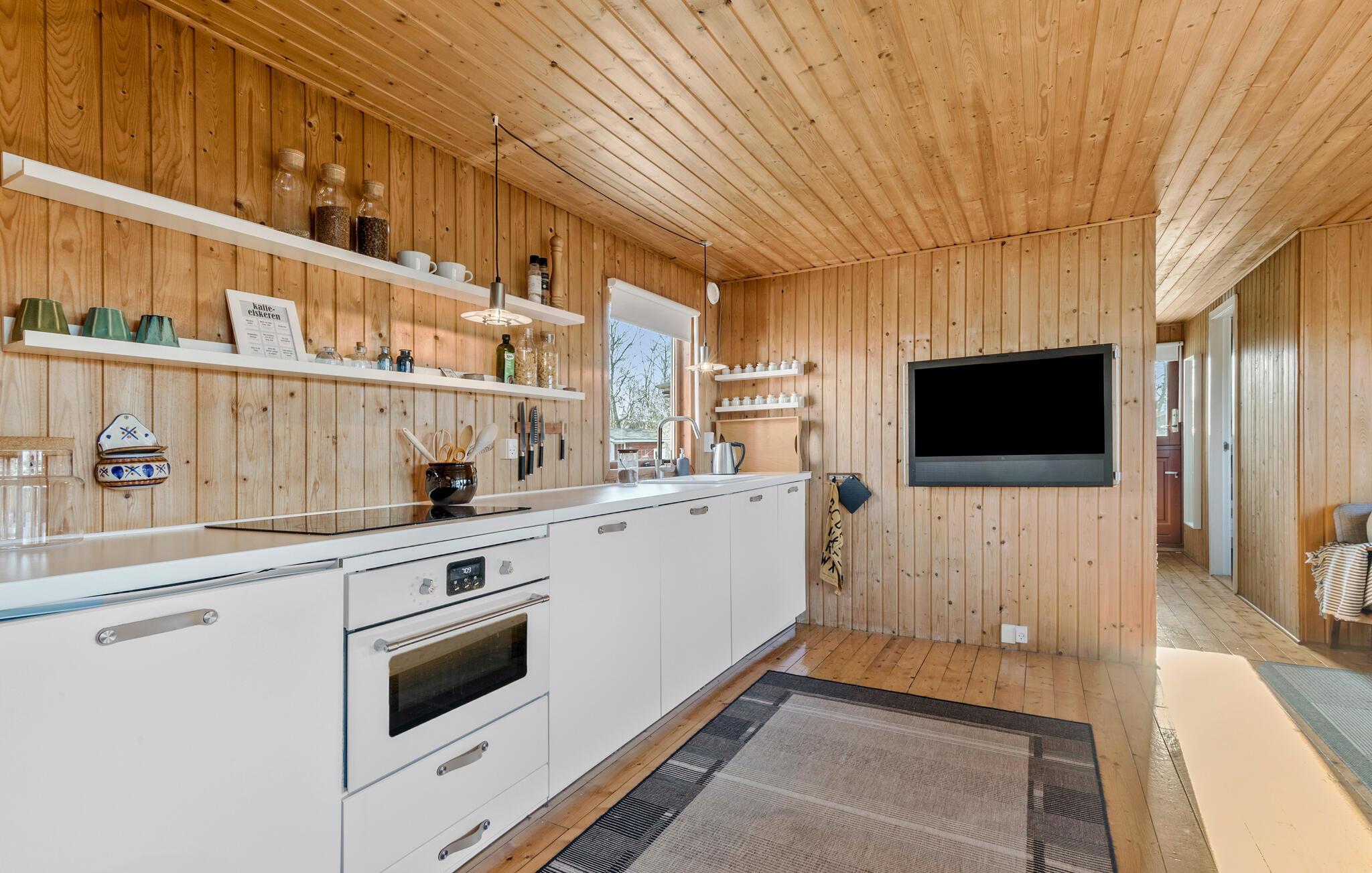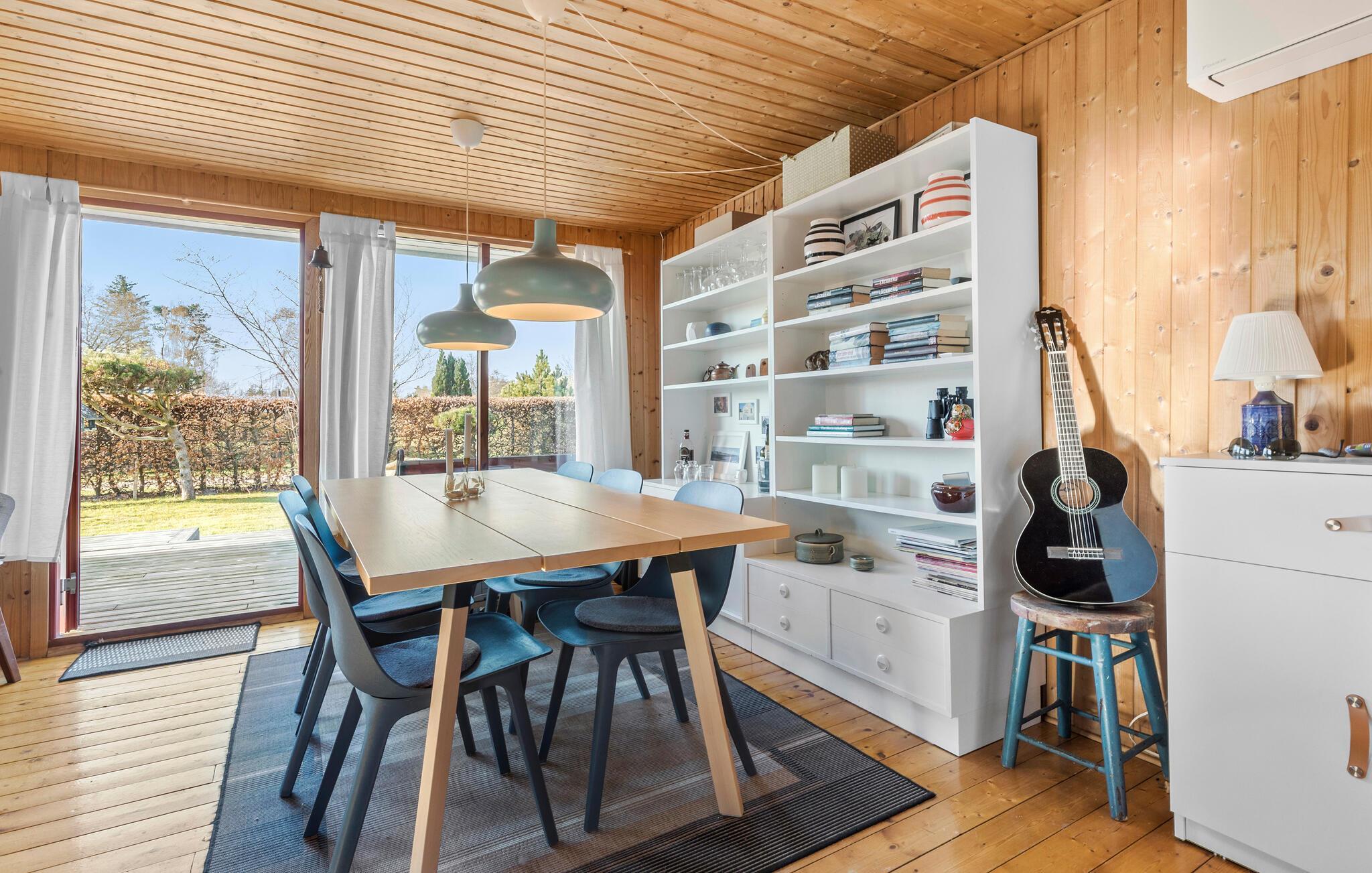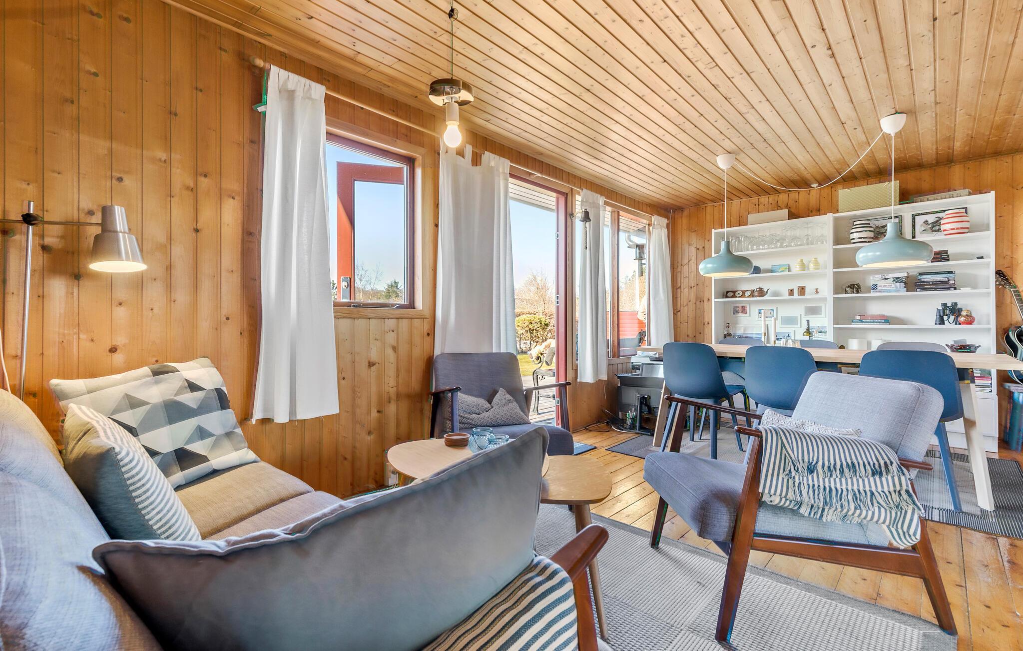 Willkommen in Ihrem Ferienhaus, das nur einen kurzen Spaziergang vom nächsten Badestrand entfernt liegt. Verbringen Sie entspannte Stunden im gemütlichen Wohnbereich mit bequemen Sitzmöbeln und direktem Zugang zur Terrasse. Die offene Küche ist praktisch gestaltet und lädt zum gemeinsamen Kochen ein. Am schönen Esstisch findet die ganze Familie Platz, ideal für Spieleabende oder gemeinsame Mahlzeiten. Der warme Holzton im Innenraum sorgt für eine behagliche Atmosphäre, in der Sie sich sofort zu Hause fühlen.