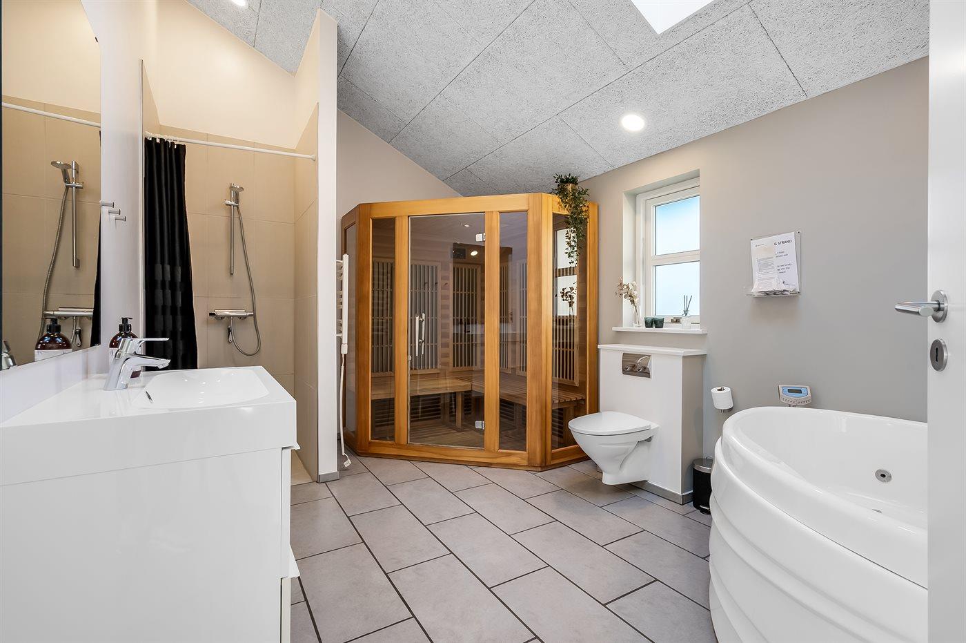 Es gibt 2 Badezimmer mit Duschnische und 2 Toiletten. Fußbodenheizung in 2 Badezimmern. Es steht eine Sauna zur Verfügung in der Sie sich so richtig entspannen können.