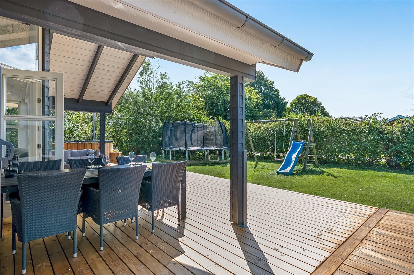 Die Ferienunterkunft liegt auf einem 1501 m² großen Gartengrundstück. Die Entfernung zum Meer beträgt 850 m. Die nächste Einkaufsmöglichkeit liegt 500 m entfernt. In einem Abstand von 15000 m gibt es einen Golfplatz. Es steht ein 105 m² Terrassenareal zur Verfügung. Außerdem gibt es 30 m² überdachte Terrasse. Schaukel. Sandkasten. Trampolin. Es ist ein Ladestecker für Elektroautos installiert. Ladestecker Typ 2. Mit einer Ladeleistung von 11 kW. Parkplatz auf dem Grundstück.
