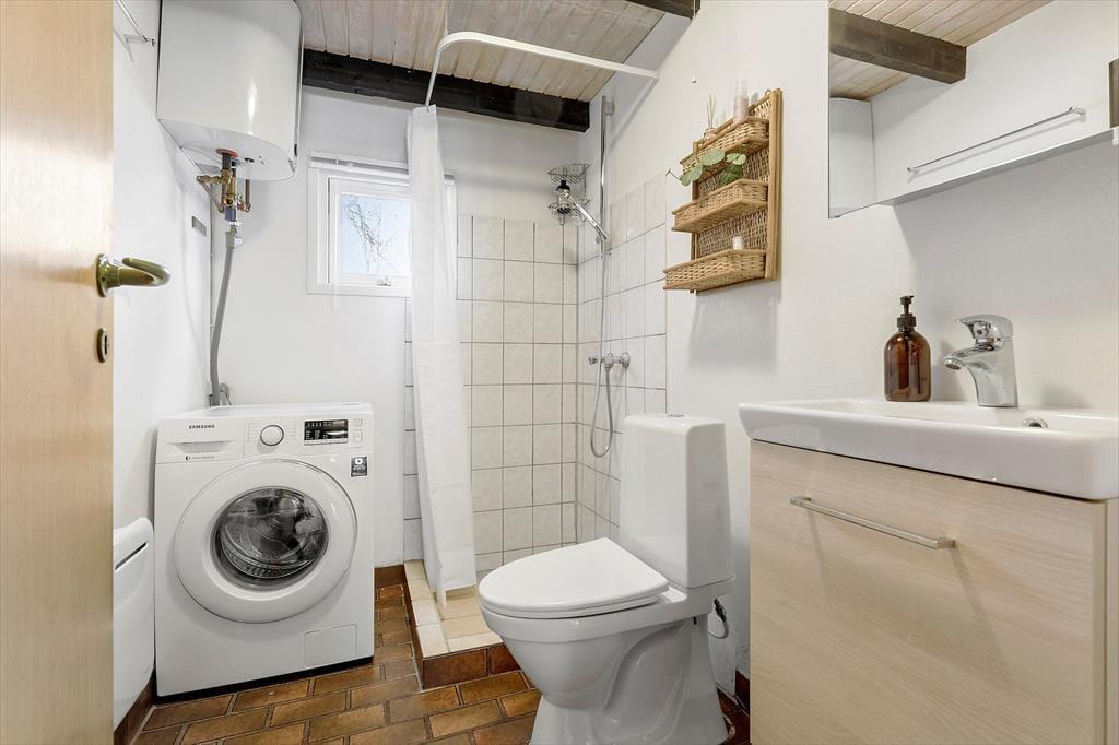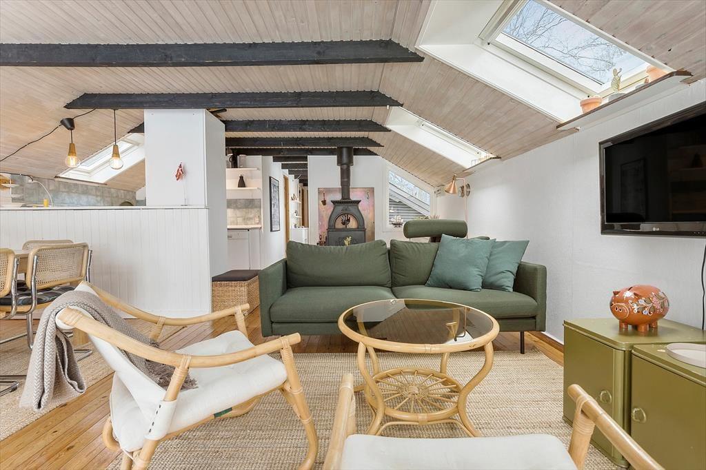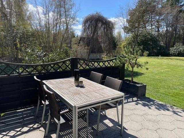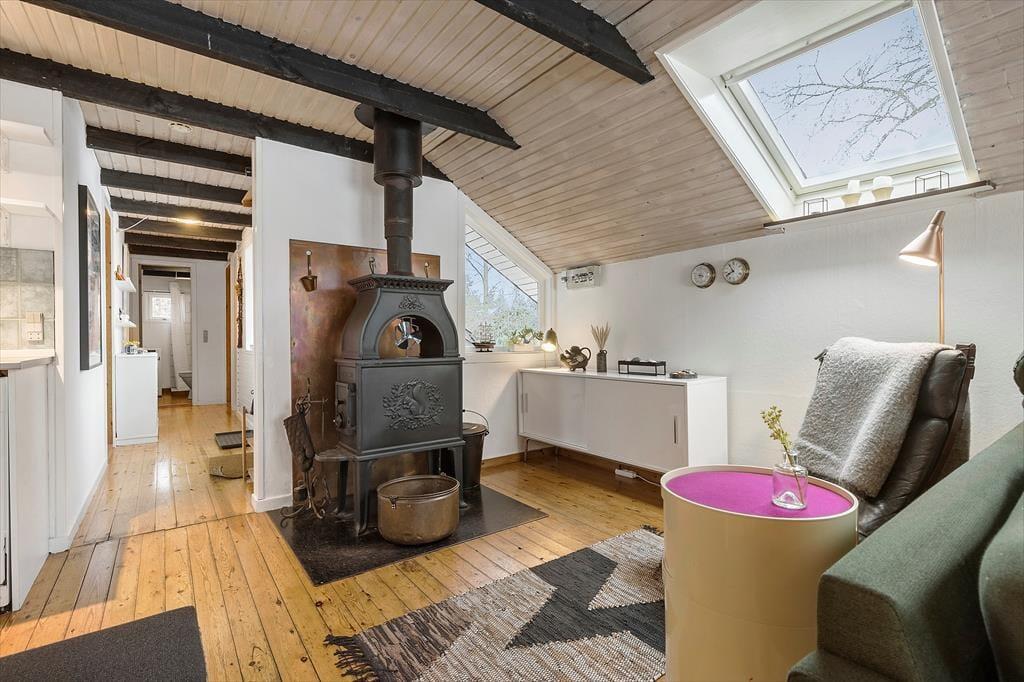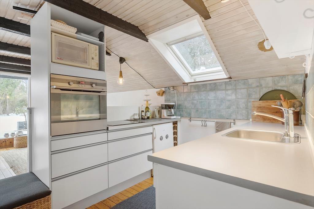 Dieses Ferienhaus in der Nähe des schönen Badestrands besticht mit einer attraktiven Wohnatmosphäre. Der gemütliche Wohnraum beinhaltet einen Kaminofen, einen Essplatz und einen Zugang zur Terrasse, hinter der sich das riesige Grundstück mit Bäumen und Büschen erstreckt. Die ansprechende Küche ist offen mit dem Wohnraum verbunden. Ein Badezimmer mit Waschmaschine und drei Schlafräume sind vorhanden. Zwei der Schlafräume empfangen Sie mit je einem Doppelbett. In dritten Raum treffen Sie auf ein doppeltes Schlafsofa und auf einen Arbeitsplatz für zwei Personen, an dem Sie Ihrer Kreativität freien Lauf lassen oder in Ruhe an Ihrem Laptop spielen oder arbeiten können.