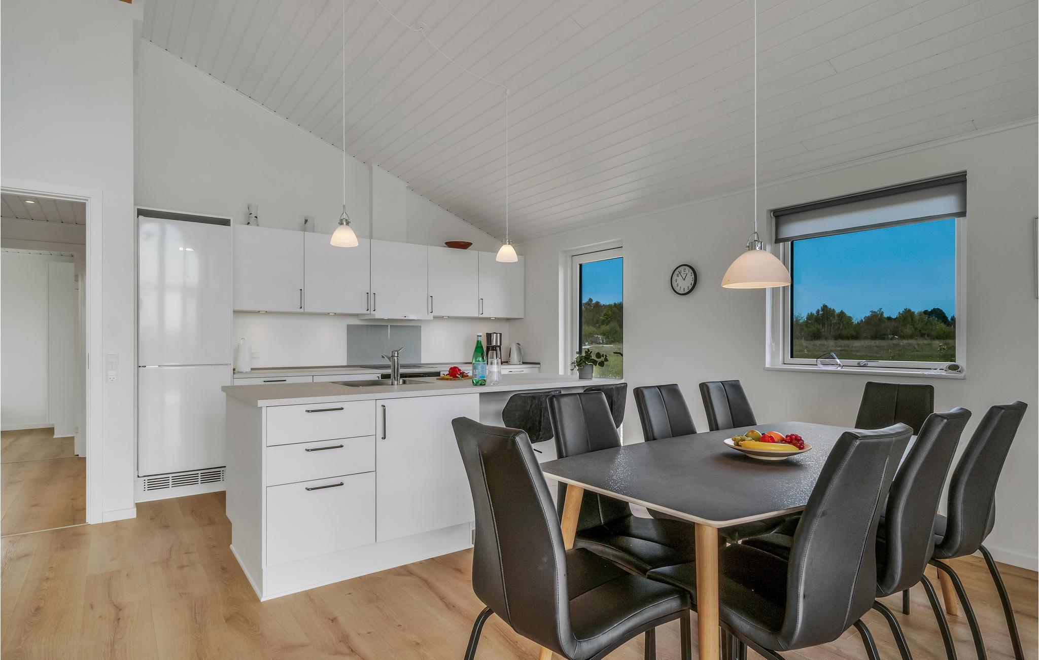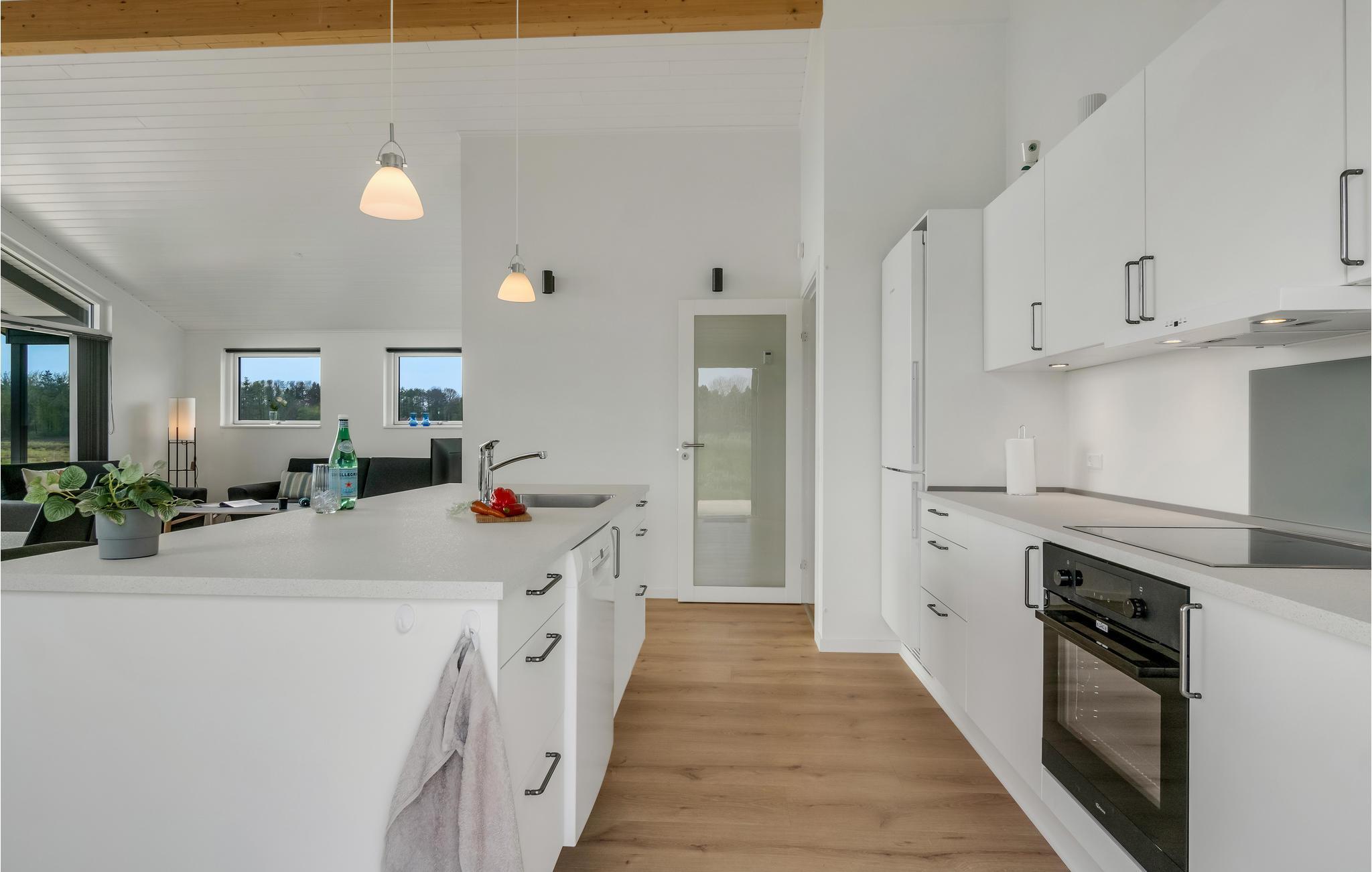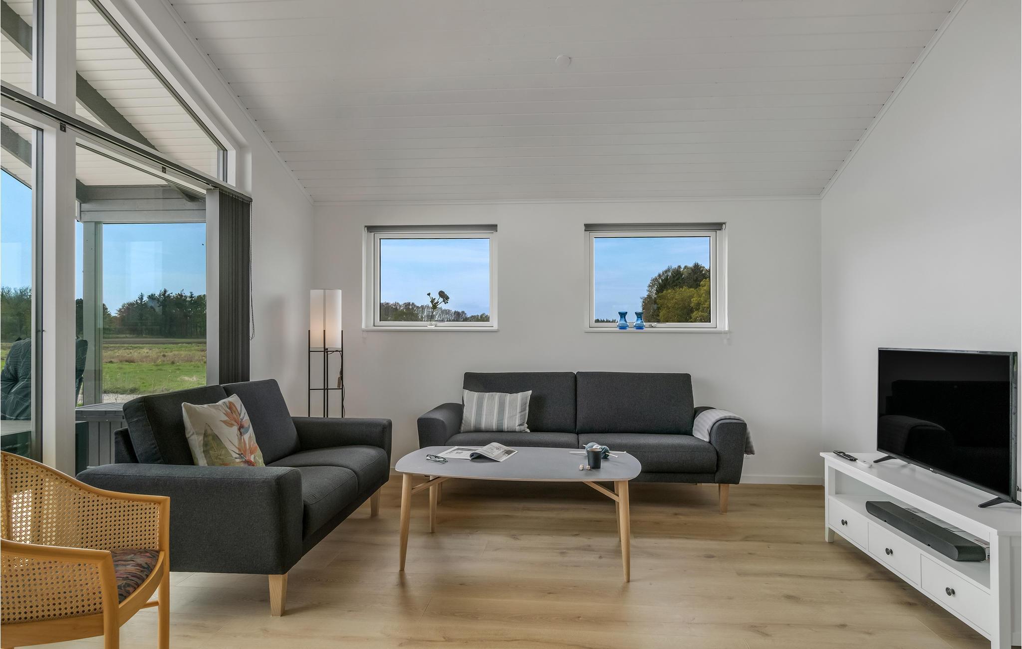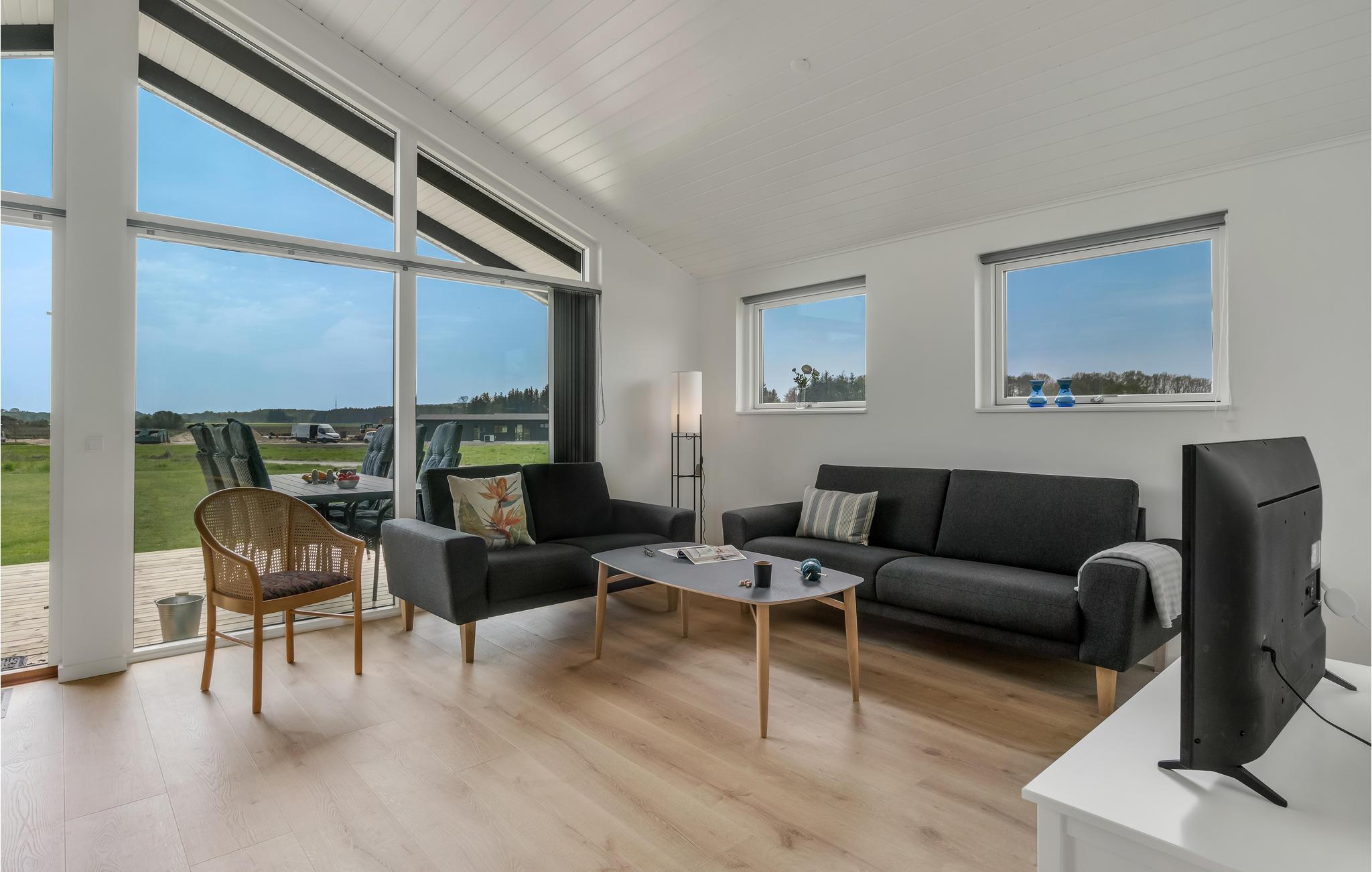 Verbringen Sie Ihren Urlaub nicht weit vom Strand in dem exklusiven Ferienhaus. Machen Sie es sich mit Ihren Lieben in den hellen Räumen des Hauses gemütlich. Die geschmackvolle, moderne Einrichtung und dezente Farben schaffen eine ruhige Atmosphäre, in der Sie fantastisch entspannen können. Die großen Panoramafenster stellen sicher, dass Sie dabei den tollen Blick auf die umliegende Landschaft optimal genießen können. Die bequeme Sofaecke lädt nach aktiven Tagen zu langen Abenden im Wohnbereich ein. Plaudern Sie bis spät beim behaglichen Knistern der Flammen im Kaminofen. Treten Sie gleich morgens auf die Terrasse, lassen Sie beim ersten Kaffee den Blick über die Wiesen schweifen und genießen Sie beim Zwitschern der Vögel die ersten Sonnenstrahlen.