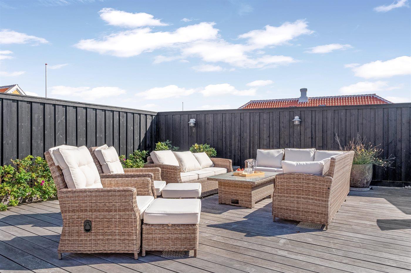 Zum Haus gehört eine große, geschützte Südterrasse, die sowohl Raum für ruhige Momente mit dem Morgenkaffee als auch für gemütliche Grillabende unter freiem Himmel bietet. Die Terrasse ist völlig uneinsehbar, was eine private Atmosphäre schafft, in der man die Sonne den ganzen Tag genießen kann.