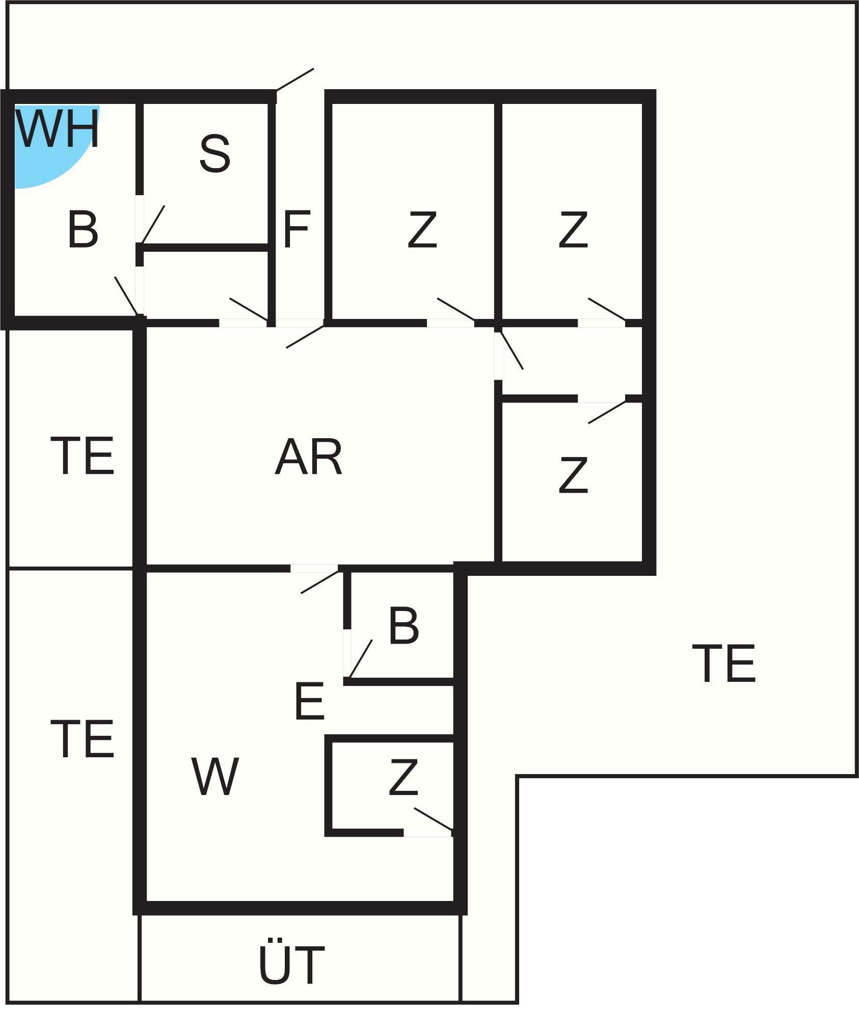 Bad: WC, Waschb., Dusche, Fußbodenheiz.