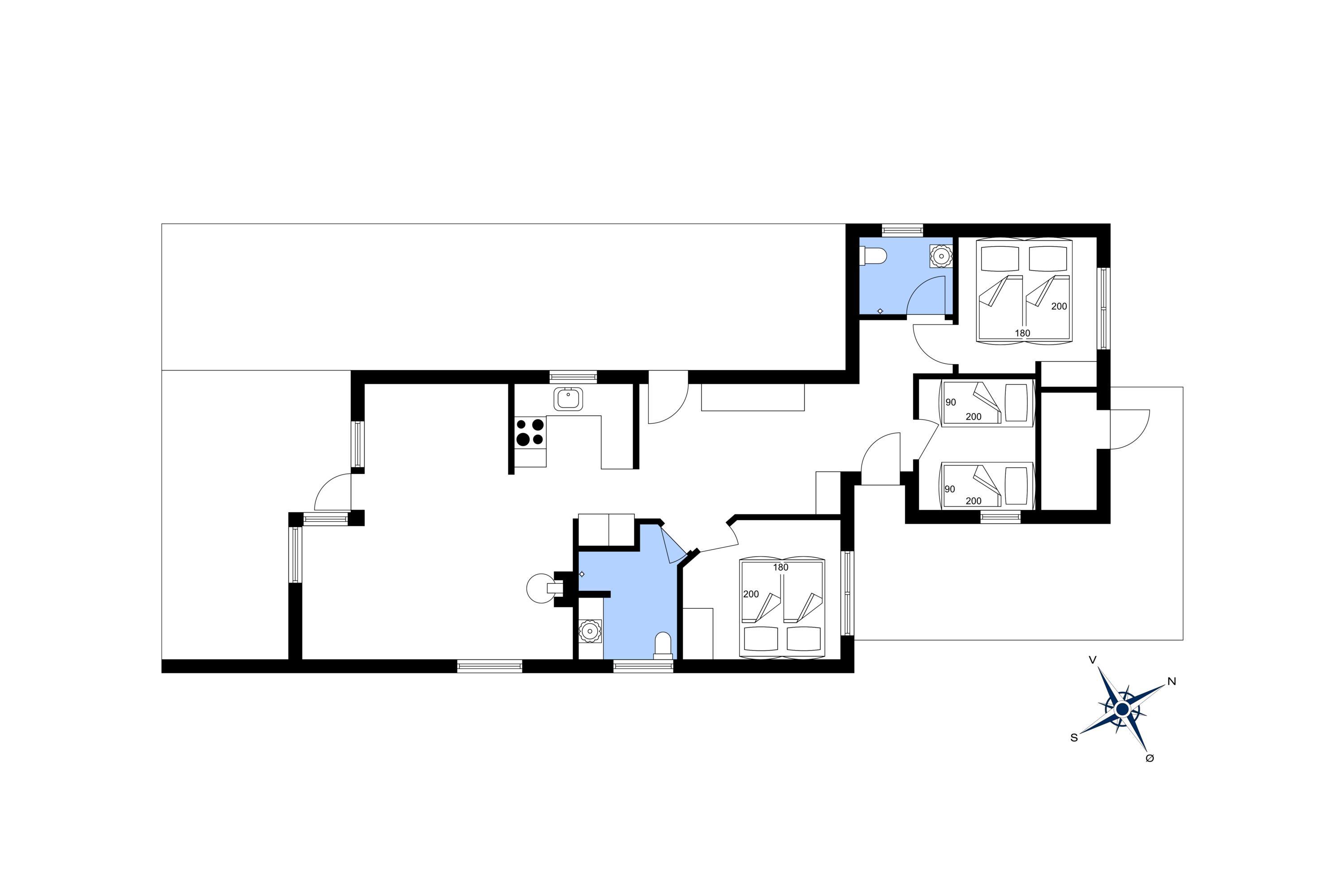3 Schlafzimmer. 2 mit Doppelbett 180x200 cm. 1 mit 2 Einzelbetten (je 90x200 cm).