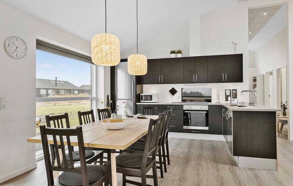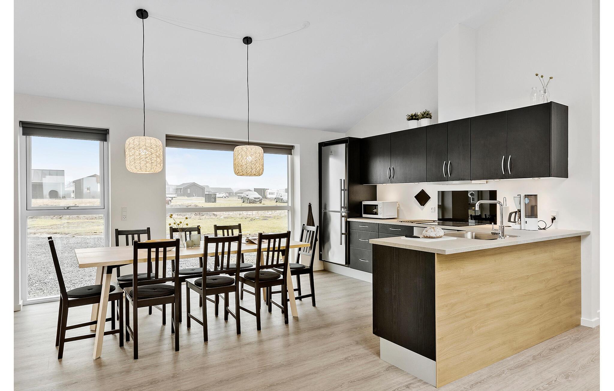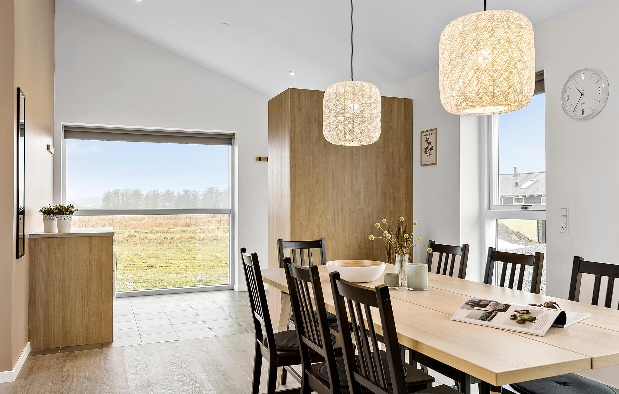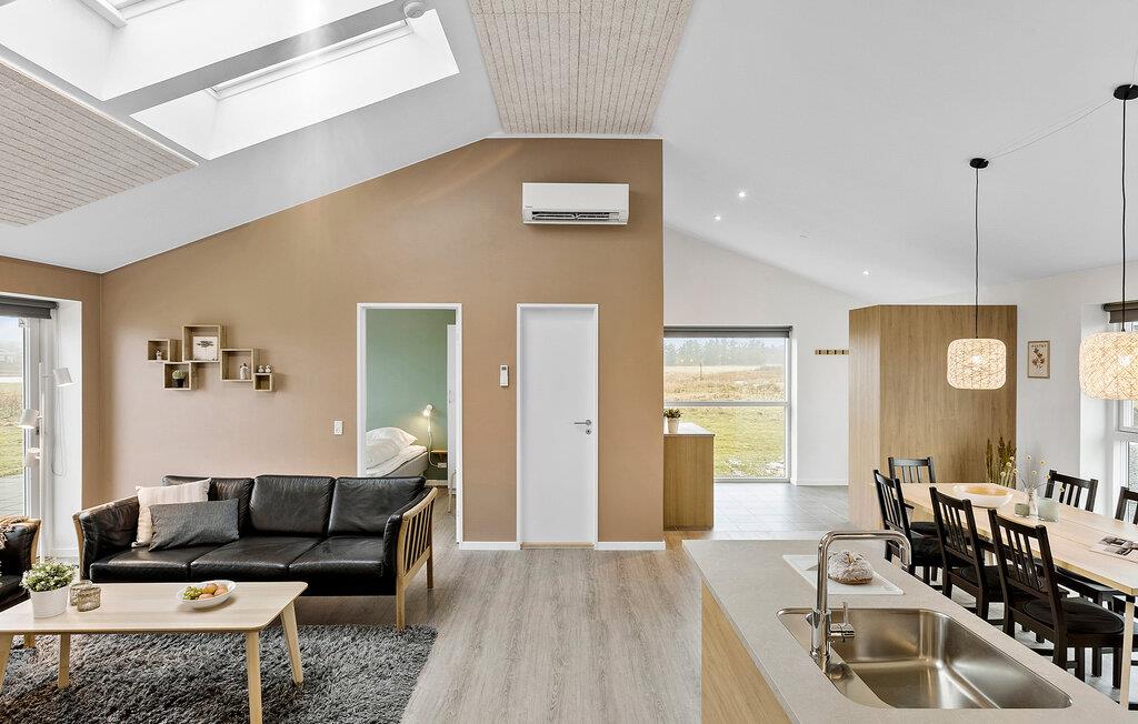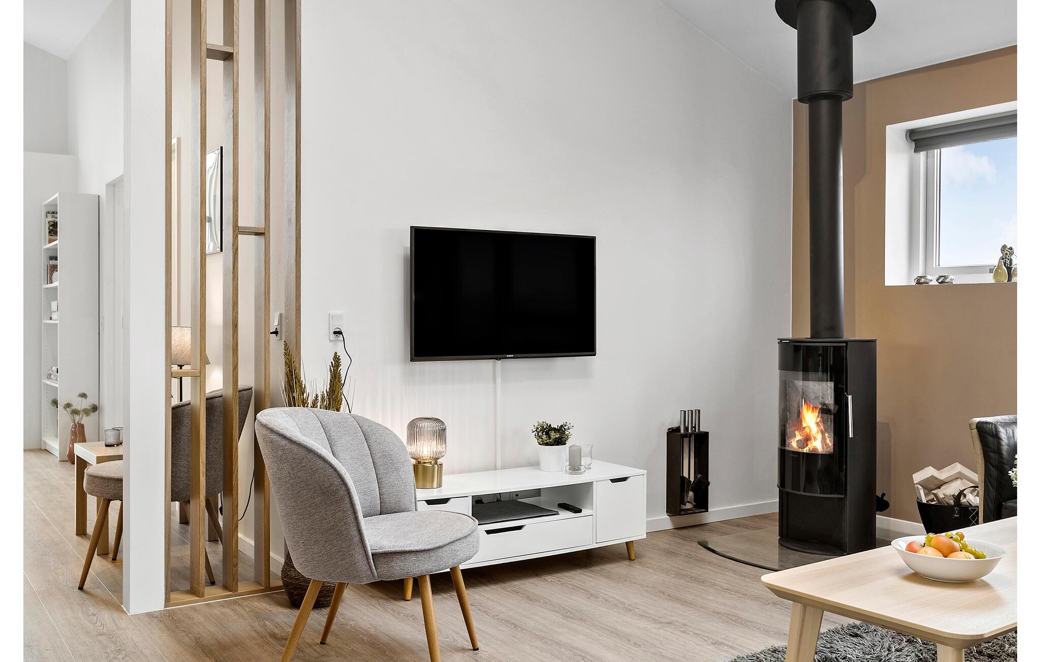 Auf einem offenen Grundstück, mit weitem Blick über die Landschaft, empfängt Sie dieses schöne Ferienhaus. Dachfenster und bodentiefe Fenster lassen viel Tageslicht herein und schaffen eine angenehme wohnliche Atmosphäre. Machen Sie es sich auf dem Sofa am Kaminofen bequem und schauen Sie abends einen guten Film. Am Esstisch neben der modernen, offenen Küche ist Platz für die ganze Familie. Nutzen Sie die Infrarotsauna und den Whirlpool für Ihr persönliches Wellnessprogramm. Lassen Sie hier lange und erlebnisreiche Urlaubstage in aller Ruhe ausklingen.