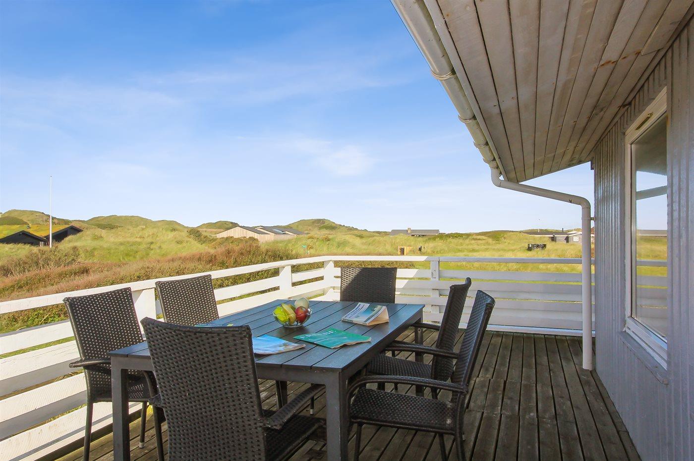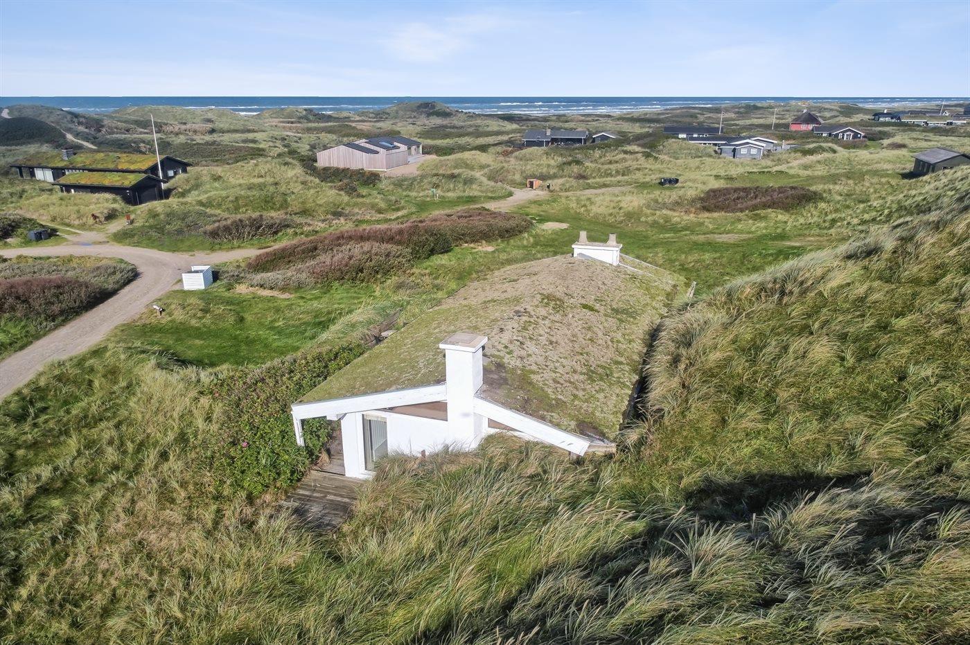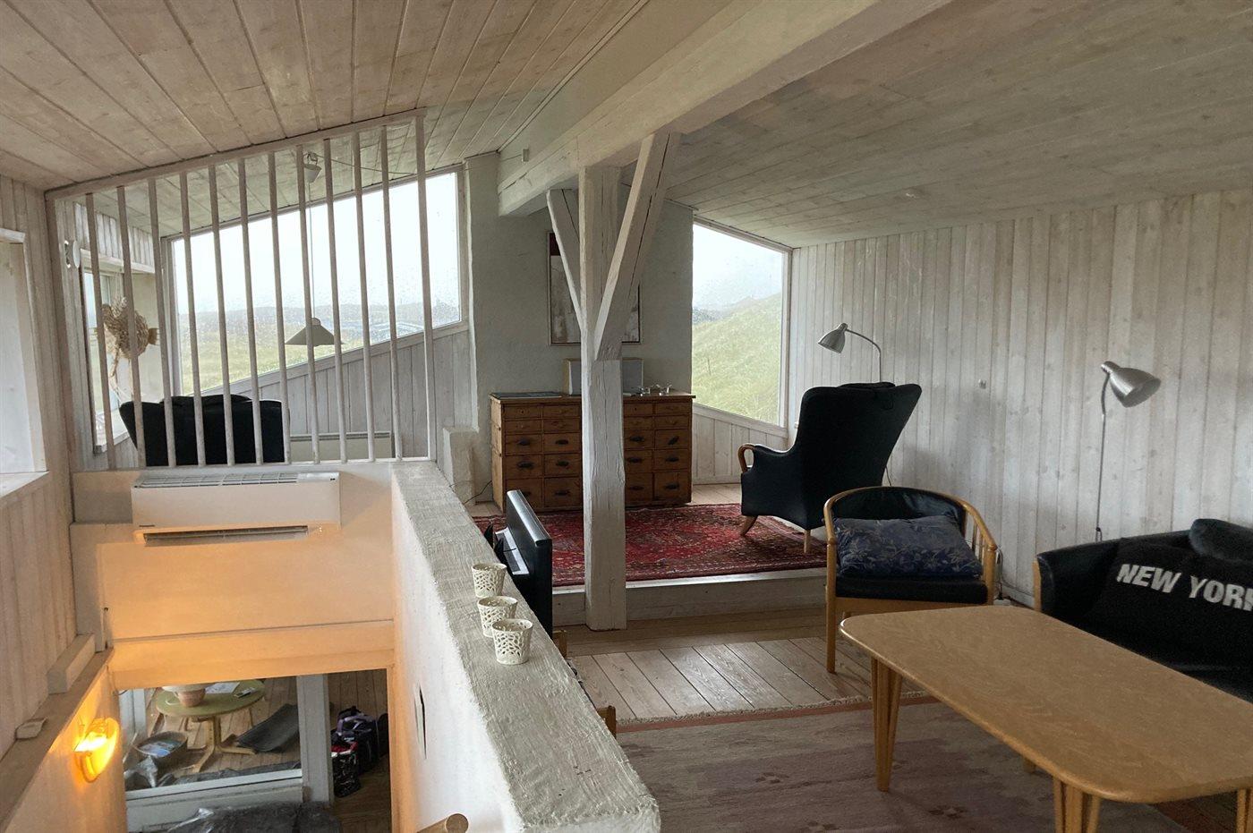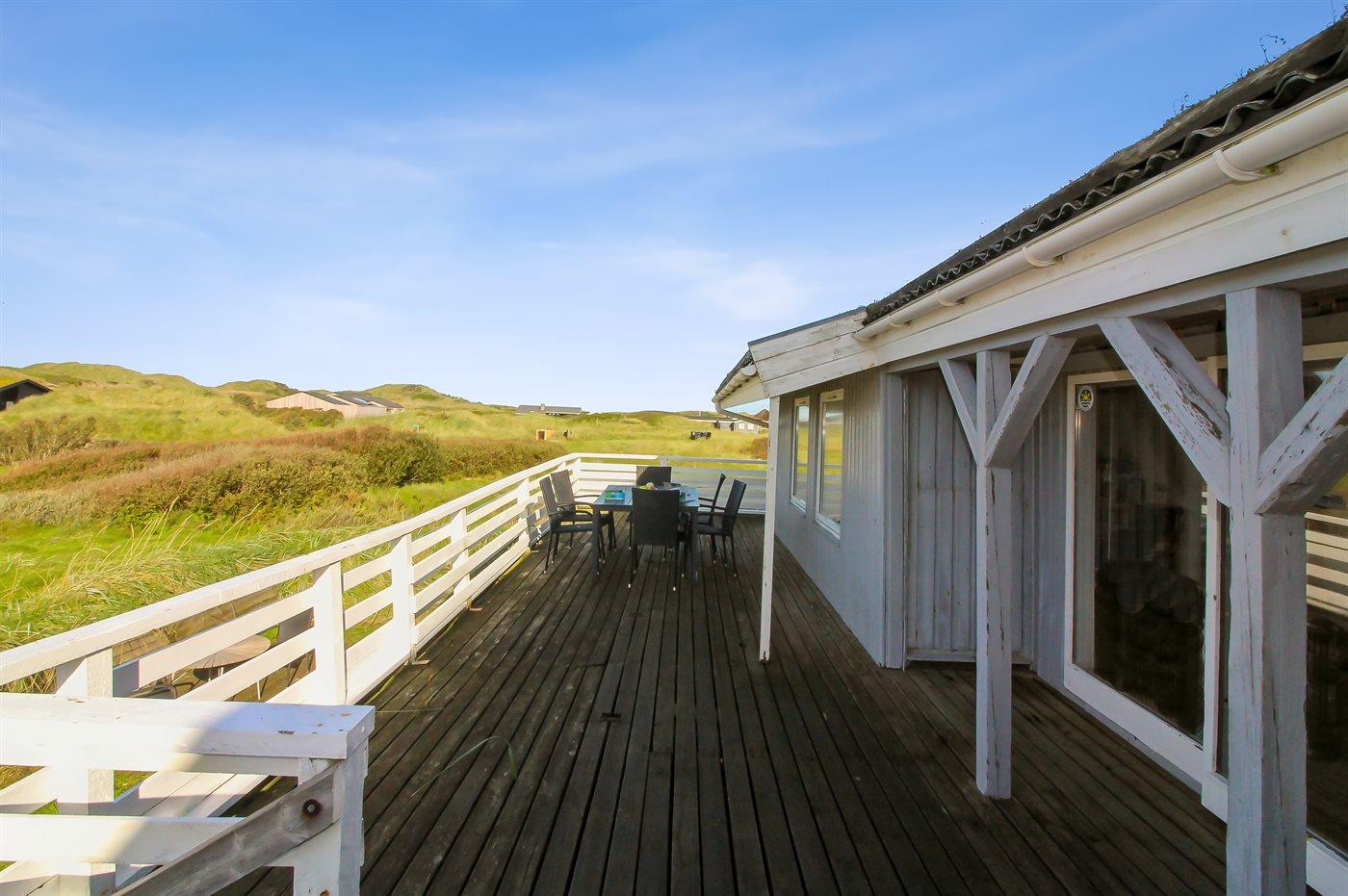 Gut gelegenes Ferienhaus in versetzter Ebene. Das Haus liegt hoch auf einem großen Dünengrundstück. Großartige Aussicht über die Dünen mit der Nordsee im Hintergrund vom sowohl Haus als Grundstück. Dicht am Pfad, der direkt zu einem der besten Badestrände Dänemarks führt. Überall hübscher Bohlenbelag und schrägende Holzdecken.
