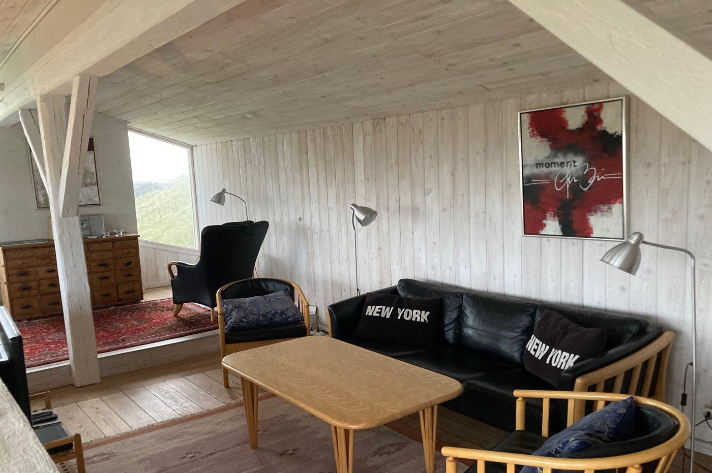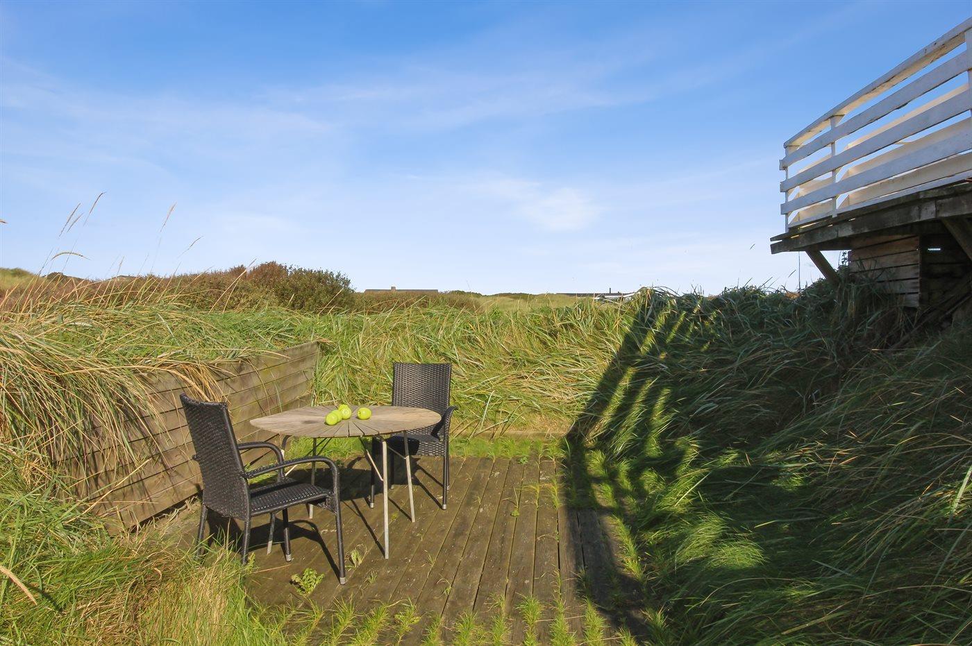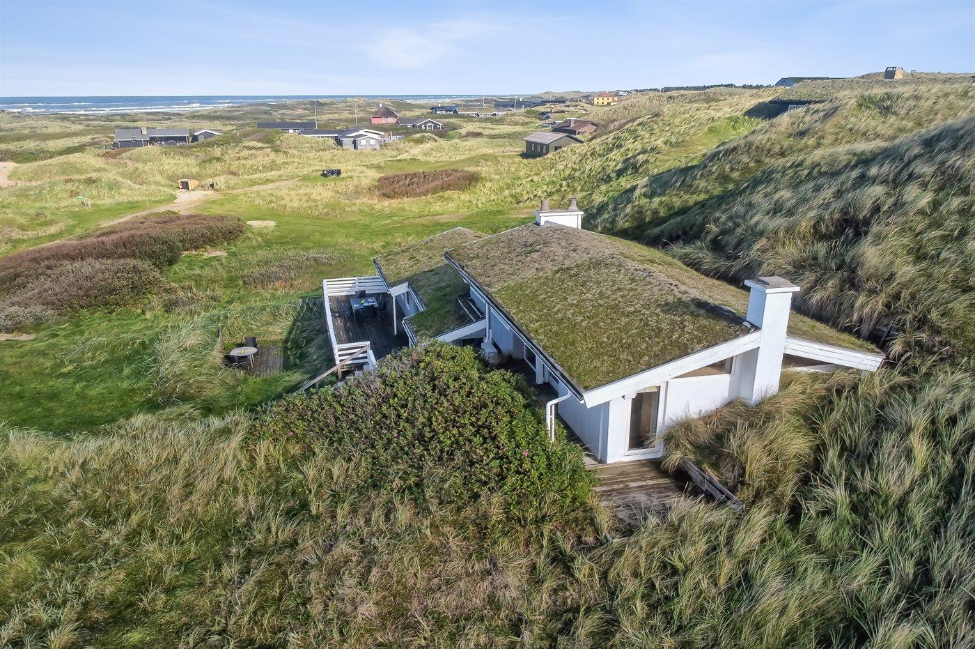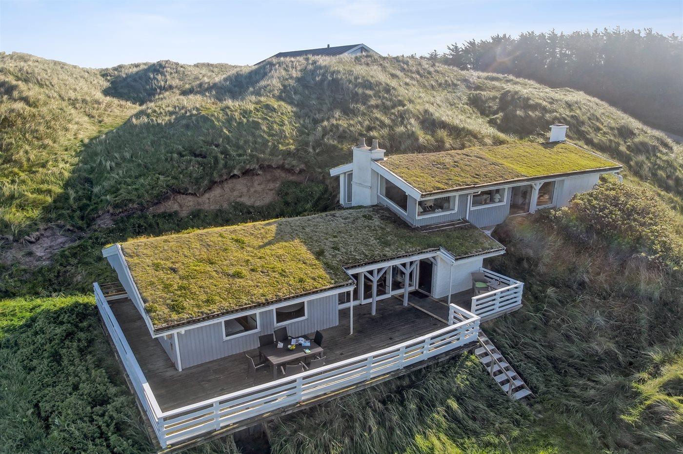 Gut gelegenes Ferienhaus in versetzter Ebene. Das Haus liegt hoch auf einem großen Dünengrundstück. Großartige Aussicht über die Dünen mit der Nordsee im Hintergrund vom sowohl Haus als Grundstück. Dicht am Pfad, der direkt zu einem der besten Badestrände Dänemarks führt. Überall hübscher Bohlenbelag und schrägende Holzdecken.