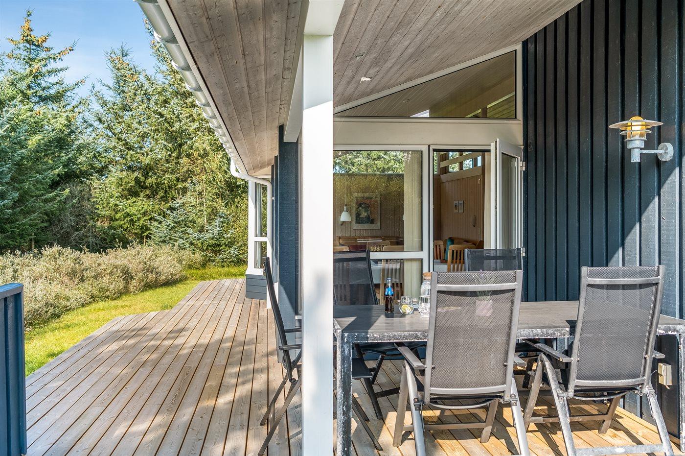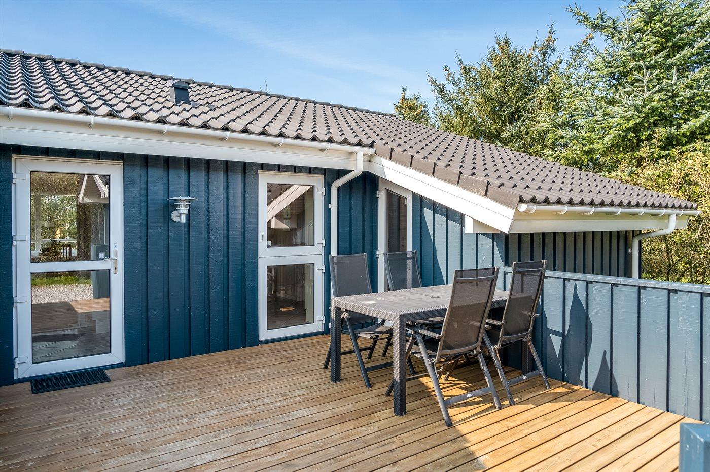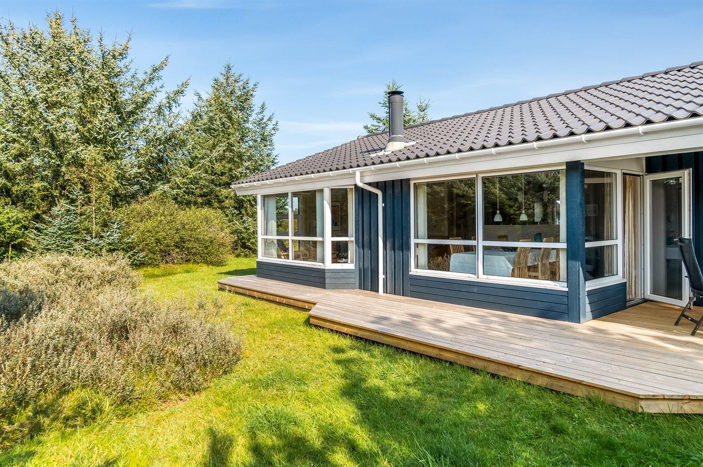 Ein schönes und luxuriöses Ferienhaus aus Holz, 2004 gebaut, in einer Sackgasse gelegen. Zum Haus gehören gute Terrassen mit Windschutzzäunen in Richtung Osten, Süden und Westen. Im Ferienhausgebiet gibt es eine gemeinsame Petanquebahn und Schaukel. Ein wirklich schönes Ferienhaus in einem Gebiet mit vielen Aktivitätsmöglichkeiten. Der Grund ist teilweise eingezäunt.