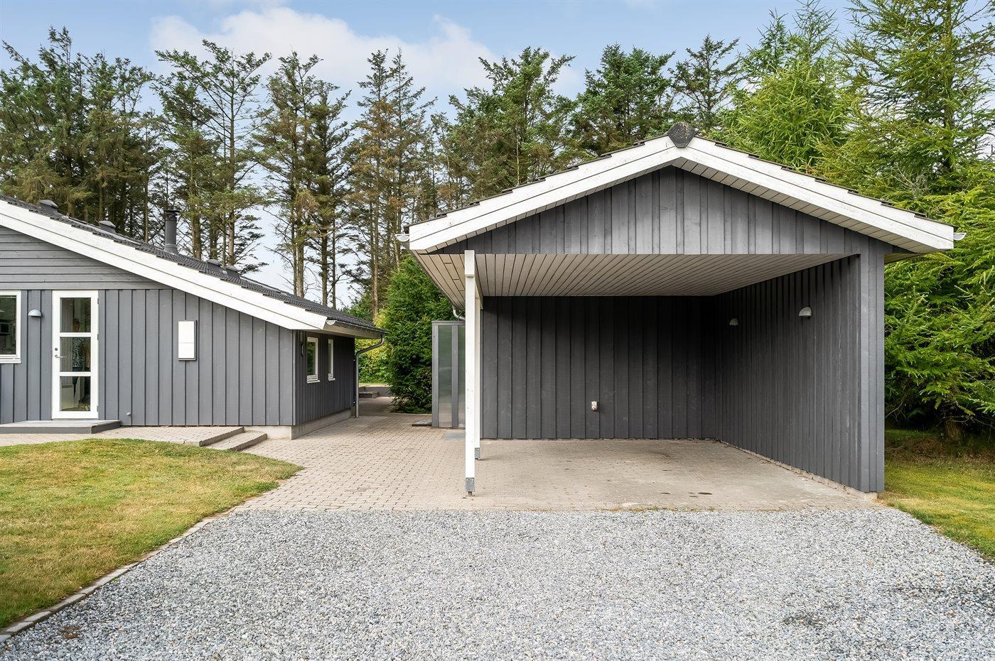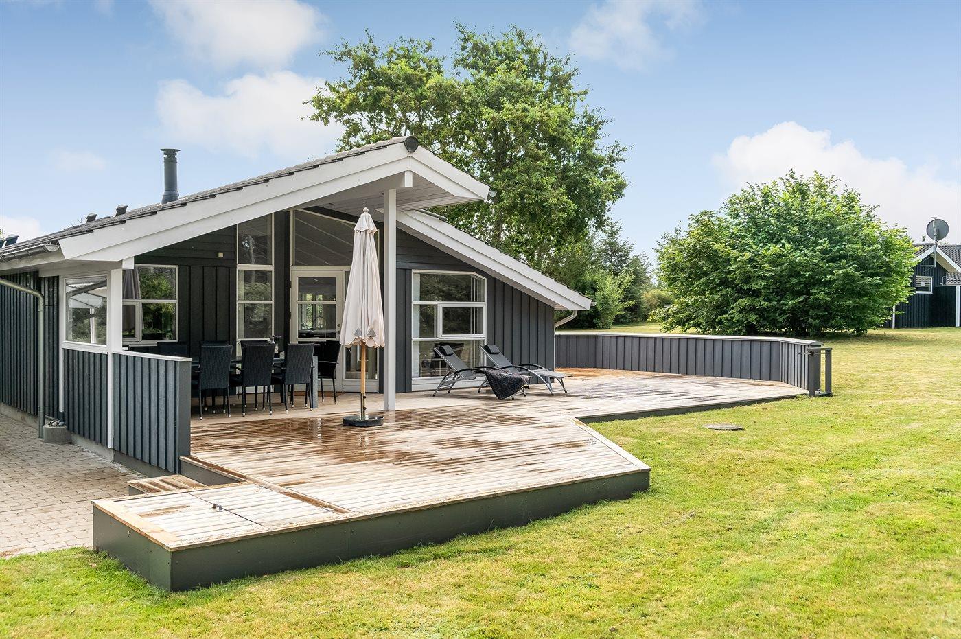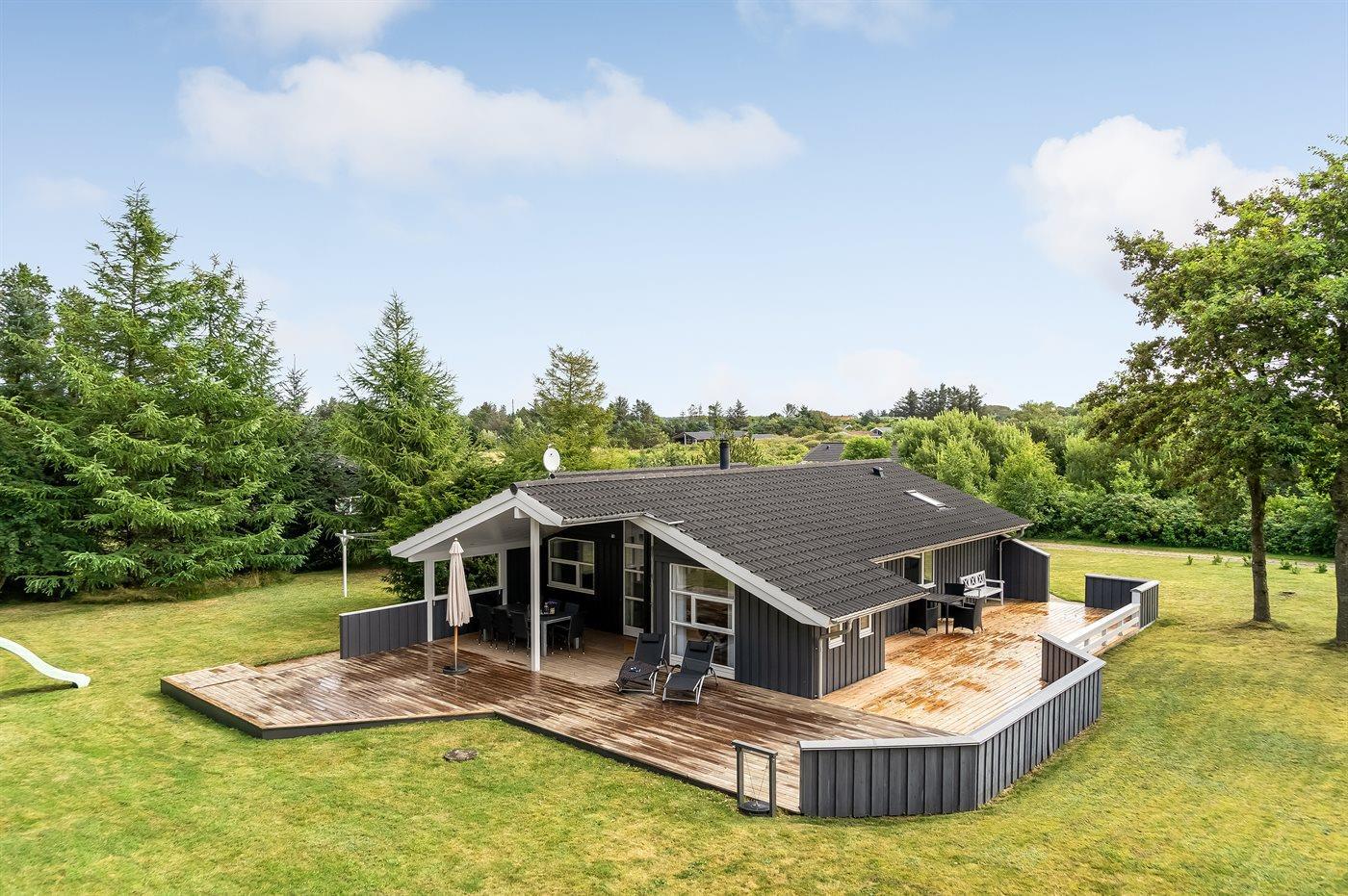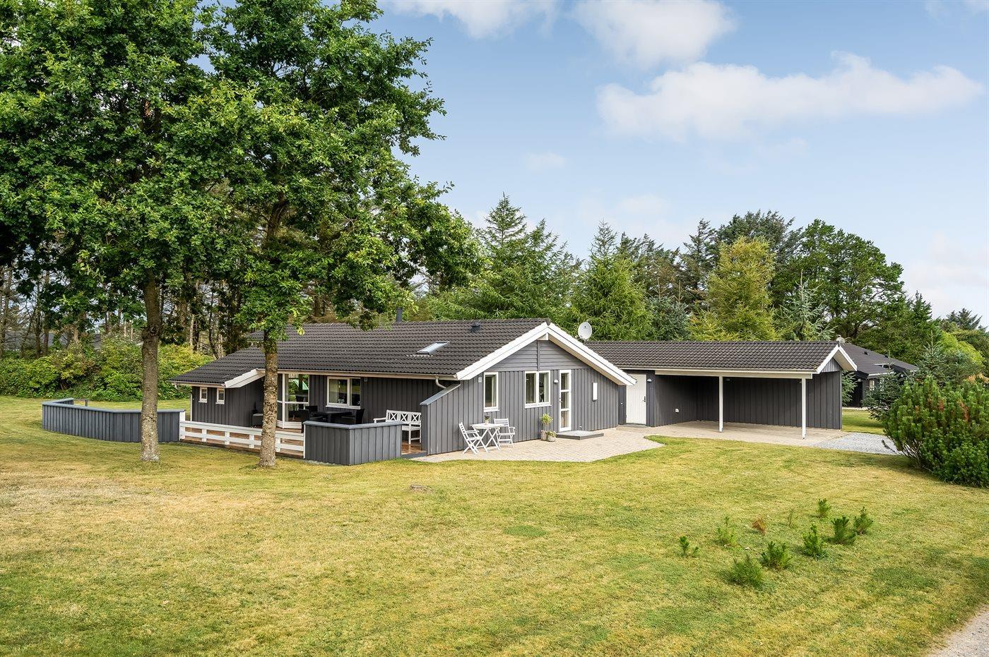 Sehr hübsches und gut eingerichtetes Luxusferienhaus aus Holz, 2007 mit u. a. Whirlpool und Sauna gebaut. Das Haus liegt auf einem großen Naturgrundstück - nur 700 m vom breiten Sandstrand bei Grønhøj entfernt. Zum Haus gehören gutes sowohl offenes als auch überdachtes Terrassenareal mit Gartenmöbeln. Innen gibt es überall helle Holzwände und -decken sowie Holzböden, jedoch beheizten Klinkerboden im Badezimmer und in der Gästetoilette. Das Badezimmer ist mit Duschnische, Fußbodenheizung, 2-Pers.-Whirlpool und Sauna sowie Waschmaschine eingerichtet. Hübsche, moderne Küche mit Geschirrspüler, Mikrowelle, Warmluftofen, Herd mit Ceran-Feld und Tiefkühlgerät. Schönes Wohnzimmer mit Kaminofen, TV mit digitalem Satellitenanschluss, DVD-Spieler und CD-Spieler sowie Zutritt zur Terrasse. Die Schlafplätze des Hauses verteilen sich auf 3 Schlafzimmer: 2 mit Doppelbett und 1 mit 2 Einzelbetten. Ferner Alkoven mit 2 Schlafplätzen im Wohnzimmer. Kinderbett, Kinderhochstuhl, Sandkiste und Schaukel für die Kinder. Carport auf dem Grundstück. Wärmepumpe zur Verfügung. Ein sehr schönes und gut eingerichtetes Ferienhaus, das sowohl für 1 als auch 2 Familien geeignet ist.