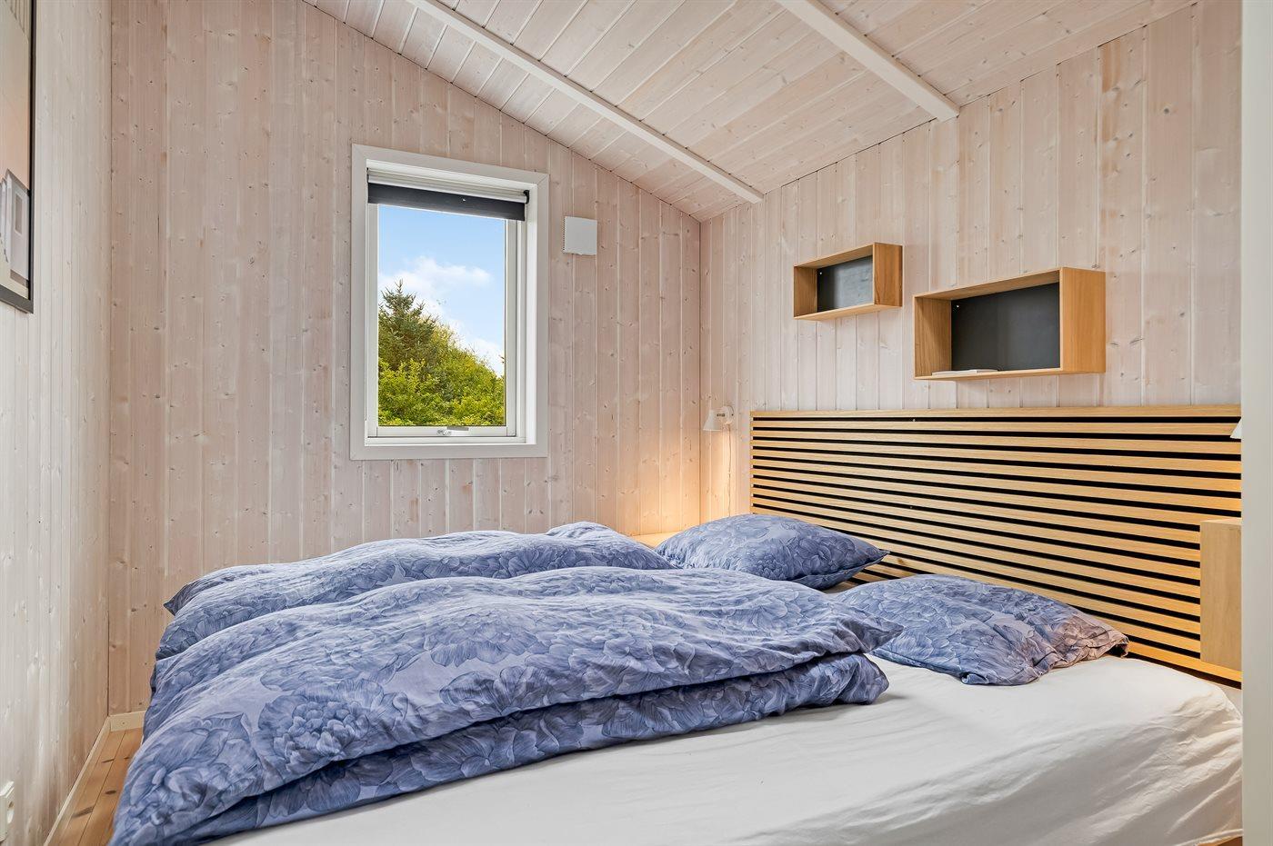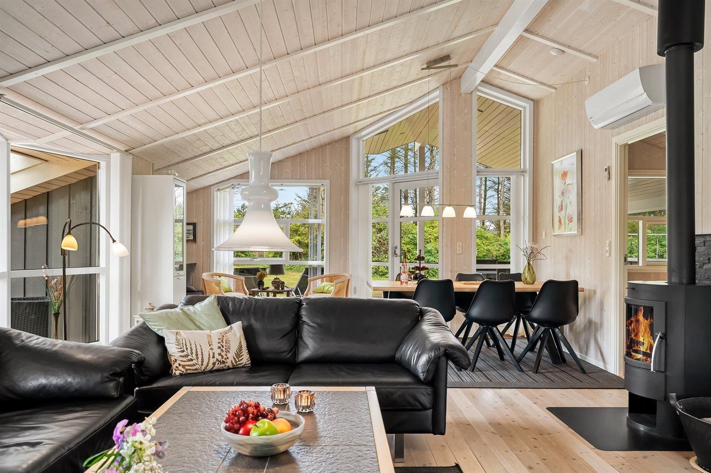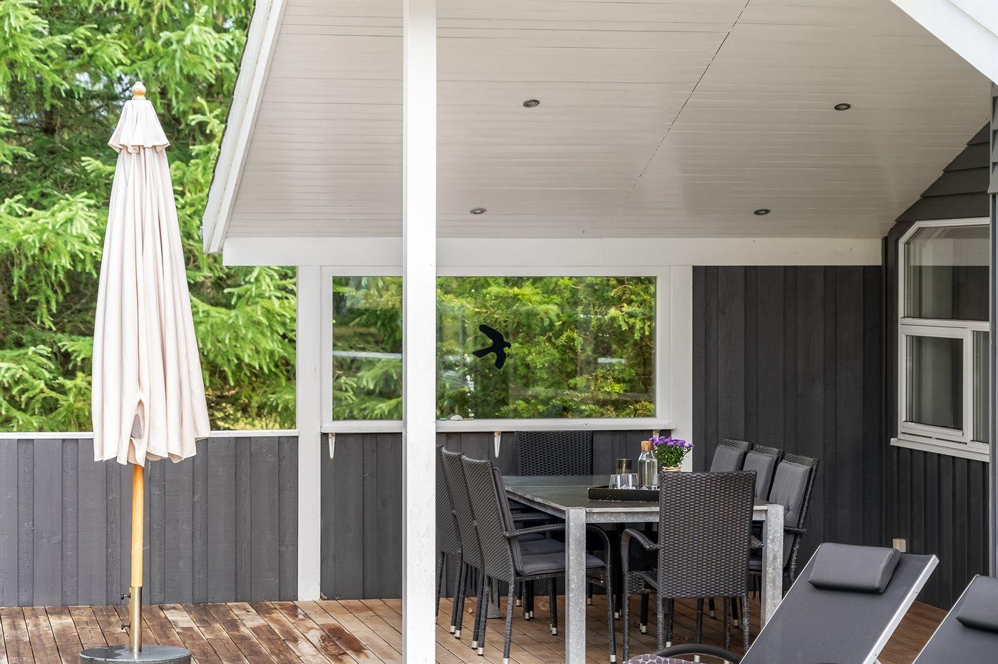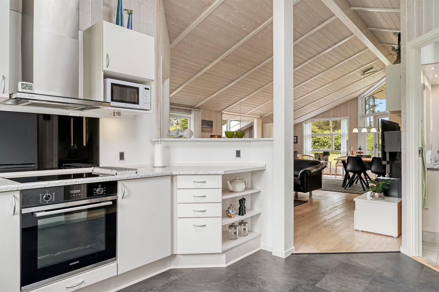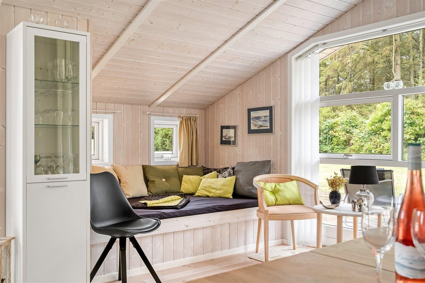 Sehr hübsches und gut eingerichtetes Luxusferienhaus aus Holz, 2007 mit u. a. Whirlpool und Sauna gebaut. Das Haus liegt auf einem großen Naturgrundstück - nur 700 m vom breiten Sandstrand bei Grønhøj entfernt. Zum Haus gehören gutes sowohl offenes als auch überdachtes Terrassenareal mit Gartenmöbeln. Innen gibt es überall helle Holzwände und -decken sowie Holzböden, jedoch beheizten Klinkerboden im Badezimmer und in der Gästetoilette. Das Badezimmer ist mit Duschnische, Fußbodenheizung, 2-Pers.-Whirlpool und Sauna sowie Waschmaschine eingerichtet. Hübsche, moderne Küche mit Geschirrspüler, Mikrowelle, Warmluftofen, Herd mit Ceran-Feld und Tiefkühlgerät. Schönes Wohnzimmer mit Kaminofen, TV mit digitalem Satellitenanschluss, DVD-Spieler und CD-Spieler sowie Zutritt zur Terrasse. Die Schlafplätze des Hauses verteilen sich auf 3 Schlafzimmer: 2 mit Doppelbett und 1 mit 2 Einzelbetten. Ferner Alkoven mit 2 Schlafplätzen im Wohnzimmer. Kinderbett, Kinderhochstuhl, Sandkiste und Schaukel für die Kinder. Carport auf dem Grundstück. Wärmepumpe zur Verfügung. Ein sehr schönes und gut eingerichtetes Ferienhaus, das sowohl für 1 als auch 2 Familien geeignet ist.