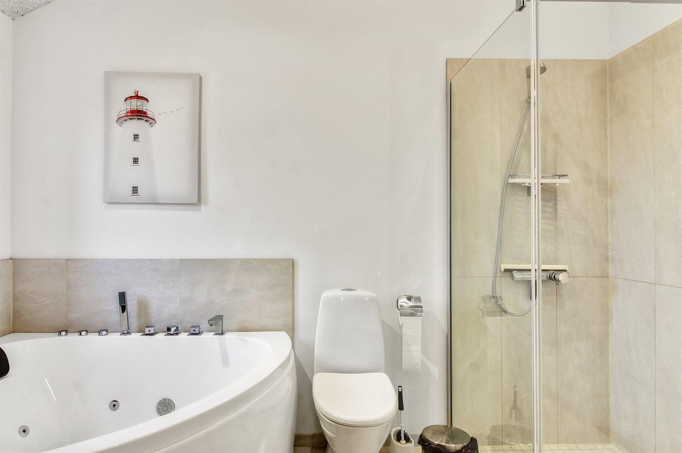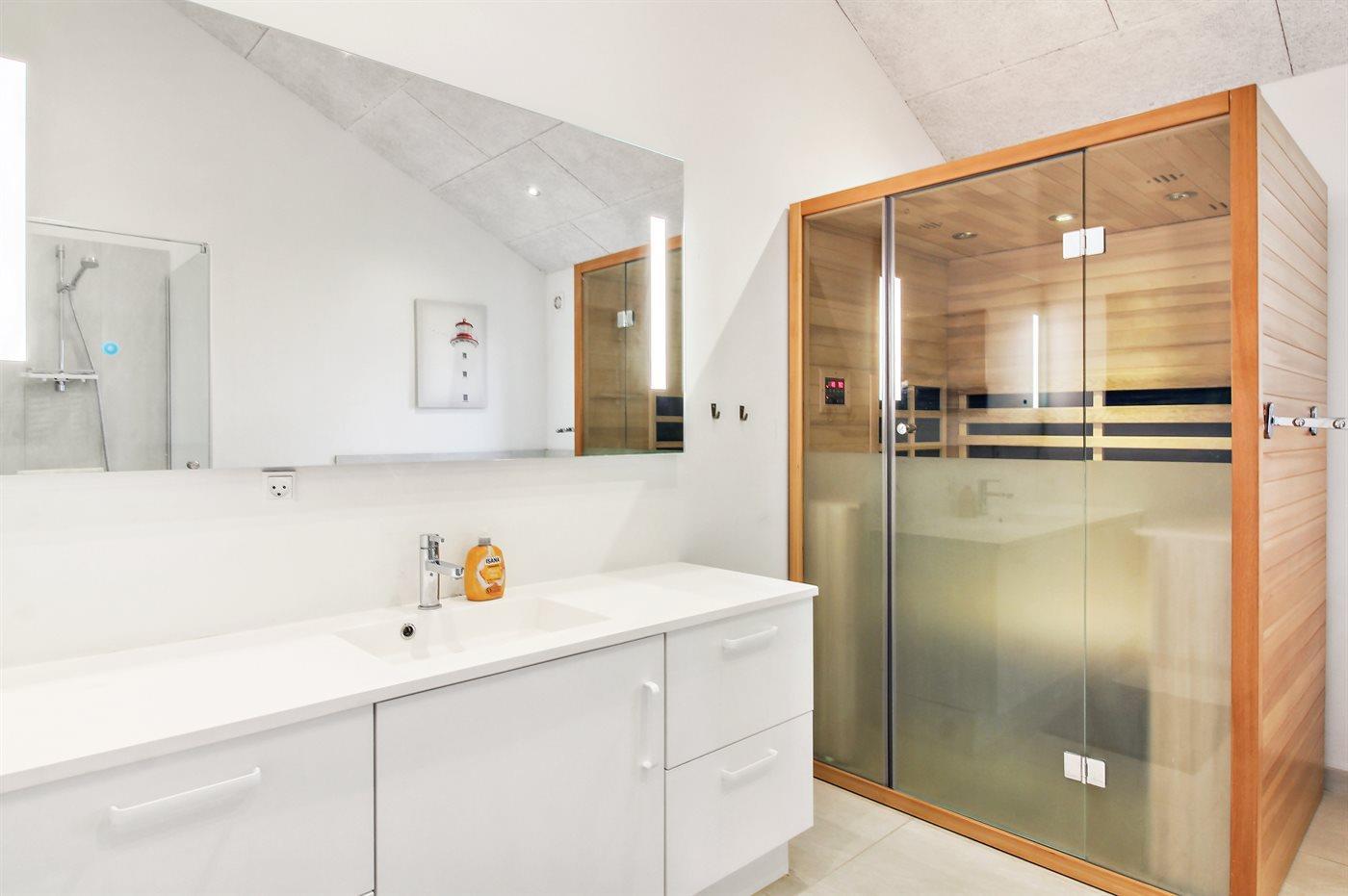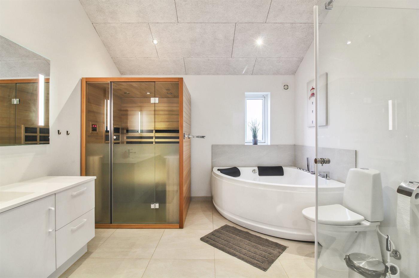Es gibt 2 Badezimmer mit Duschnische und 3 Toiletten, davon 1 Gästetoilette. Fußbodenheizung in 2 Badezimmern. Fußbodenheizung in der Gästetoilette. Es steht eine Sauna zur Verfügung in der Sie sich so richtig entspannen können.