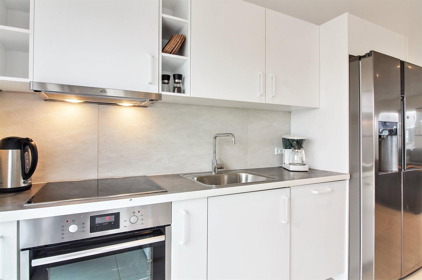 Die Küche ist mit amerikanischem Kühlschrank ausgestattet. Außerdem gibt es 4 Keramik-Kochfelder, Umluftofen, Mikrowelle sowie Geschirrspüler.