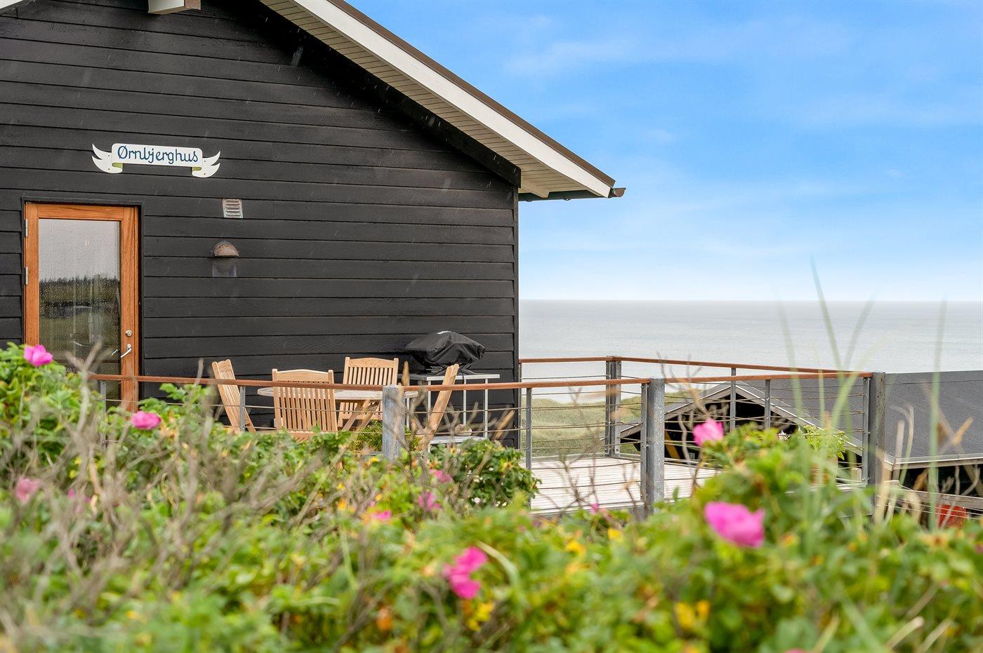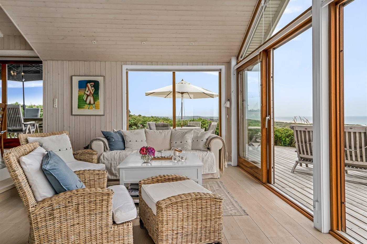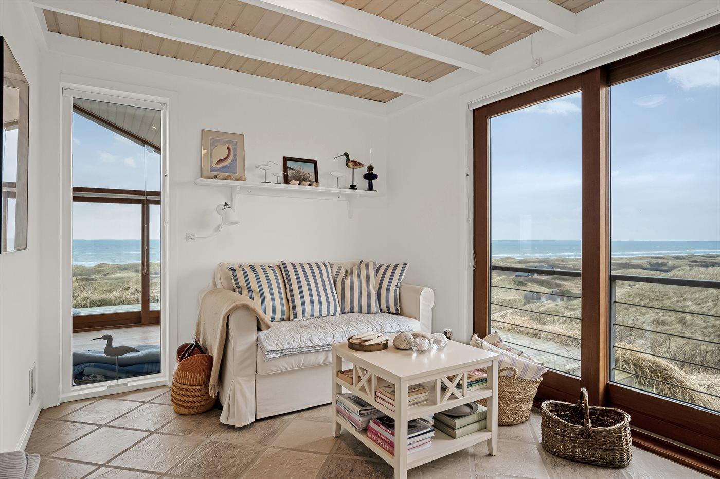 Modernes Ferienhaus mit Meerblick, Sauna, Whirlpool und großem Terrassenbereich an der Westküste Dänemarks.