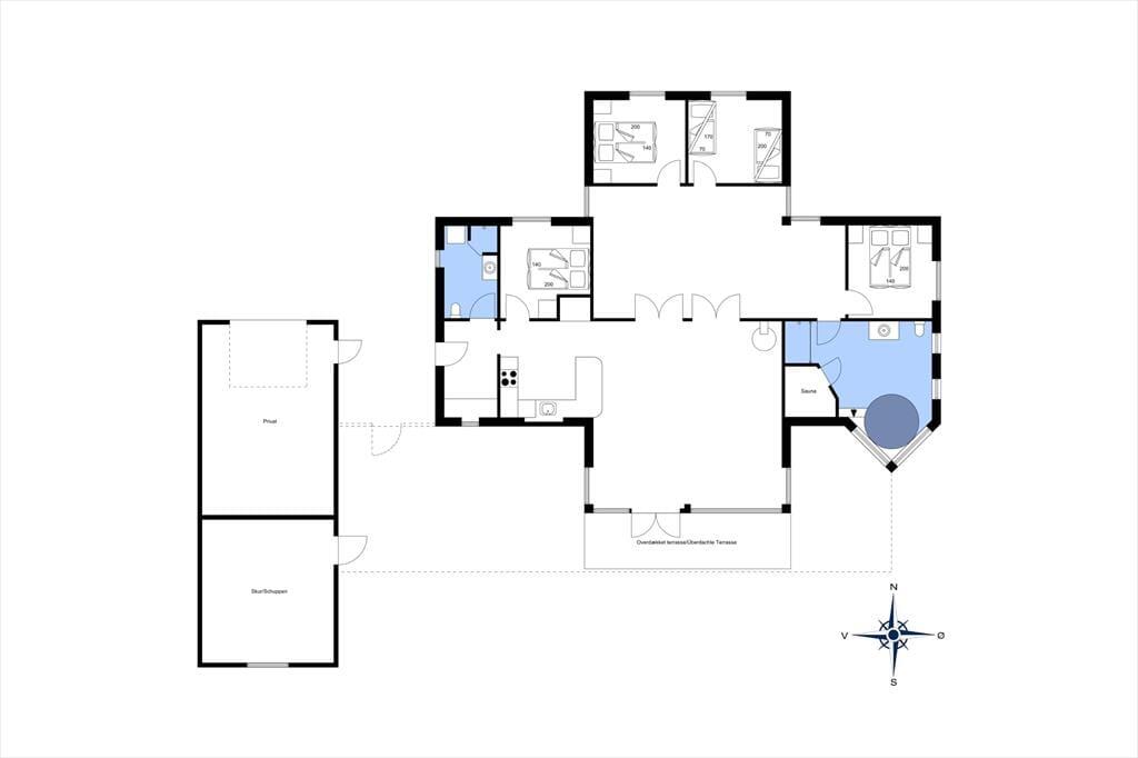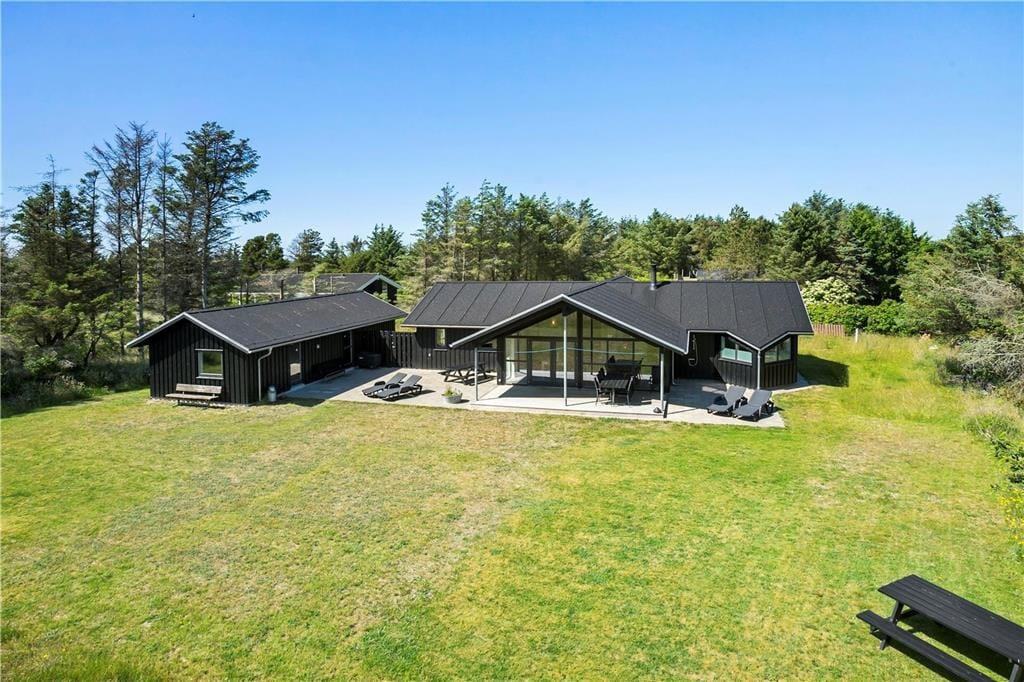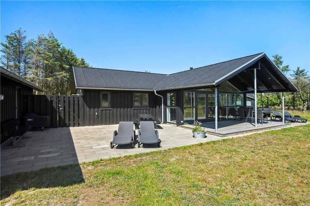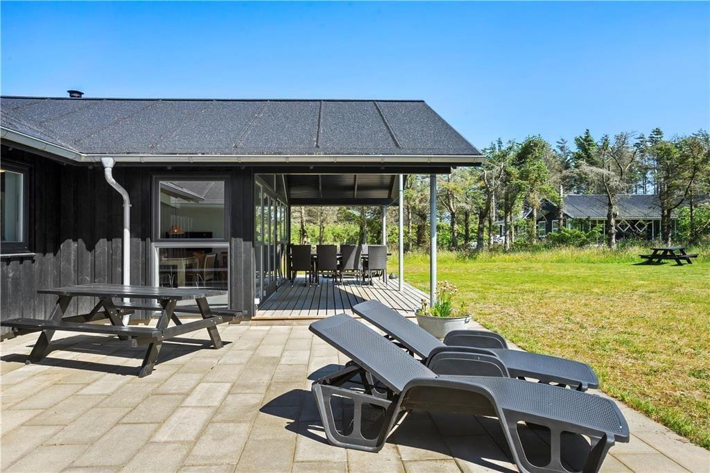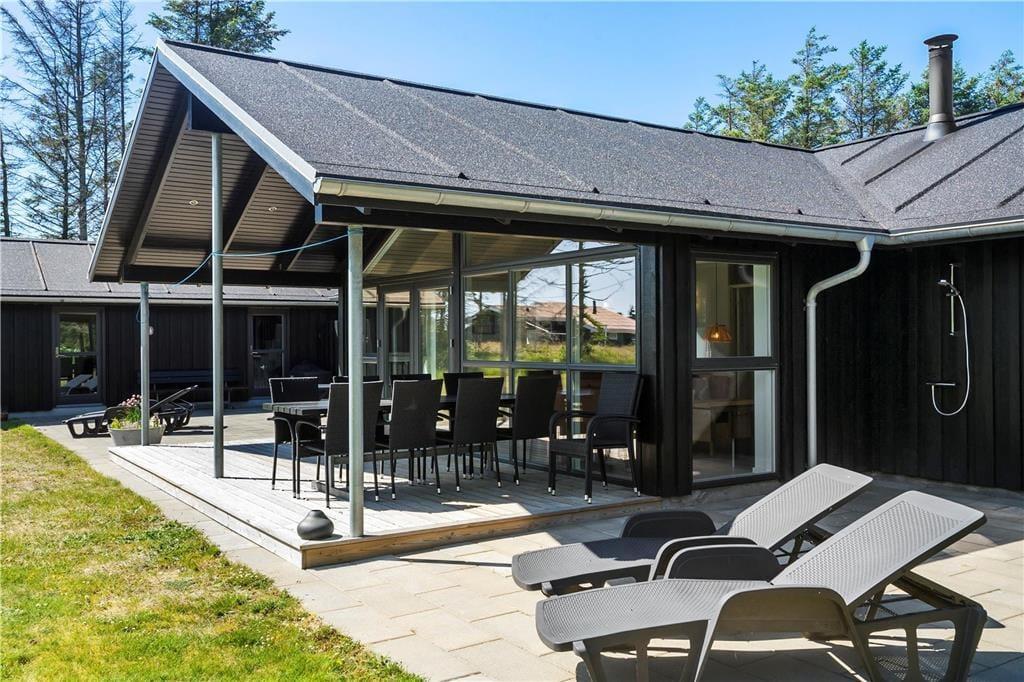 Wenn die Sonne hoch über Grønhøj steht, werden Sie wahrscheinlich Lust haben, das Leben auf den schönen Terrassen des Ferienhauses zu verlagern. Diese erstrecken sich in den hinteren Garten auf der Südseite des Hauses, und es gibt sowohl offene als auch überdachte Bereiche, sodass Sie Ihre Liegestühle sowohl in der Sonne als auch im Schatten aufstellen können. Im abgeschirmten Garten gibt es viel Platz zum Spielen und für Gartenspiele auf dem Rasen, und wenn es nach den körperlichen Aktivitäten heiß wird, können Sie sich unter der Außendusche erfrischen.