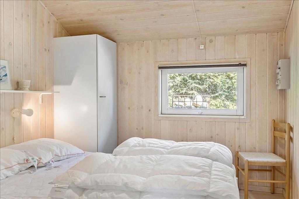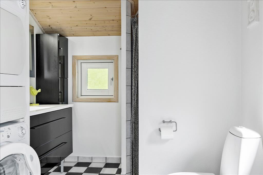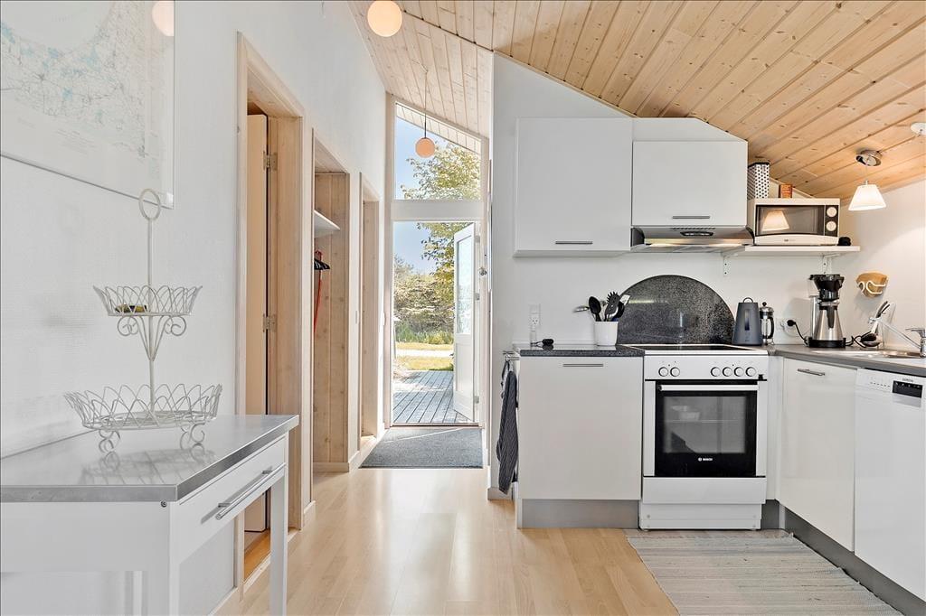 Das Haus strahlt eine wunderbare Atmosphäre von Urlaub und Entspannung aus und ist im klassischen Ferienhausstil mit schwarzen Holzfassaden und weißen Fensterrahmen gehalten. Innen ist es hell und stilvoll mit einem Dach bis zum First und großen Fenstern, die die grüne Umgebung direkt ins Wohnzimmer bringen. Es gibt Holz auf den Böden, Wänden und Decken, was zur „richtigen“ Ferienhausatmosphäre beiträgt. Das Herz des Hauses ist der große Wohnbereich mit offener Verbindung zwischen Küche und Wohnzimmer. Ein besonderes Highlight in diesem Haus ist der Essbereich mit einer zusätzlichen Theke, an der man ein Glas Wein genießen kann, während das Essen auf dem Herd köchelt. Das Haus verfügt über drei Schlafzimmer – zwei mit Doppelbetten und eines mit Schlafsofa. Schließlich gibt es ein Badezimmer mit Waschmöglichkeiten.