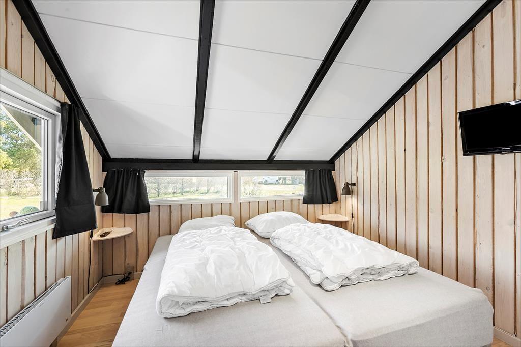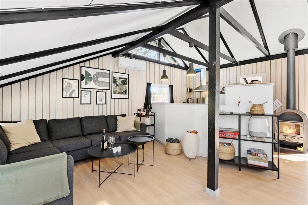 An dieser Adresse befindet sich ein 72 m² großes Holzferienhaus, das 1977 erbaut und später modernisiert wurde, sodass es gepflegt und einladend wirkt. Es gibt drei Schlafzimmer im Inneren, und zusätzlich bietet der Grundriss ein funktional eingerichtetes Badezimmer und ein schönes Wohnzimmer mit integrierter Küche. Im Wohnzimmer befinden sich ein Kamin und eine Wärmepumpe, und die vielen Fenster sorgen für gutes Licht – besonders am Ende des Tages, wenn die Sonne durch das große westlich ausgerichtete Fenster strahlt.
