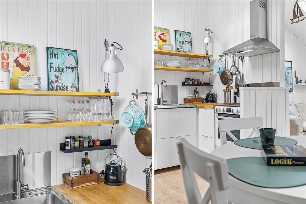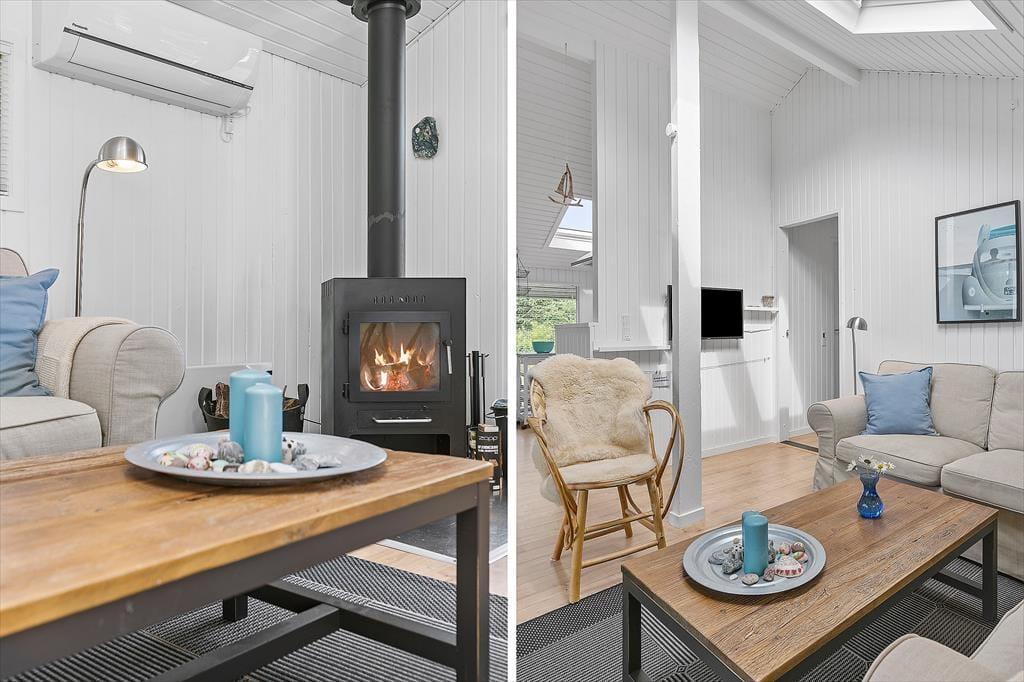 Die Atmosphäre im Inneren des Ferienhauses ist leicht und luftig, es misst 64 m² und hat einen hervorragenden Grundriss für vier Personen. Sie haben auch die Möglichkeit, im Alkoven des Wohnzimmers zu schlafen, und wenn nicht, eignet er sich perfekt für ein schnelles Nickerchen oder einen Nachmittag mit einem spannenden Roman. Das Wohnzimmer bietet außerdem eine gemütliche Sofaecke in der Nähe des Kaminofens und einen Esstisch, der praktisch neben der schönen offenen Küche steht. Der helle und funktionale Einrichtungsstil zieht sich auch durch das Badezimmer, das über eine Dusche und eine Waschmaschine verfügt.