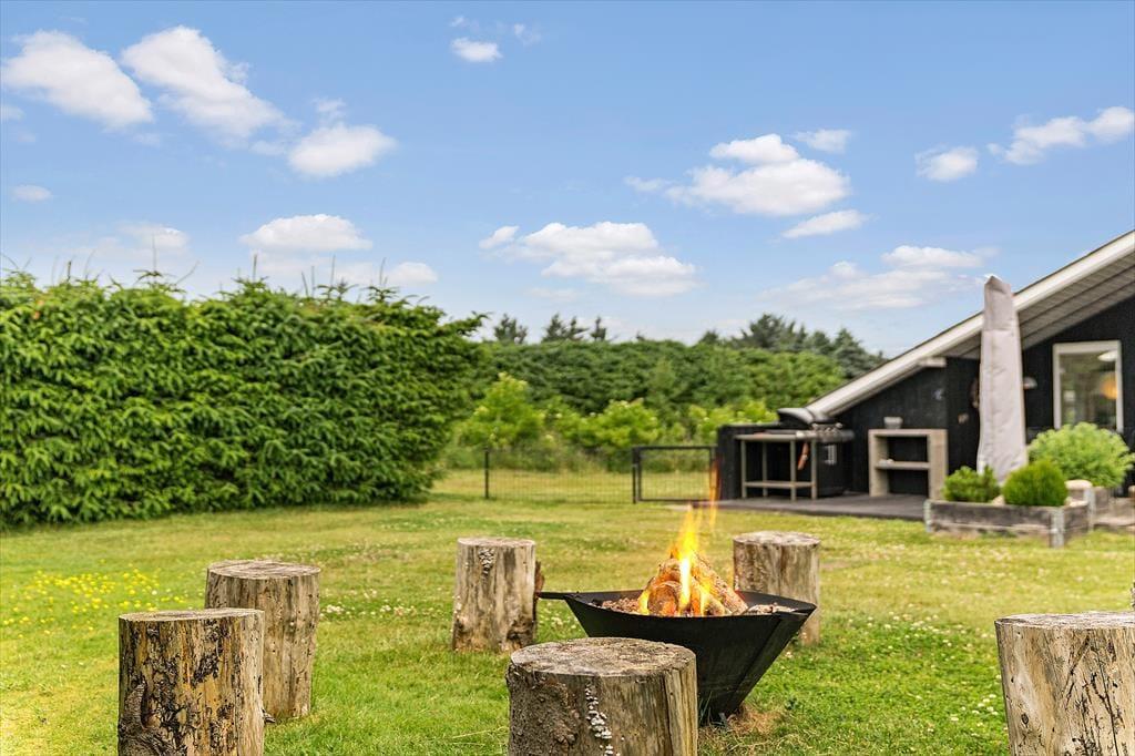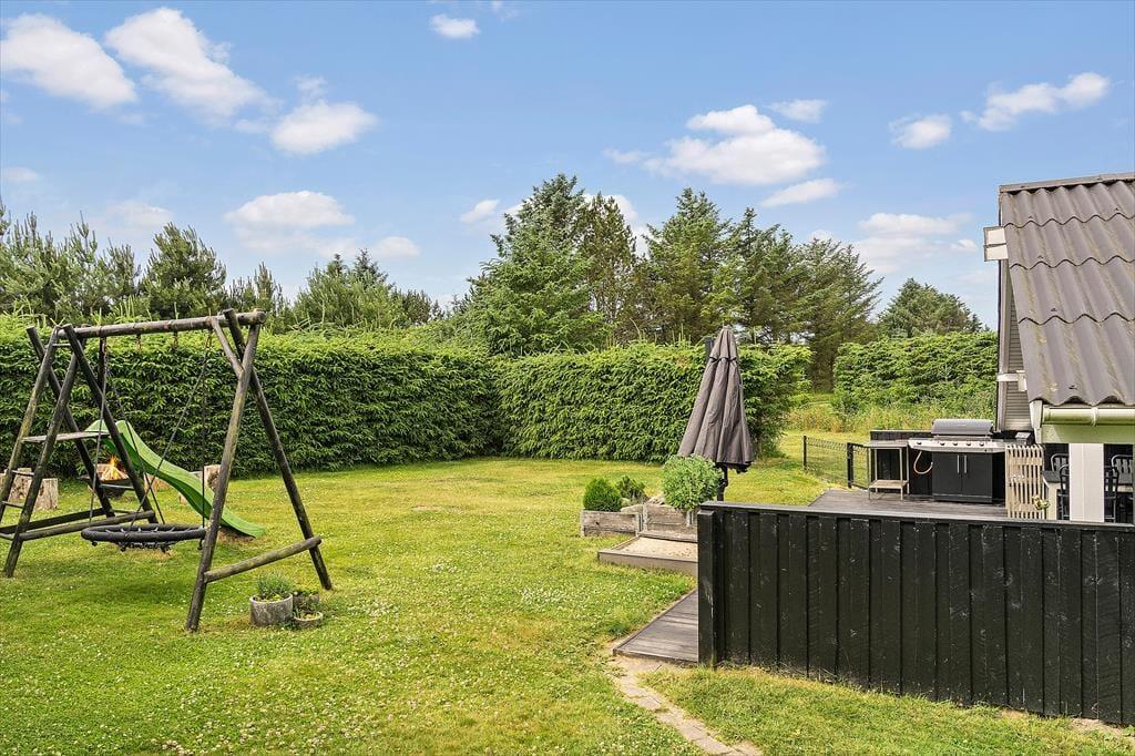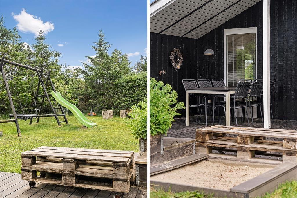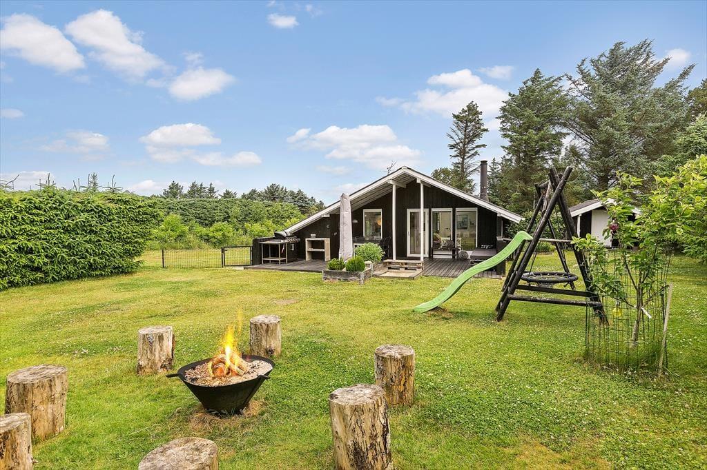Das 1261 m² große Grundstück ist ein Paradies für Familien mit Kindern, denn die Umgebung ist grün und ungestört, und es gibt etwas für Jung und Alt. Die jüngsten Urlauber werden sich sicher über die Sinnes-Schaukel, die Rutsche und die Sandkiste freuen, während vielleicht vor allem die Erwachsenen es genießen werden, dass die nach Süden ausgerichtete Terrasse direkt neben den Spielmöglichkeiten liegt. Der Rasen lädt zu Ballspielen und Gartenspielen ein, und am Ende des Tages kann sich die ganze Familie rund um das Lagerfeuer versammeln, um Marshmallows zu rösten und Abenteuergeschichten zu erzählen.