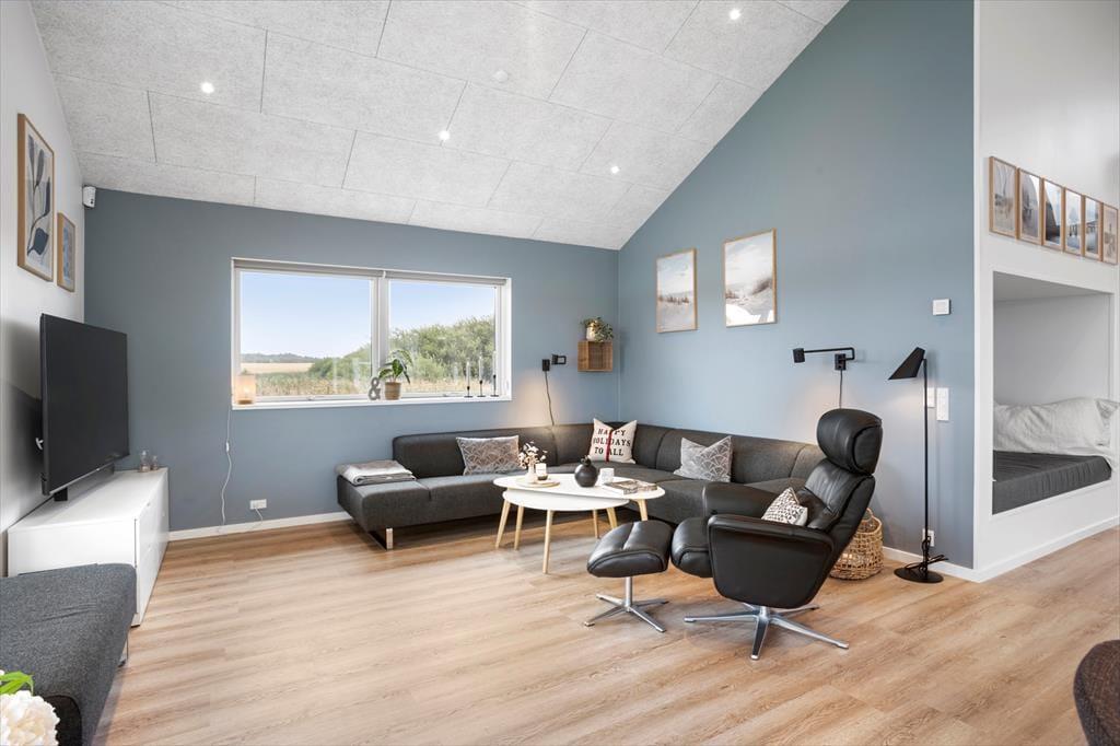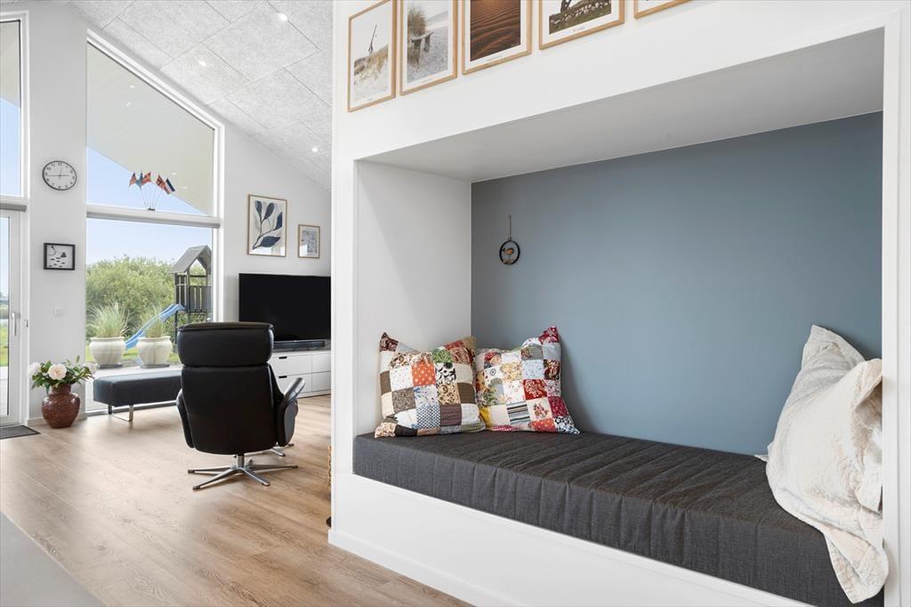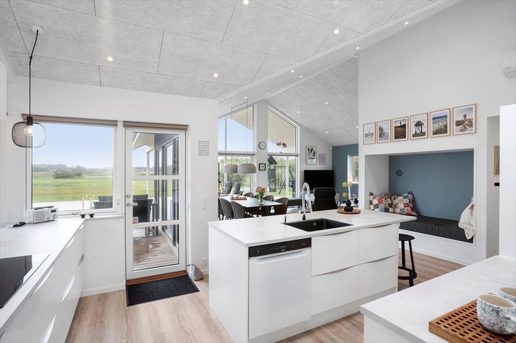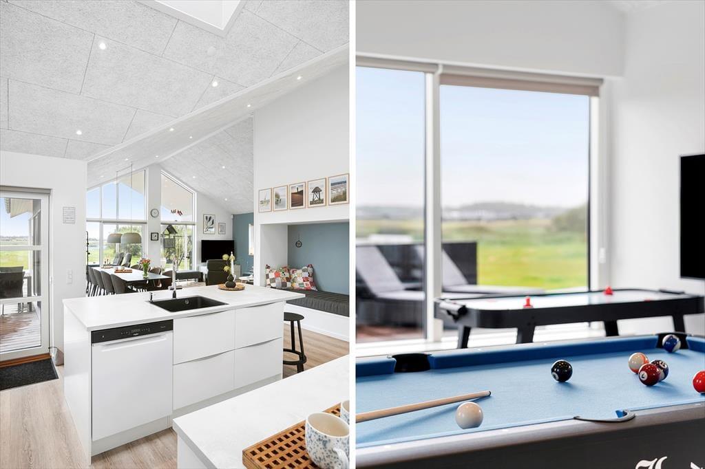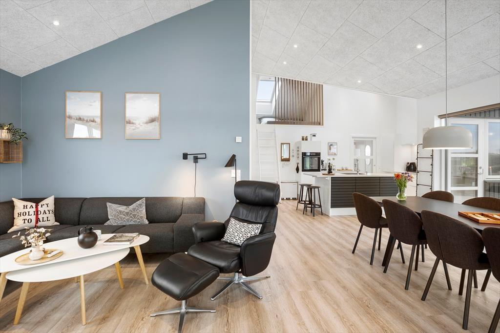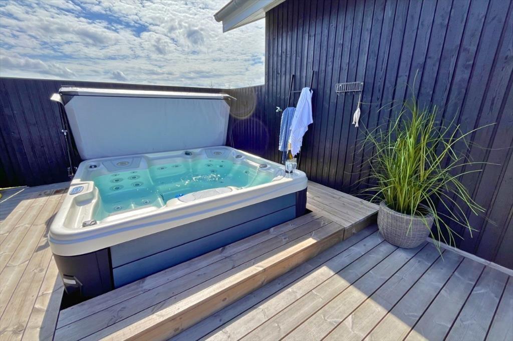 Dieses fantastische Ferienhaus strahlt Stil und Komfort aus, mit einer Raumaufteilung, die sowohl Gemeinschaft als auch Privatsphäre bietet. Die hellen und geräumigen Wohnzimmer sind in einem modernen nordischen Stil eingerichtet, bei dem große Fensterfronten das Licht der Natur ins Haus holen. Das Wohnzimmer öffnet sich zu einer überdachten Terrasse, die das Ferienhaus nach draußen verlängert und zu gemütlichen Stunden unter freiem Himmel einlädt – auch wenn der Tau fällt. Das Haus verfügt über drei gut ausgestattete Badezimmer, von denen eines ein Innen-Spa bietet, das nach einem erlebnisreichen Tag zur Entspannung einlädt. Mit vier guten Schlafzimmern und einem Hängeboden, der perfekt für die Kinder ist, gibt es reichlich Platz für die ganze Familie. Die Alkoven bieten zusätzliche gemütliche Ecken, in die du dich mit einem guten Buch oder für ein Nickerchen zurückziehen kannst.