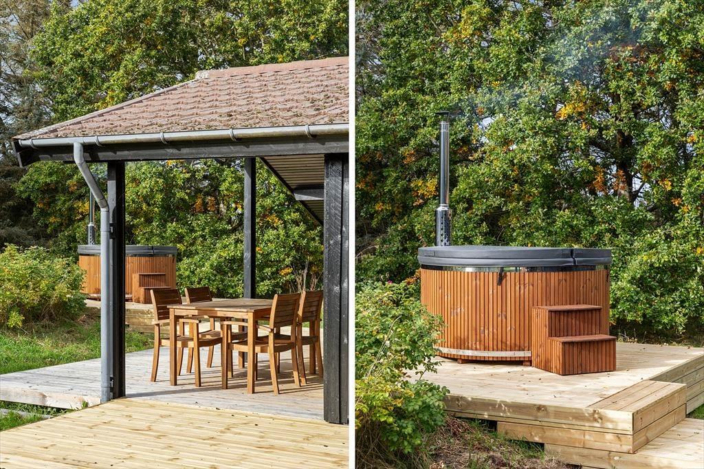 Das hügelige Grundstück des Ferienhauses bietet Platz für Spiel und Erholung zugleich. Hier können Ballspiele, Verstecken und andere Aktivitäten frei entfaltet werden, während die Terrasse zum Sonnenbaden, Abendessen im Freien oder zu stillen Momenten mit einem guten Buch einlädt. Die große Terrasse ist ideal, um Sonne, Schatten oder Windschutz zu finden – je nachdem, was der Tag bringt – und hier könnt ihr das Ferienleben in eurem eigenen Tempo genießen. Das Wildnisbad im Freien verleiht dem Aufenthalt eine zusätzliche Dimension, wenn warme Blasen und der Duft frischer Luft pure Urlaubsfreude schaffen. Hier ist Platz für Gemeinschaft, Entspannung und Spiel zugleich – eine seltene Kombination, die dieses Ferienhaus zu etwas ganz Besonderem macht.