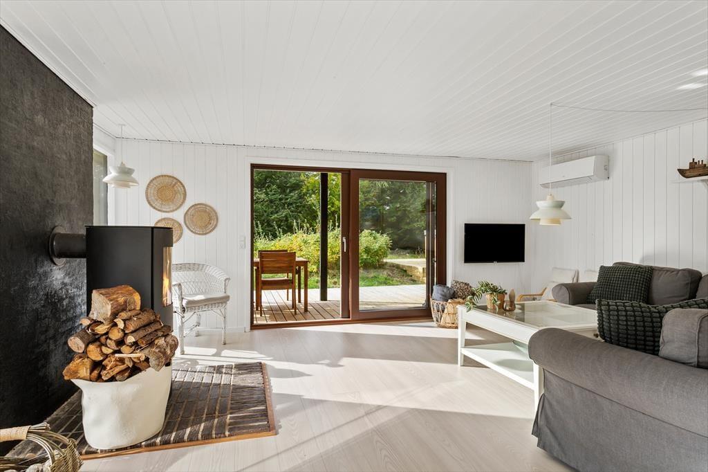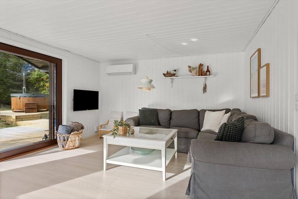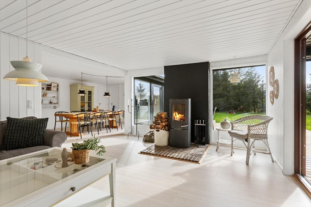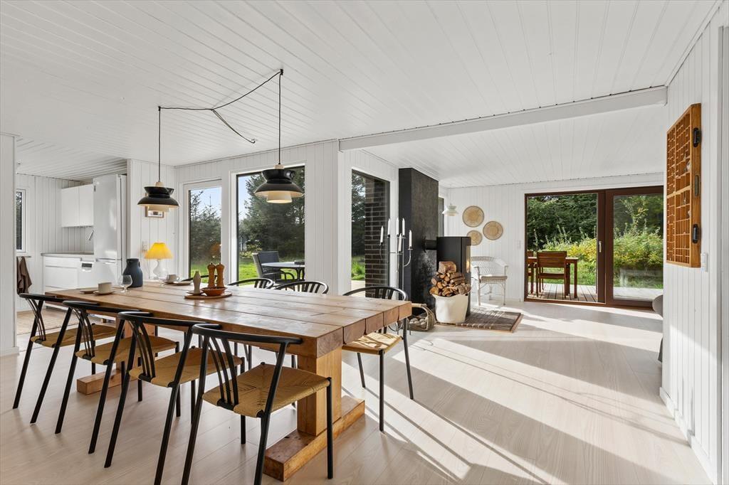 Das Ferienhaus beeindruckt mit einem geräumigen und hellen Wohnzimmer, in dem große Fenster das Tageslicht hereinlassen und eine warme, einladende Atmosphäre schaffen. Hier kann sich die Familie zu gemütlichen Momenten versammeln oder den Blick auf das hügelige Grundstück genießen, auf dem die Kinder spielen und sich austoben können. Die großzügige Küche macht es einfach, Mahlzeiten zuzubereiten, während die Unterhaltung am Esstisch weitergeht. Das Haus verfügt über vier Schlafzimmer, die alle mit Blick auf Komfort und Entspannung eingerichtet sind, und das Badezimmer mit Fußbodenheizung sorgt dafür, dass selbst kühle Morgen angenehm sind. Das Wildnisbad ist das i-Tüpfelchen, wo ihr Körper und Seele unter dem Sternenhimmel eins werden lassen könnt.