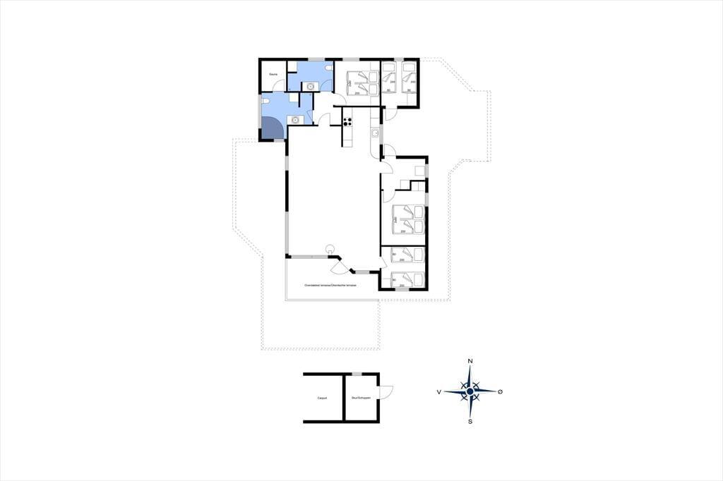 Das Ferienhaus liegt auf einem großen, ungestörten Rasenstück mit Platz zum Spielen, Laufen und Ballspielen. Das Haus ist von schönen, großen Terrassen auf drei Seiten – nach Süden, Osten und Westen – umgeben, wo man die Sommersonne und Wärme genießen kann. Die Terrasse im Süden hat einen kleinen überdachten Bereich. Vom Eingangsbereich aus gelangt man auch zur nach Osten ausgerichteten Terrasse und zum 4. Schlafzimmer.