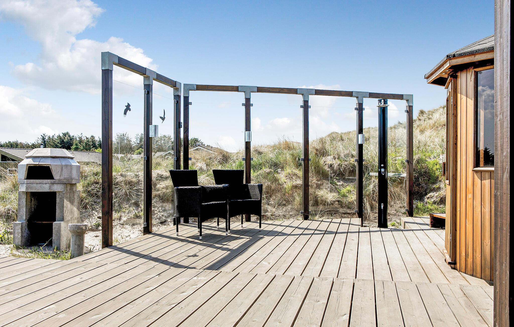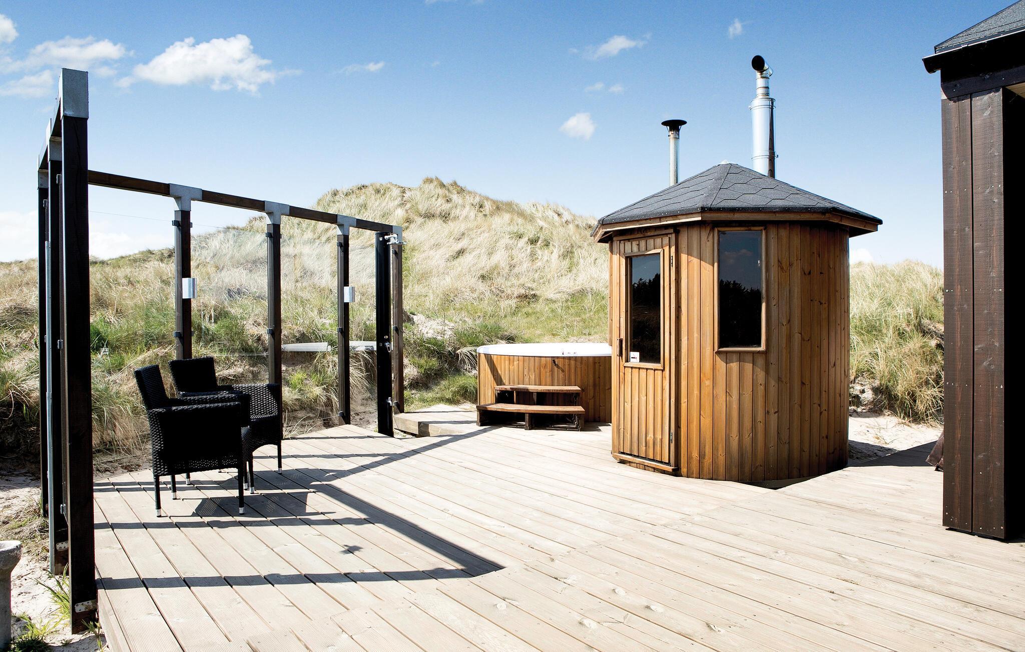Auf einem sehr großen Dünengrundstück und mit Aussicht auf eine offene Landschaft erwartet Sie dieses phantastische Ferienhaus. Die Terrasse auf mehreren Seiten des Hauses liegt teilweise unter Dach. Vor dem Haus gibt es auch ein beheiztes Bad, das Sie das ganze Jahr über genießen können. Auch haben Sie eine schöne Sauna und eine Dusche im Freien. Zentral im Haus ist die Küche platziert. Große Fenster im angrenzenden Wohnbereich lassen Sie den Garten hautnah erleben. Ein schönes Ferienhaus für einen Urlaub zum Genießen und die Nordsee liegt auch im Gehabstand vom Ferienhaus.