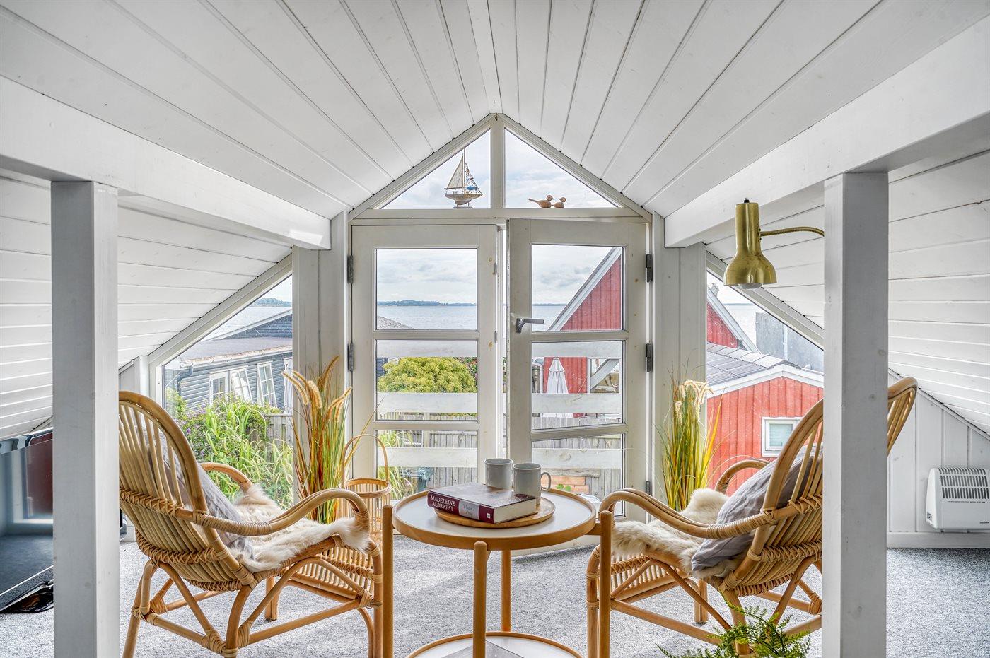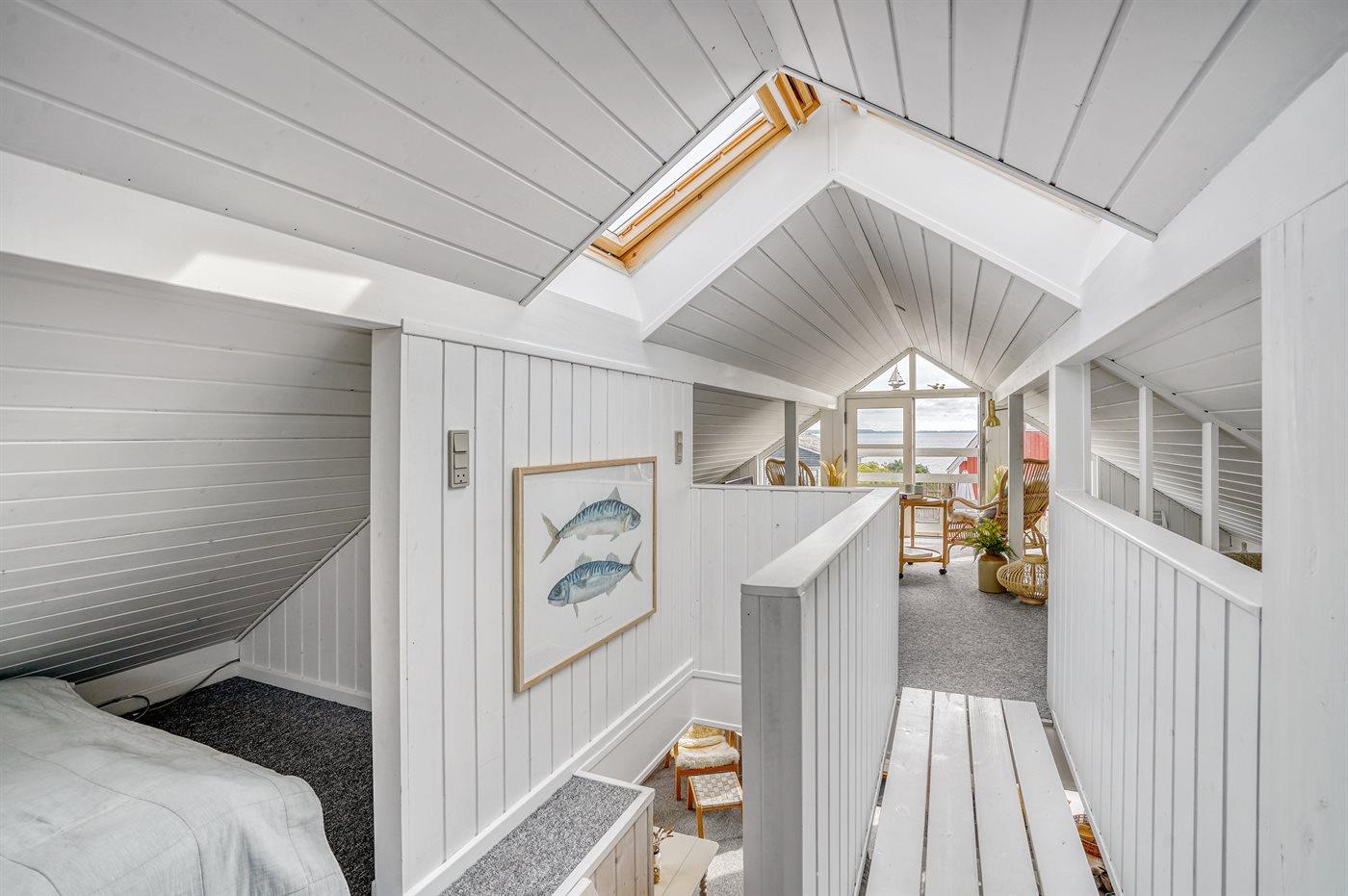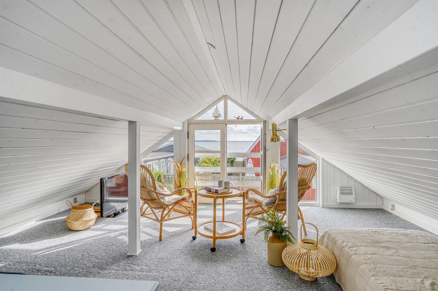Von dem gemütlichen und einladenden Obergeschoss aus hast du einen schönen Meerblick. Hier können vier Personen schlafen – die Schlafplätze verteilen sich auf zwei alkovenartige Schlafbereiche mit guten Matratzen auf Rädern, die sich ganz nach Bedarf leicht umstellen lassen.