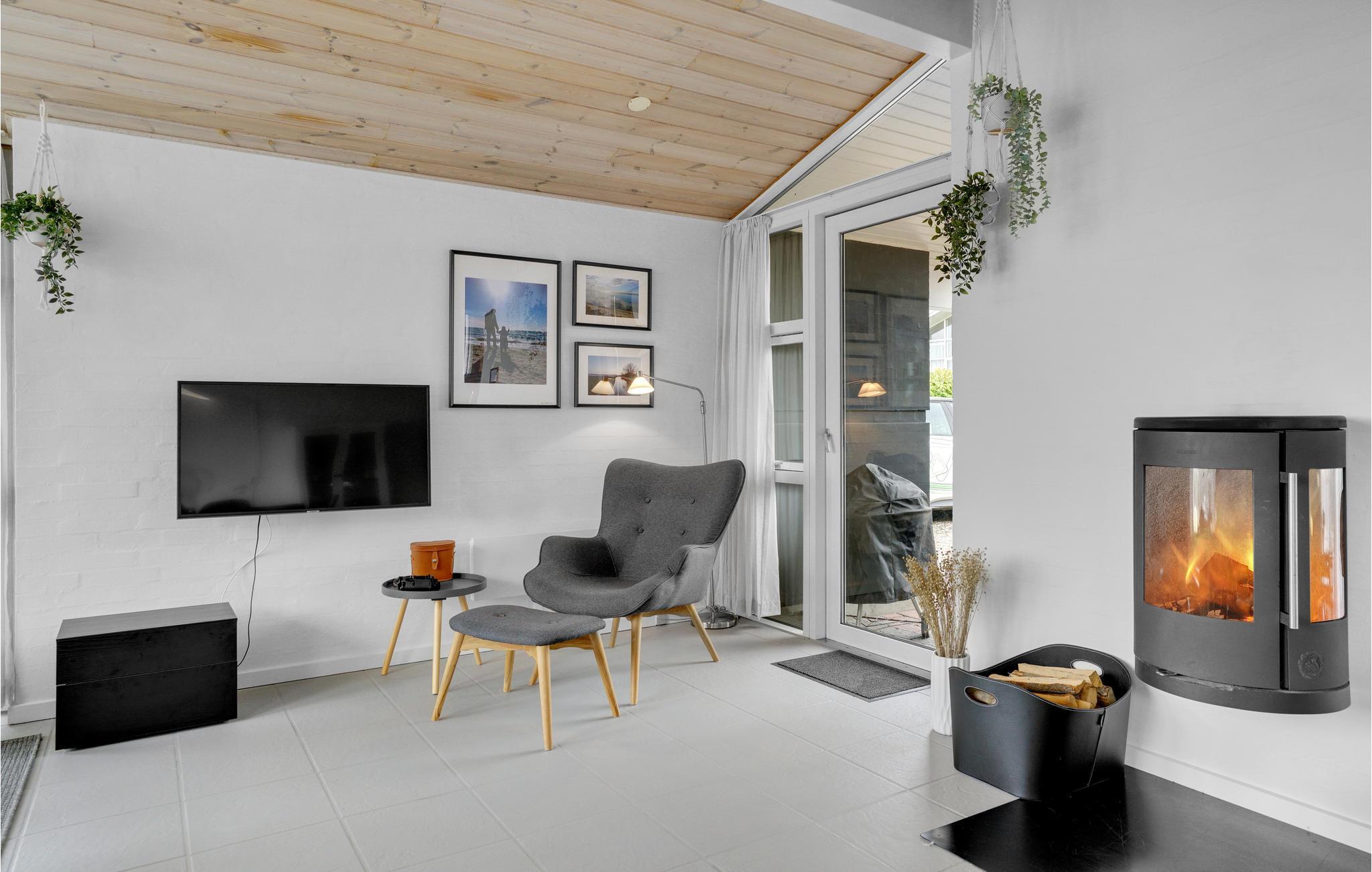 Modernes Ferienhaus mit Meerblick, Kaminofen und großem Garten in Dänemark für entspannte Urlaubstage.
