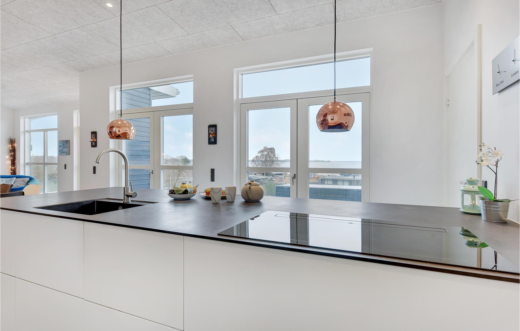 Genießen Sie die Panoramaaussicht auf den KLeinen Belt von diesem luxuriös und modern eingerichteten Ferienhaus. Es liegt hoch platziert am Grønninghoved Strand und bietet Ihnen eine schöne Aussicht auf das Wasser. Das Haus auf zwei Ebenen hat ein helles Wohnzimmer, offen zur Küche und große Panoramafester sorgen für ein lichtdurchflutetes Ambiente. Über zwei Treppen kommen Sie in drei Schlafzimmer und ein großes Spielzimmer mit Billard, Tischfußball und TV. Sie werden von der schönen Aussicht hingerückt sein, die Terrasse werden Sie während Ihres Auftenthaltes hier kaum velassen wollen. Da es bei dieser Unterkunft zum Haus und im Haus viele Treppen gibt, ist es führ Gehbehinderte nicht geeignet.